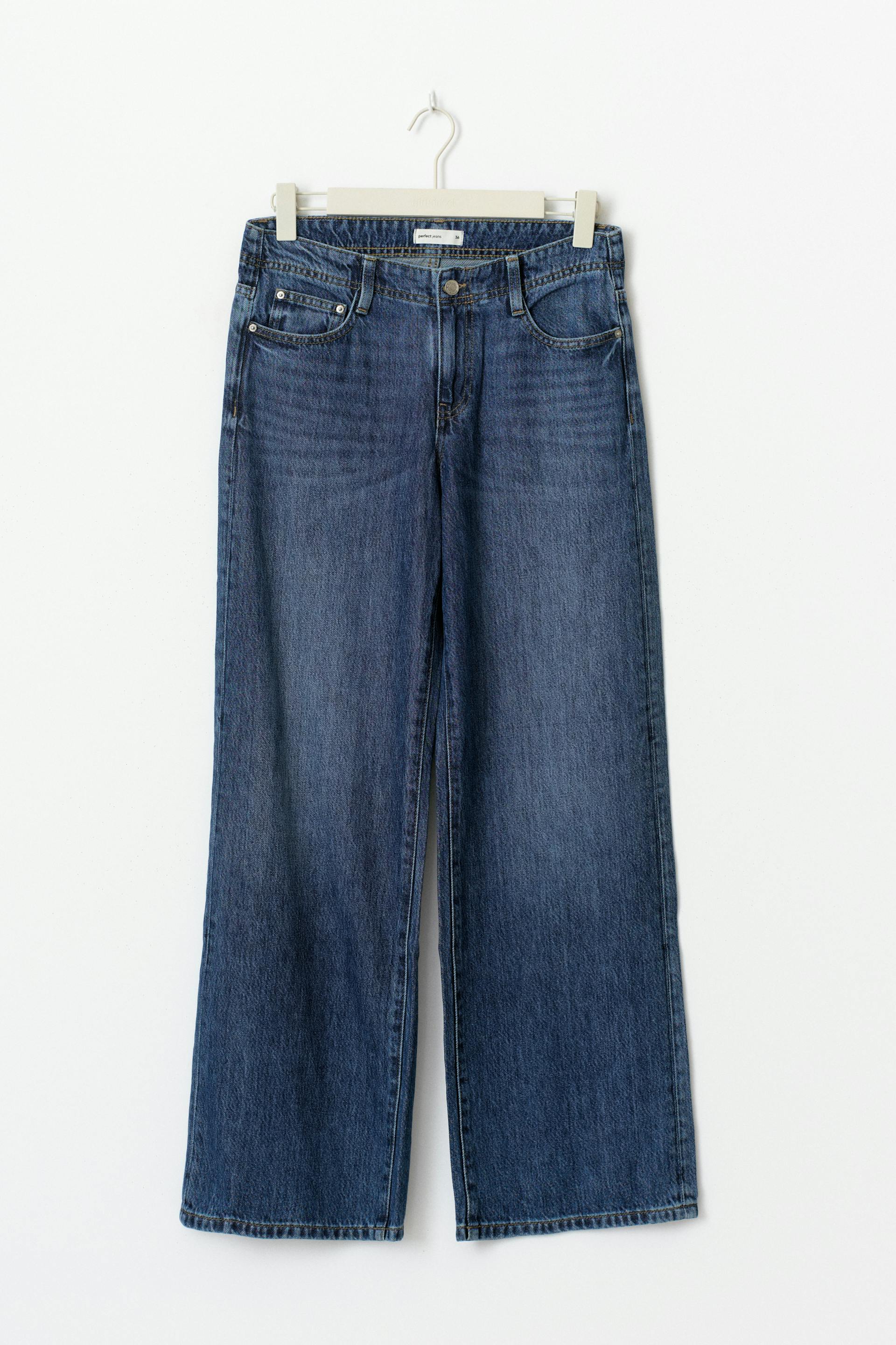 Zierliche Jeans mit tiefer Taille aus nicht dehnbarem Denim. Die Jeans ist blau und hat breite Beine mit voller Länge. Sie hat Reißverschluss und Taschen vorne und hinten. Ideal bei einer Körpergröße bis 1,60 m. Benutze unsere Größentabelle, um deine Größe zu finden.