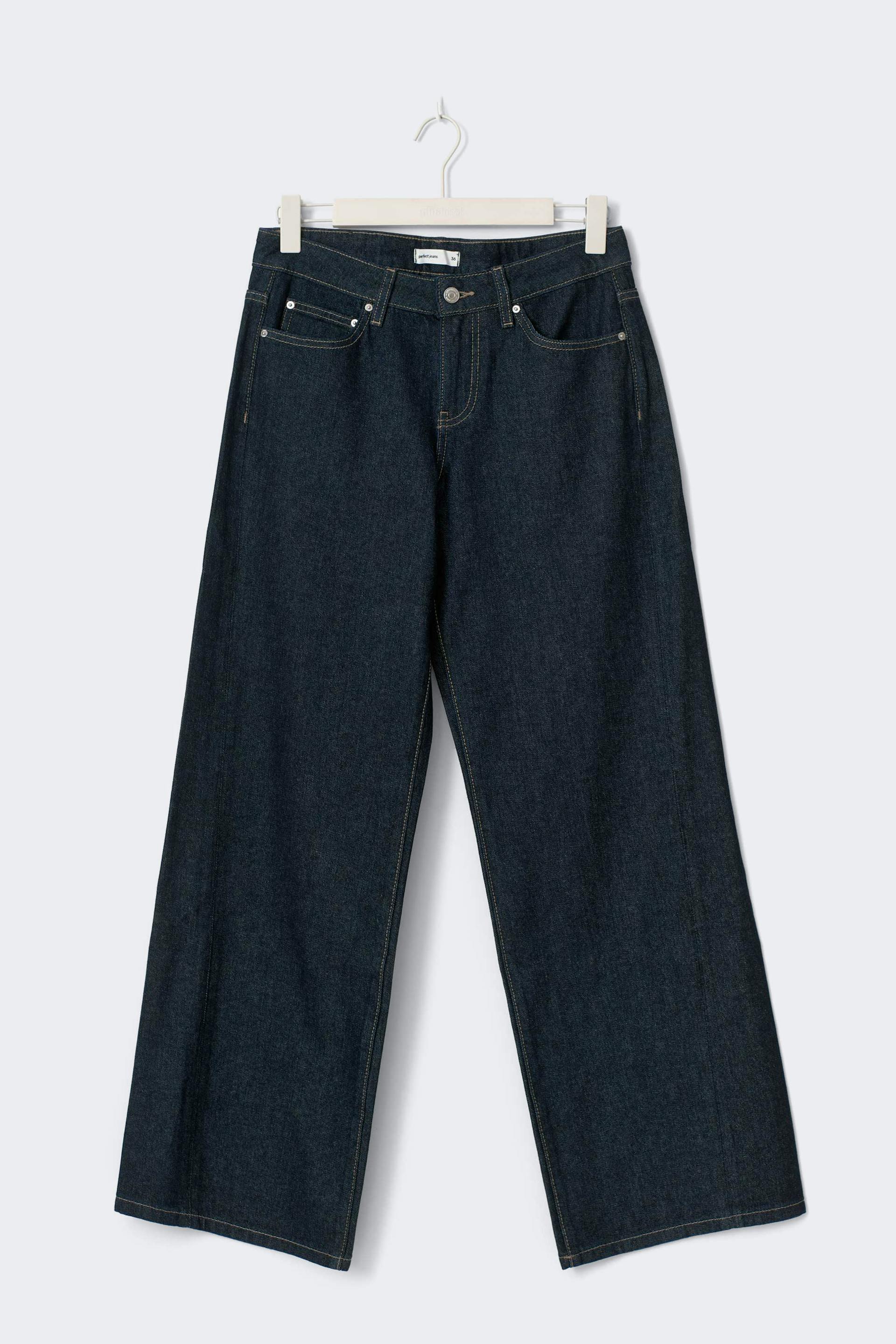 Tall Low Waist Jeans mit breiten Beinen. Die Jeans ist dunkelblau und hat gedrehte Säume. Sie hat Reißverschluss, Taschen vorne und hinten und Gürtelschlaufen. Ideal bei einer Körpergröße ab 1,75 m. Nicht dehnbar. Benutze unsere Größentabelle, um deine Größe zu finden.