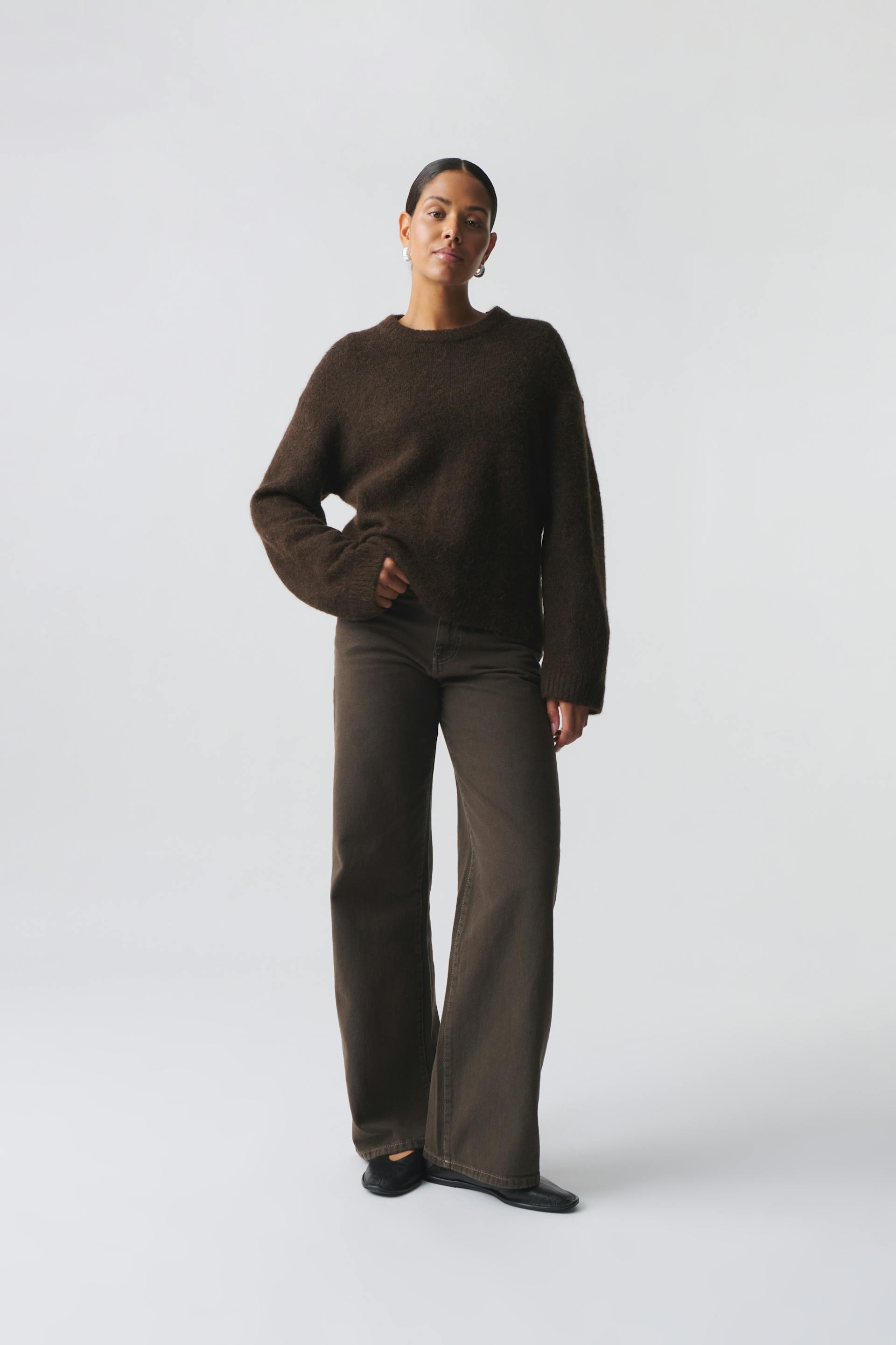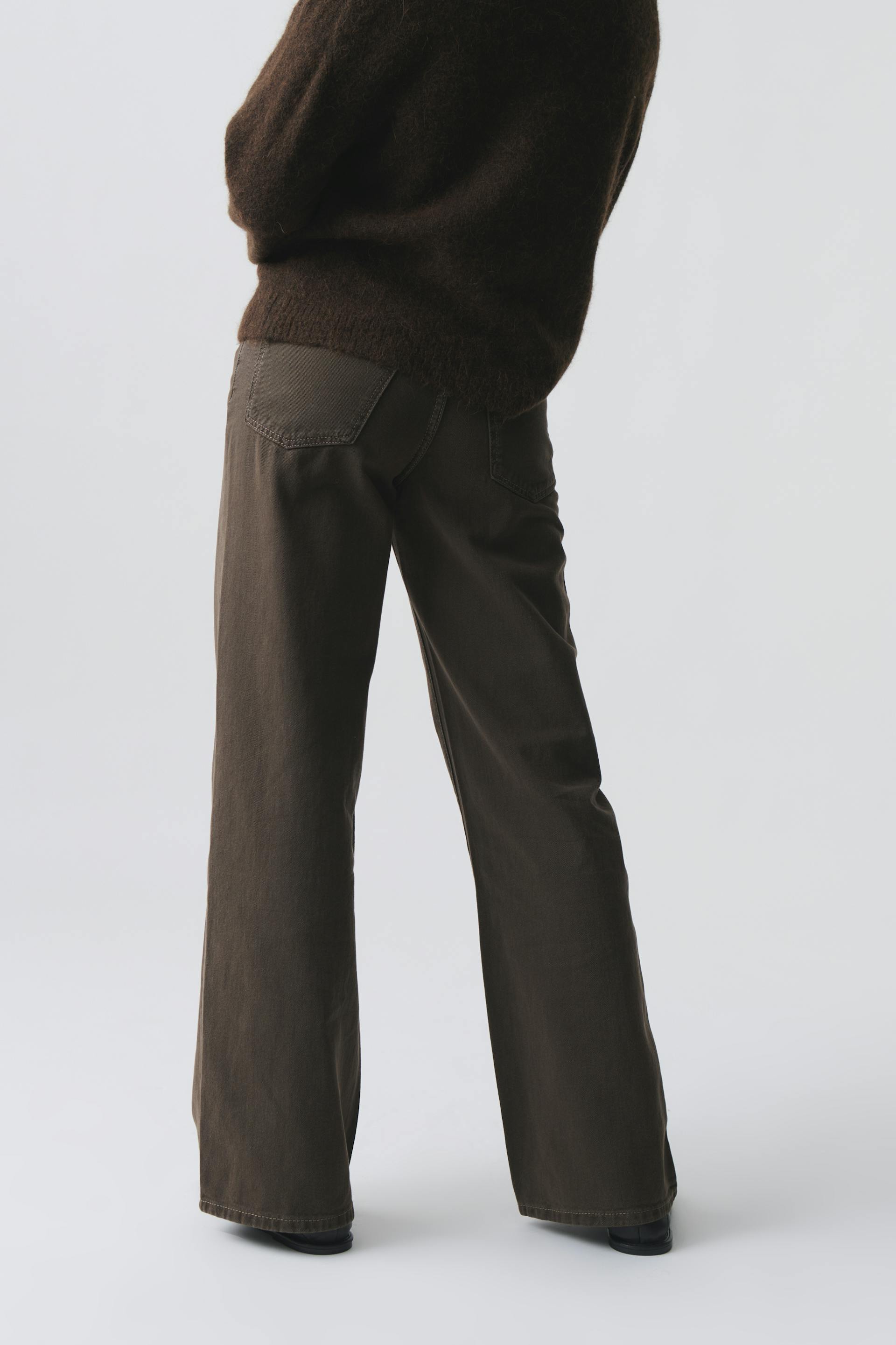 Weite Jeans mit mittlerer Taille aus nicht dehnbarem Denim. Die Jeans ist braun und hat breite Beine mit voller Länge. Sie hat Reißverschluss und Taschen vorne und hinten. Benutze unsere Größentabelle, um deine Größe zu finden.
