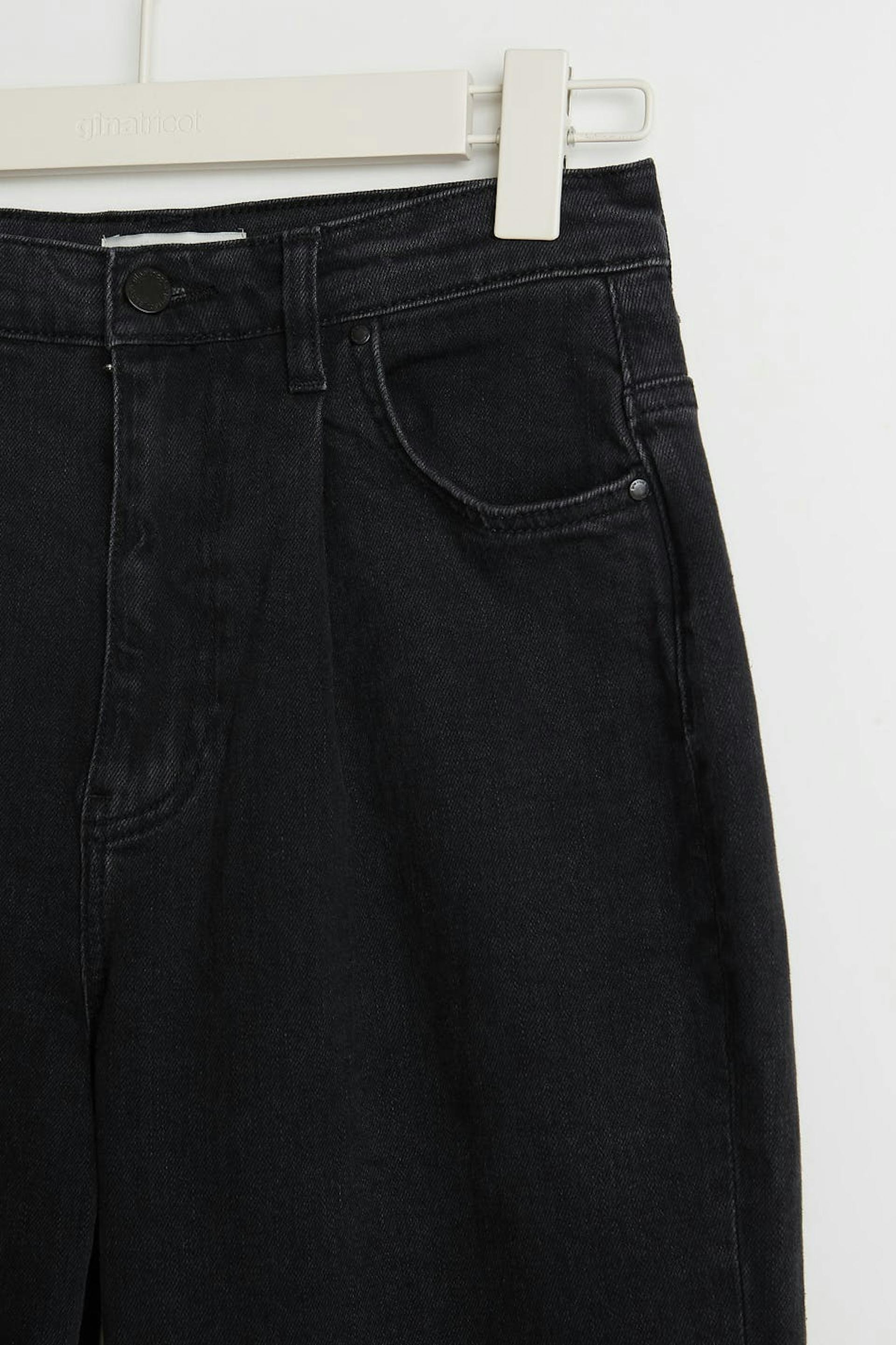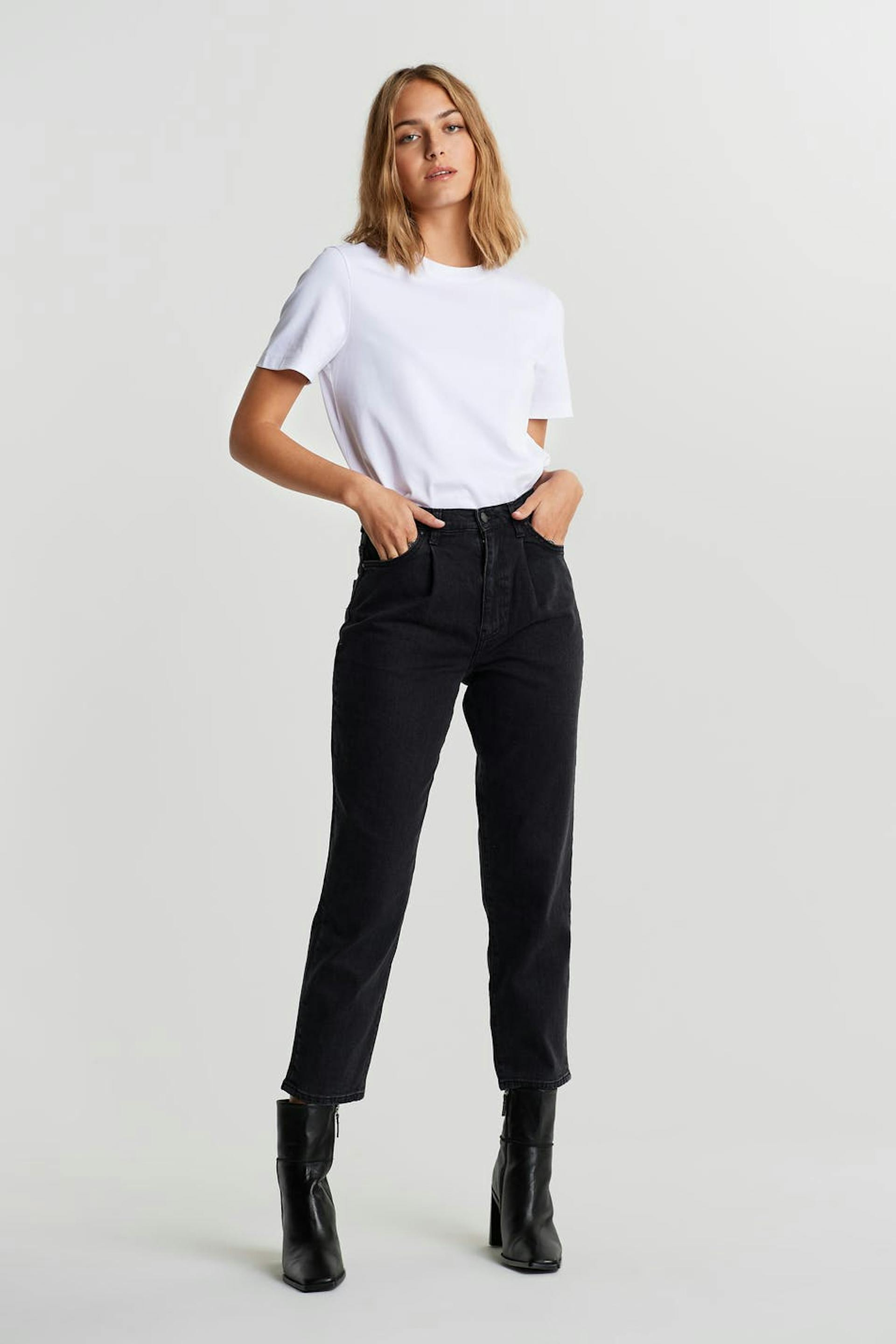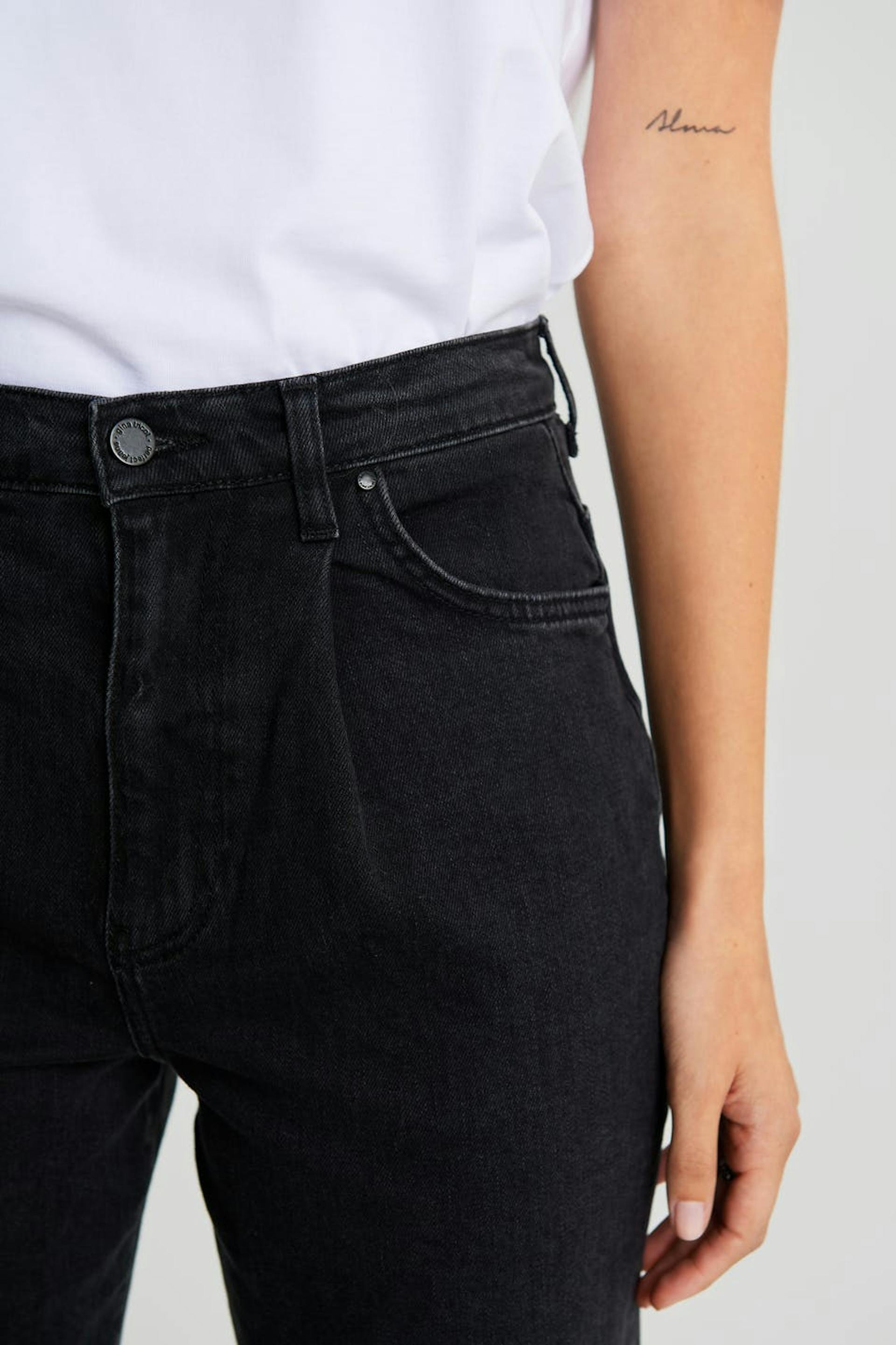Knöchellange Jeans mit einer normaler Passform. Die Jeans ist schwarz und hat Comfort Stretch. Sie hat einen hohen Bund und Falten-Details am Hosenbund.