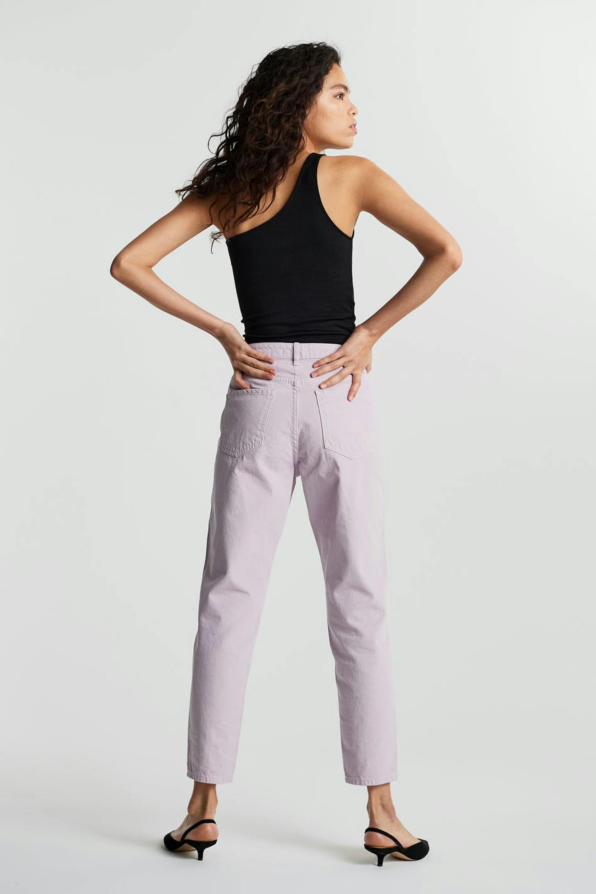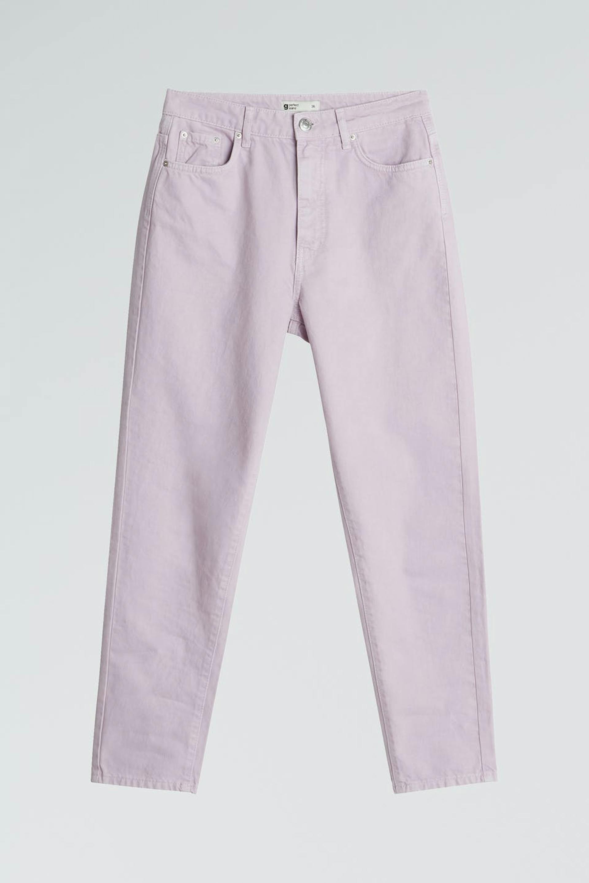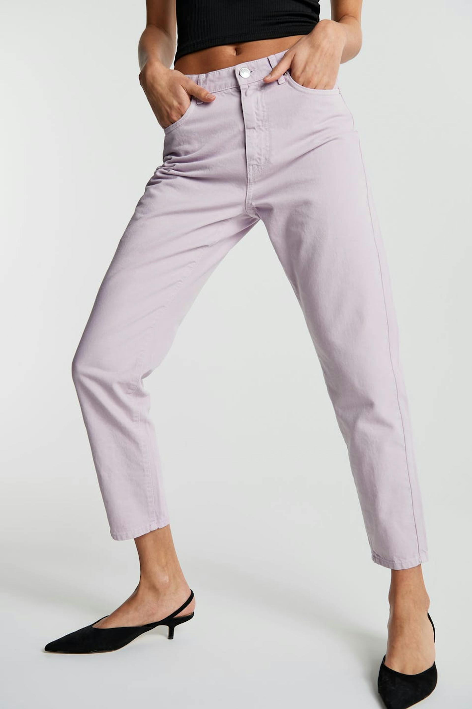 Nicht dehnbare Mom-Jeans mit einer normaler Passform. Die Jeans ist lila und hat einen hohen Bund. Sie hat eine entspannte Passform und konische Beine.