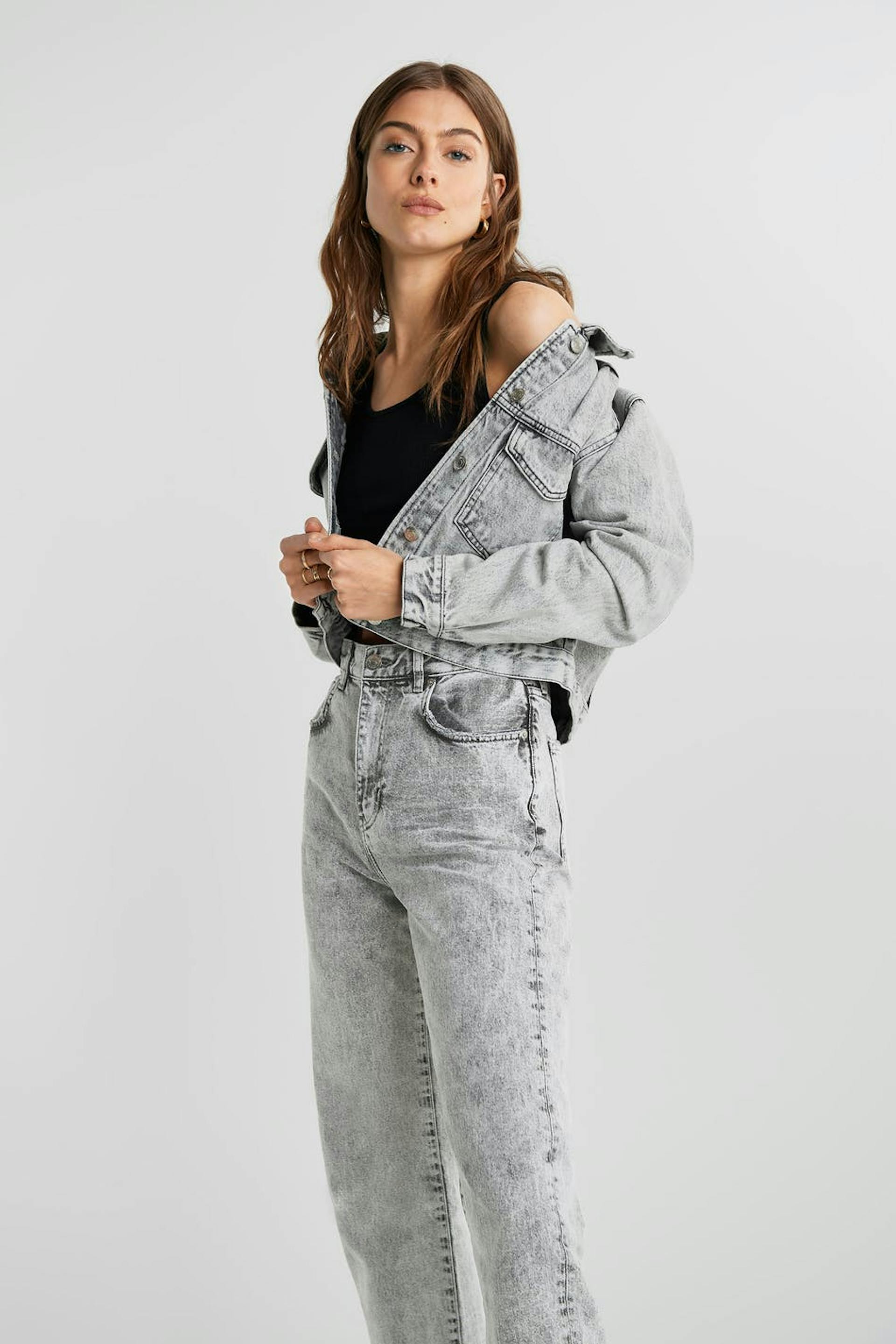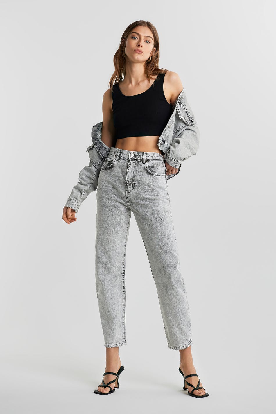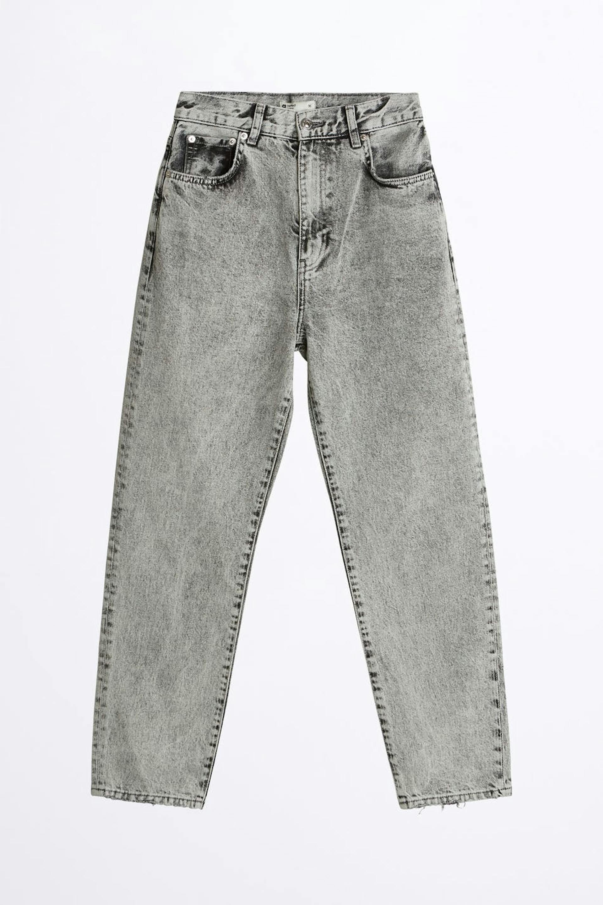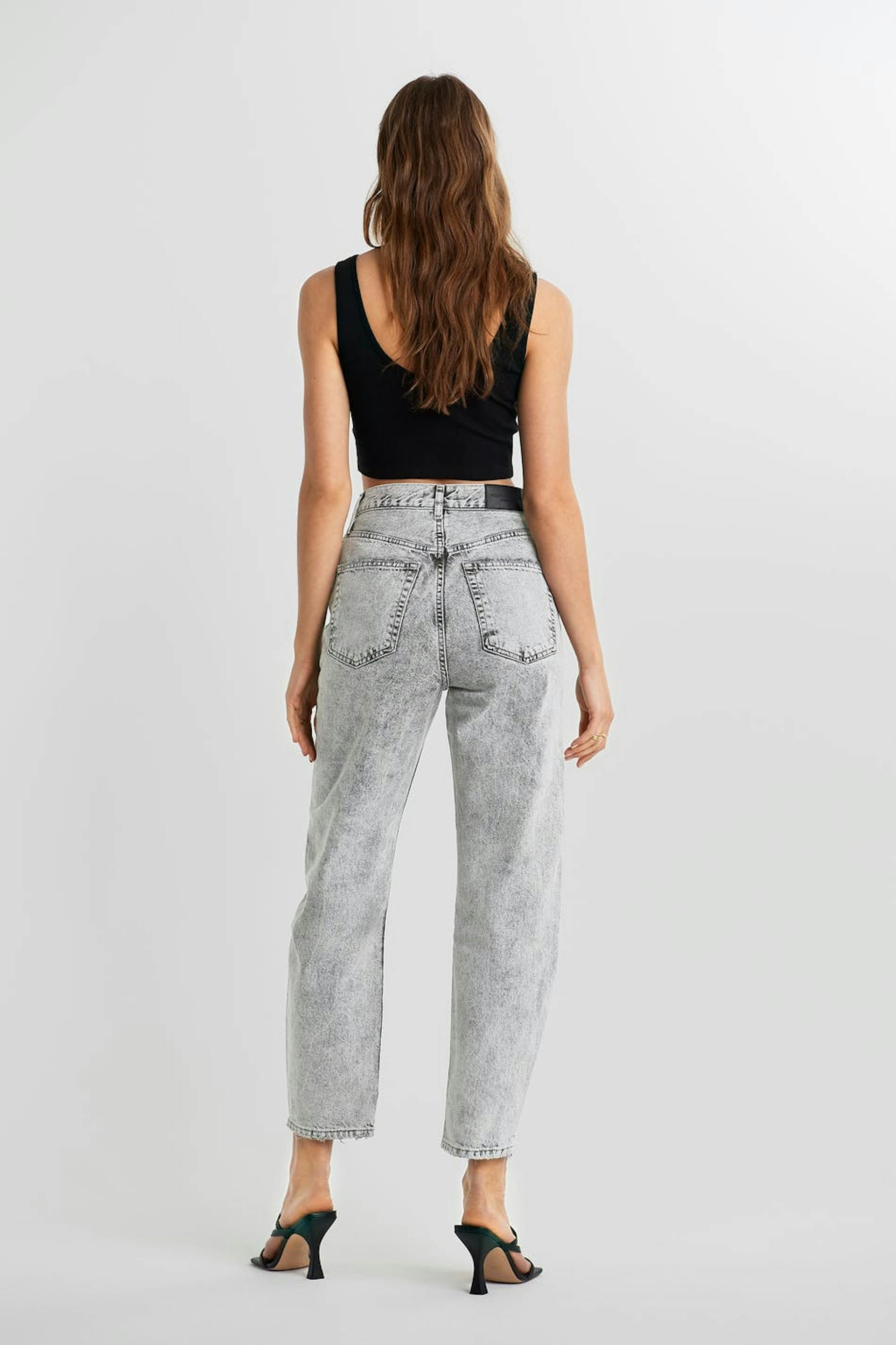 Knöchellange Mom-Jeans mit einer normaler Passform. Die Jeans sind hellgrau und haben konische Beine. Sie haben einen hohen Bund und eine lockere, weiche Passform.