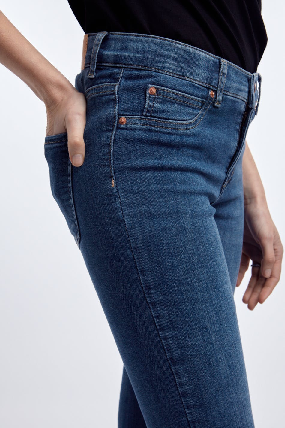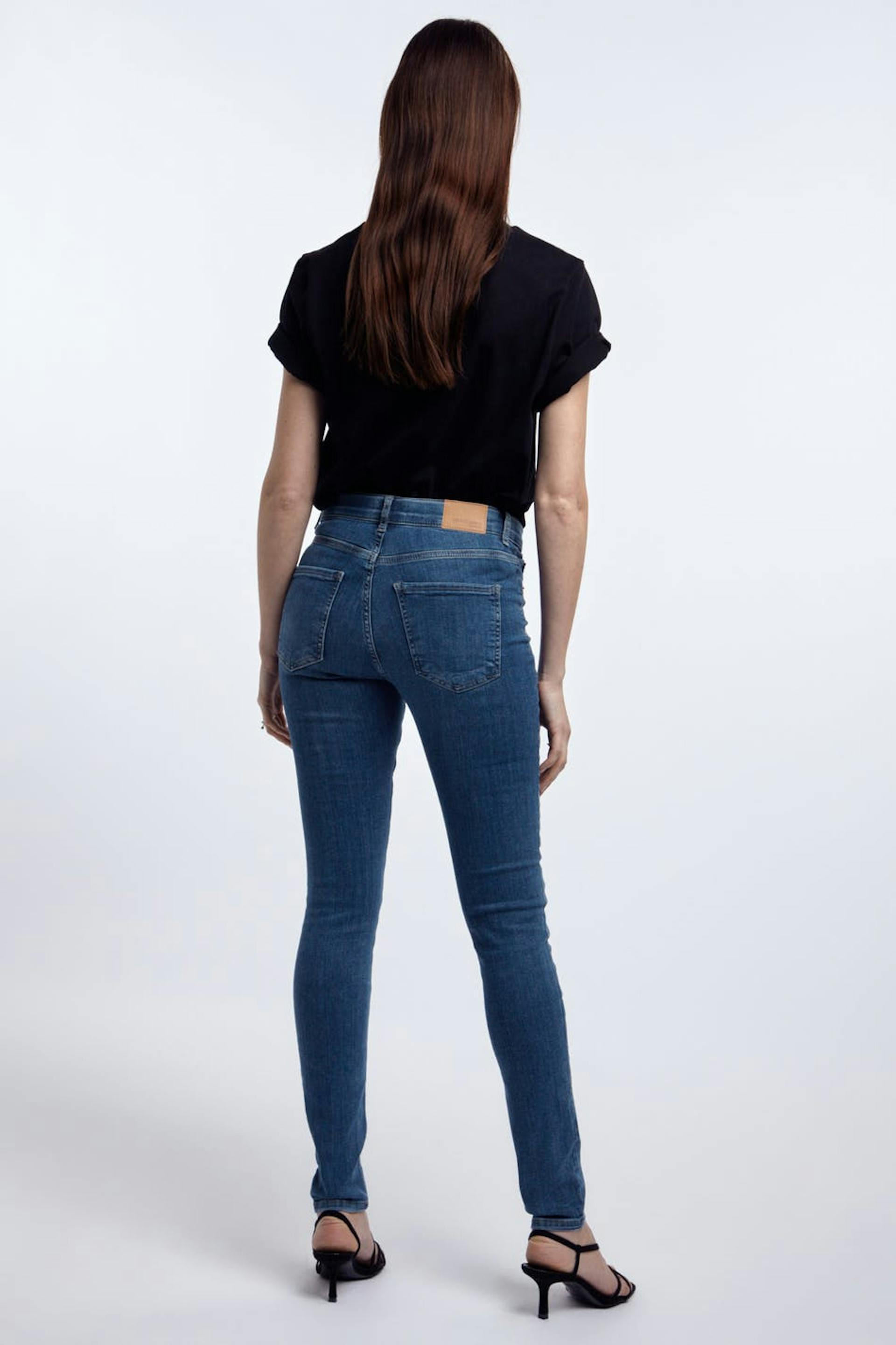 Superstretch Jeans mit einer taillierten Passform. Die Jeans sind dunkelblau und bequem und haben eine enge Passform. Sie haben eine tiefe Taille und falsche Taschen auf der Vorderseite.