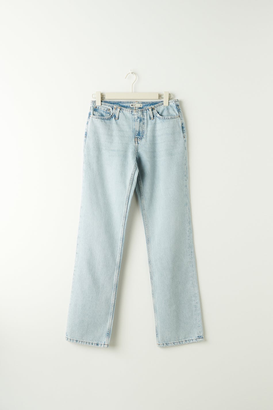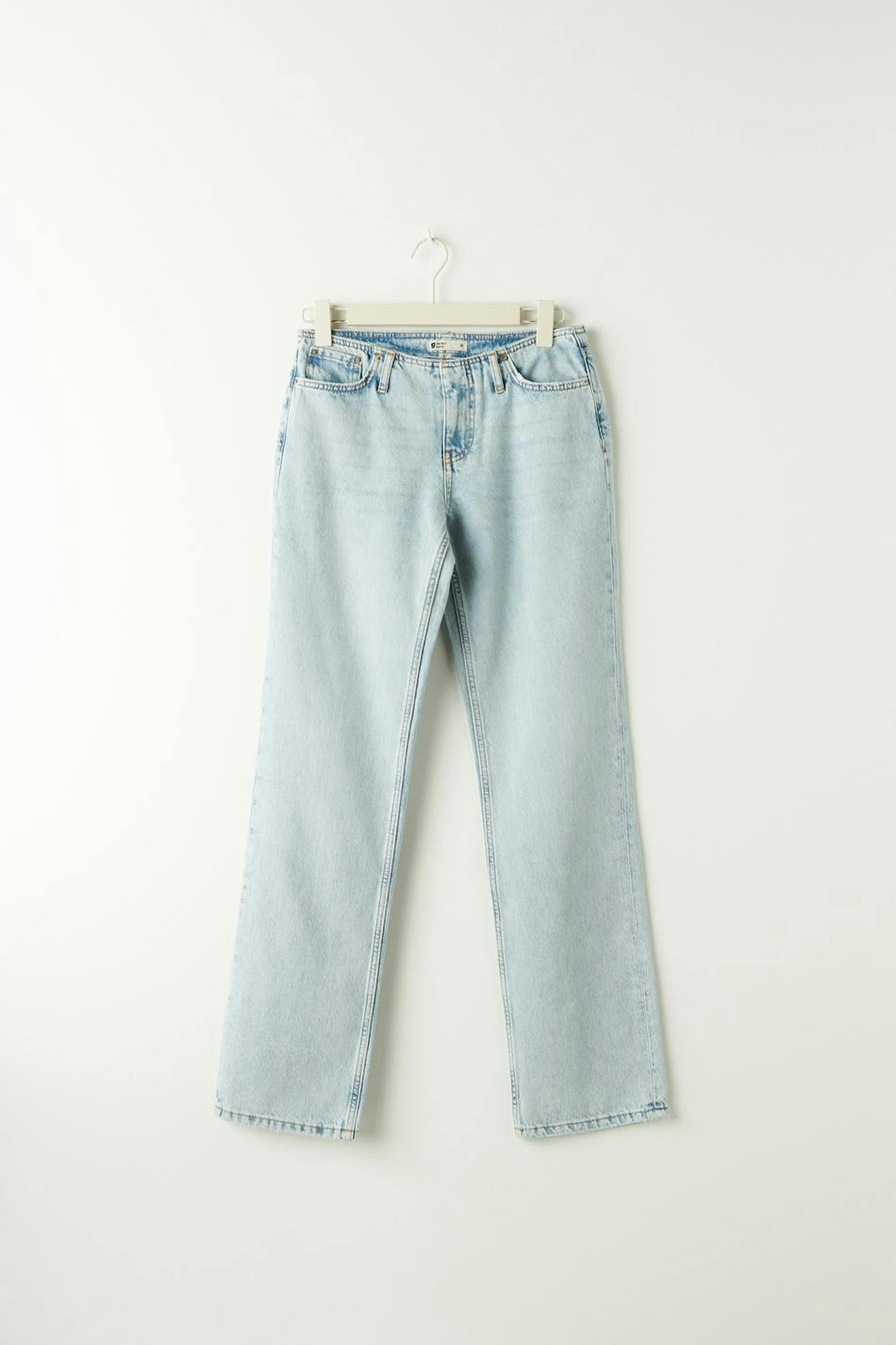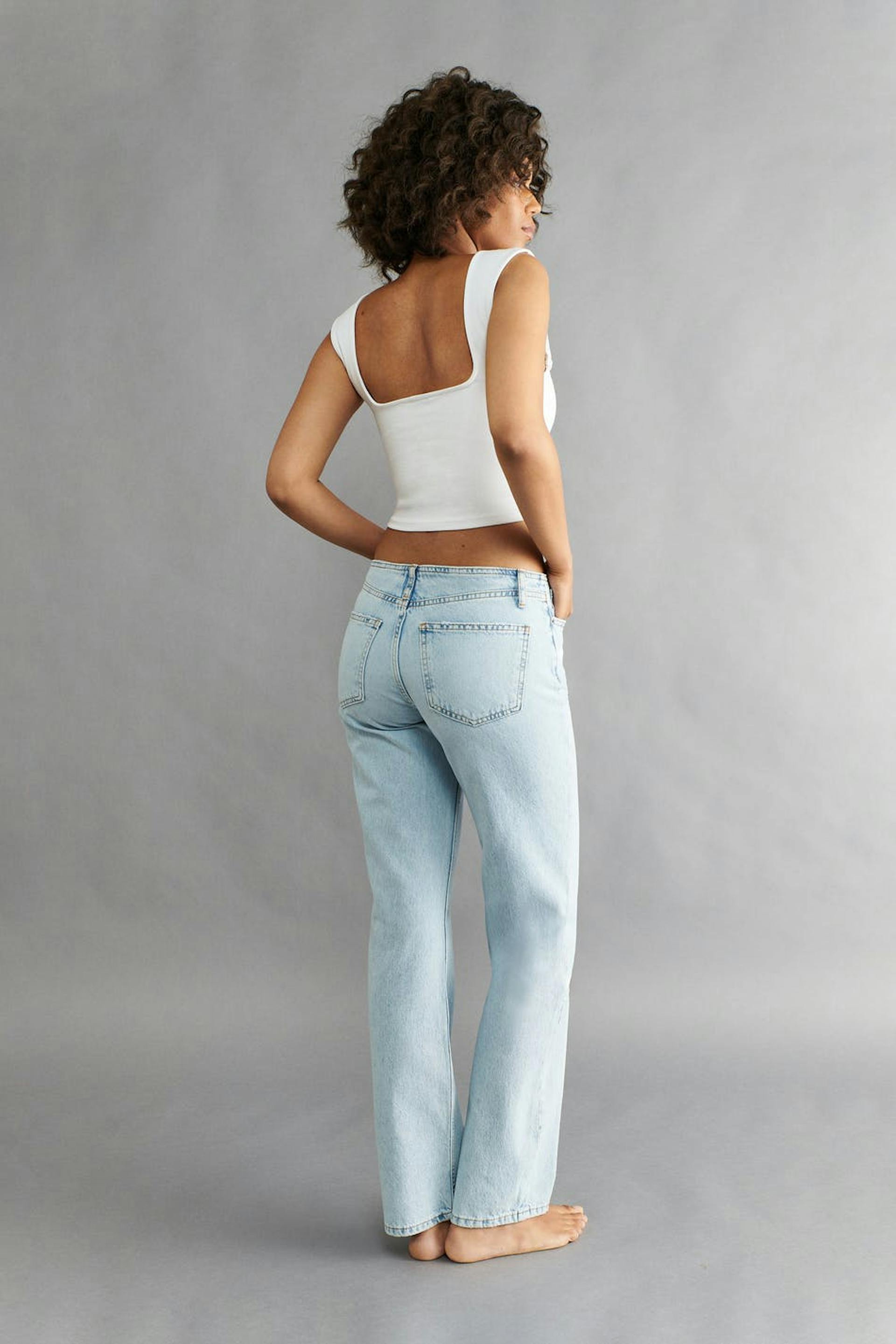 Low Waist Jeans mit geradem Schnitt aus nicht dehnbarem Denim. Die Jeans ist hellblau und hat Knopfverschluss.