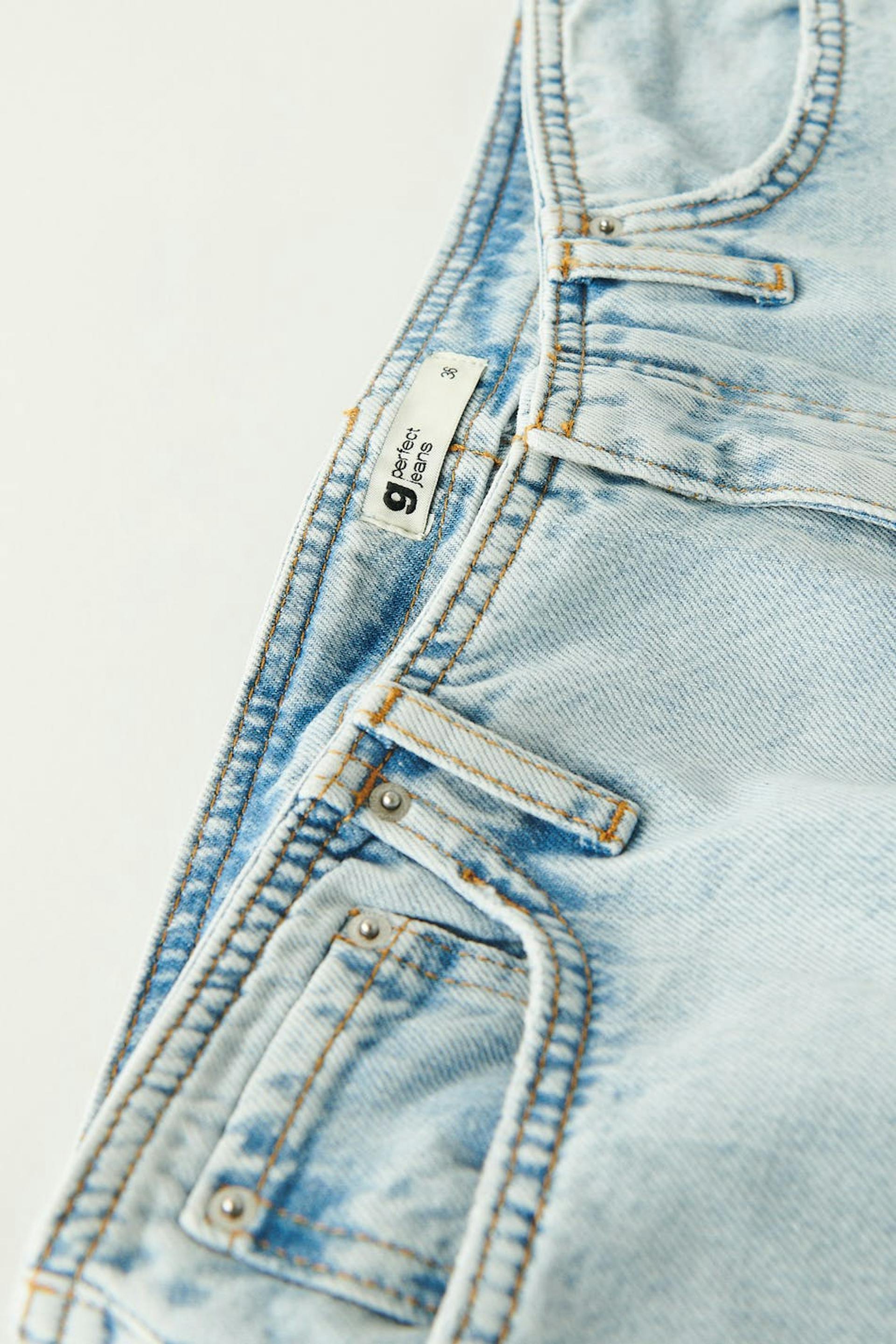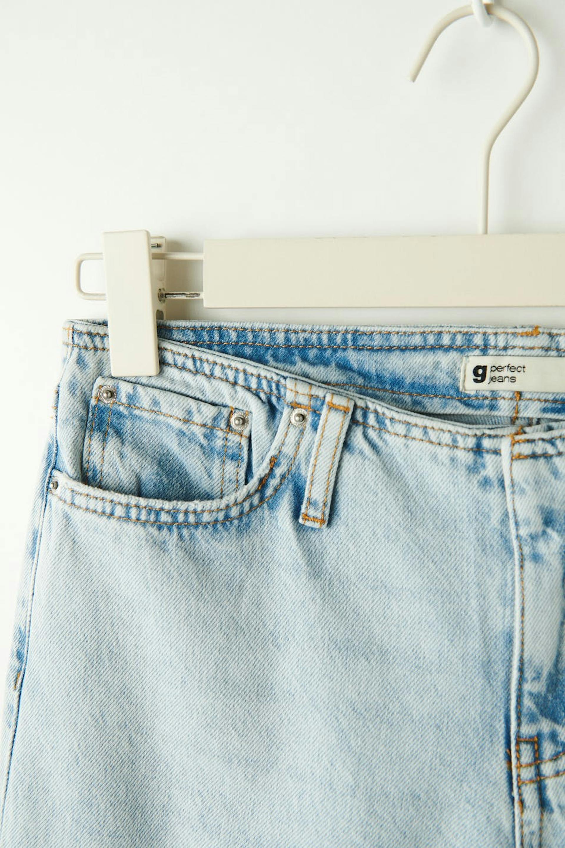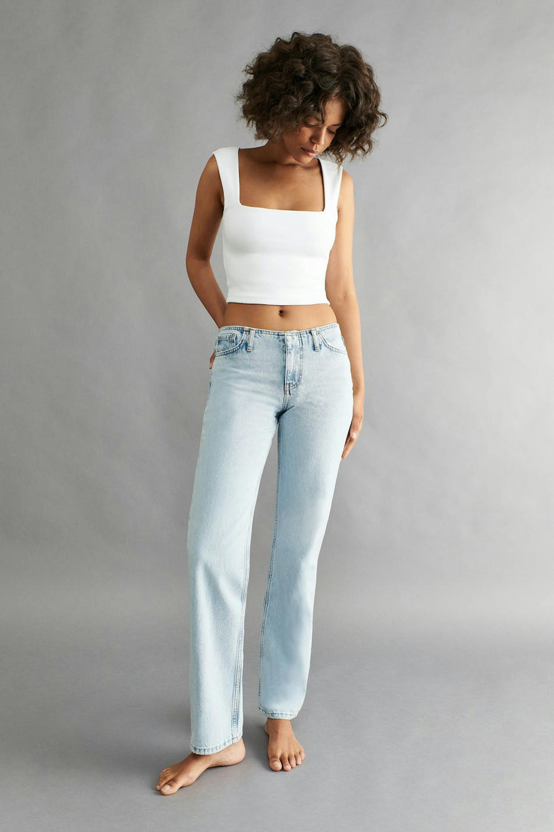 Low Waist Jeans mit geradem Schnitt aus nicht dehnbarem Denim. Die Jeans ist hellblau und hat Knopfverschluss.