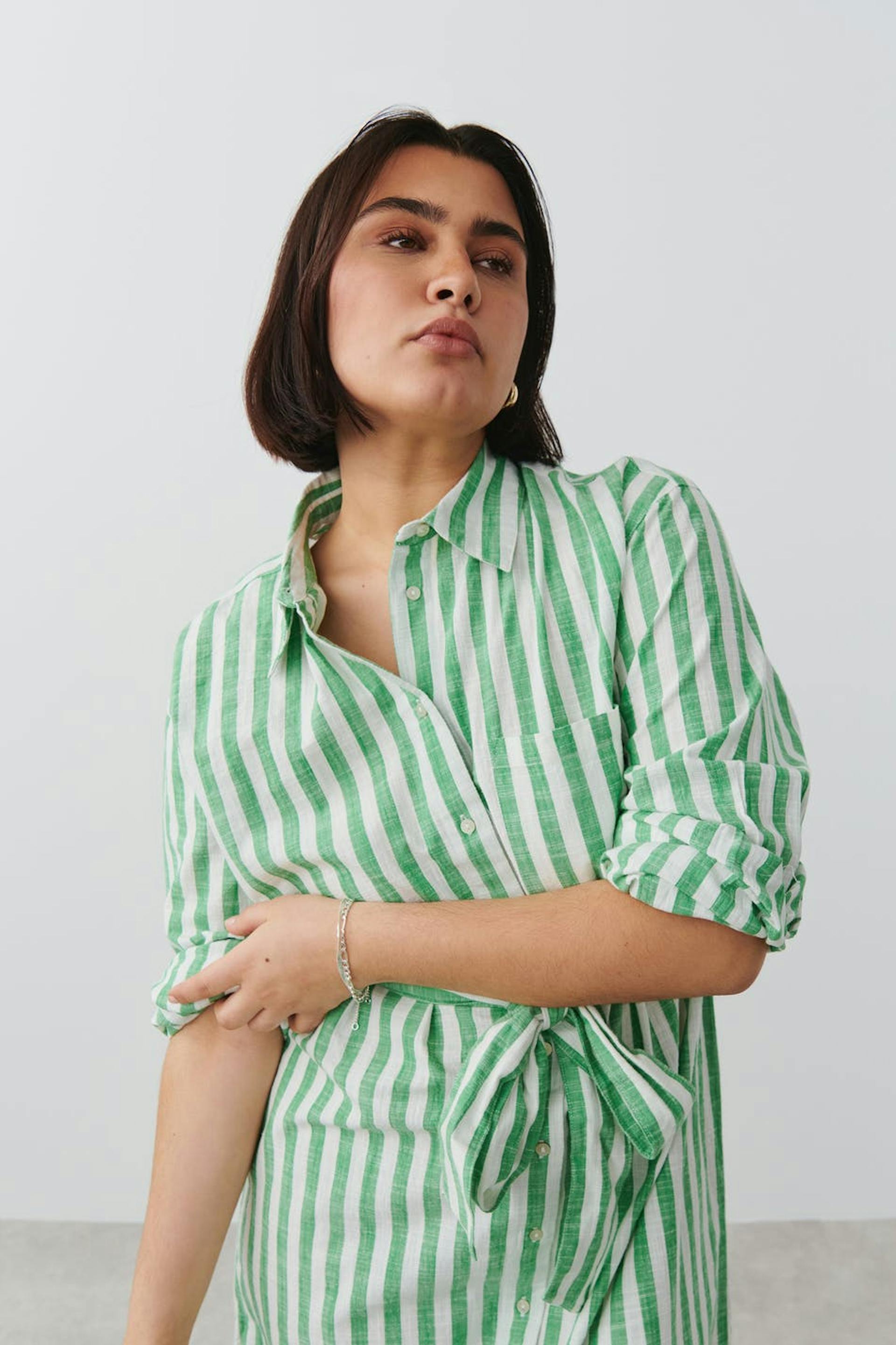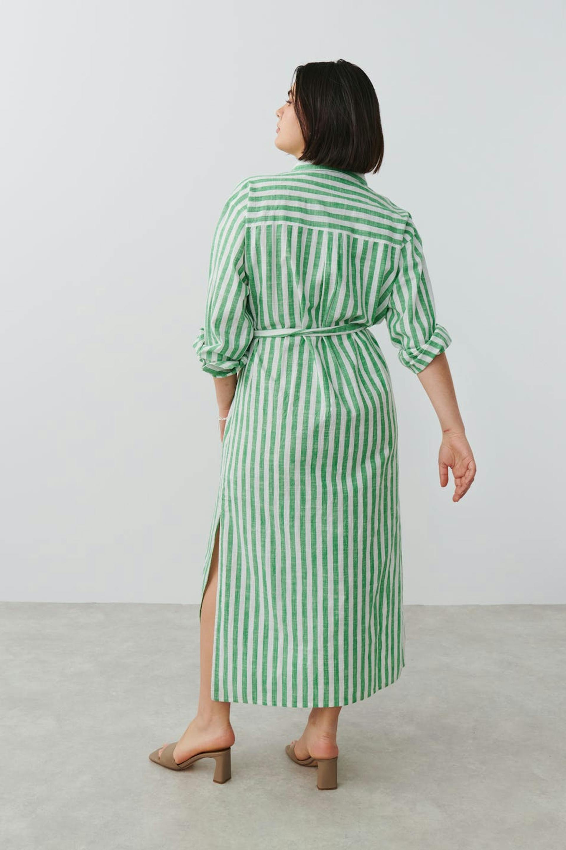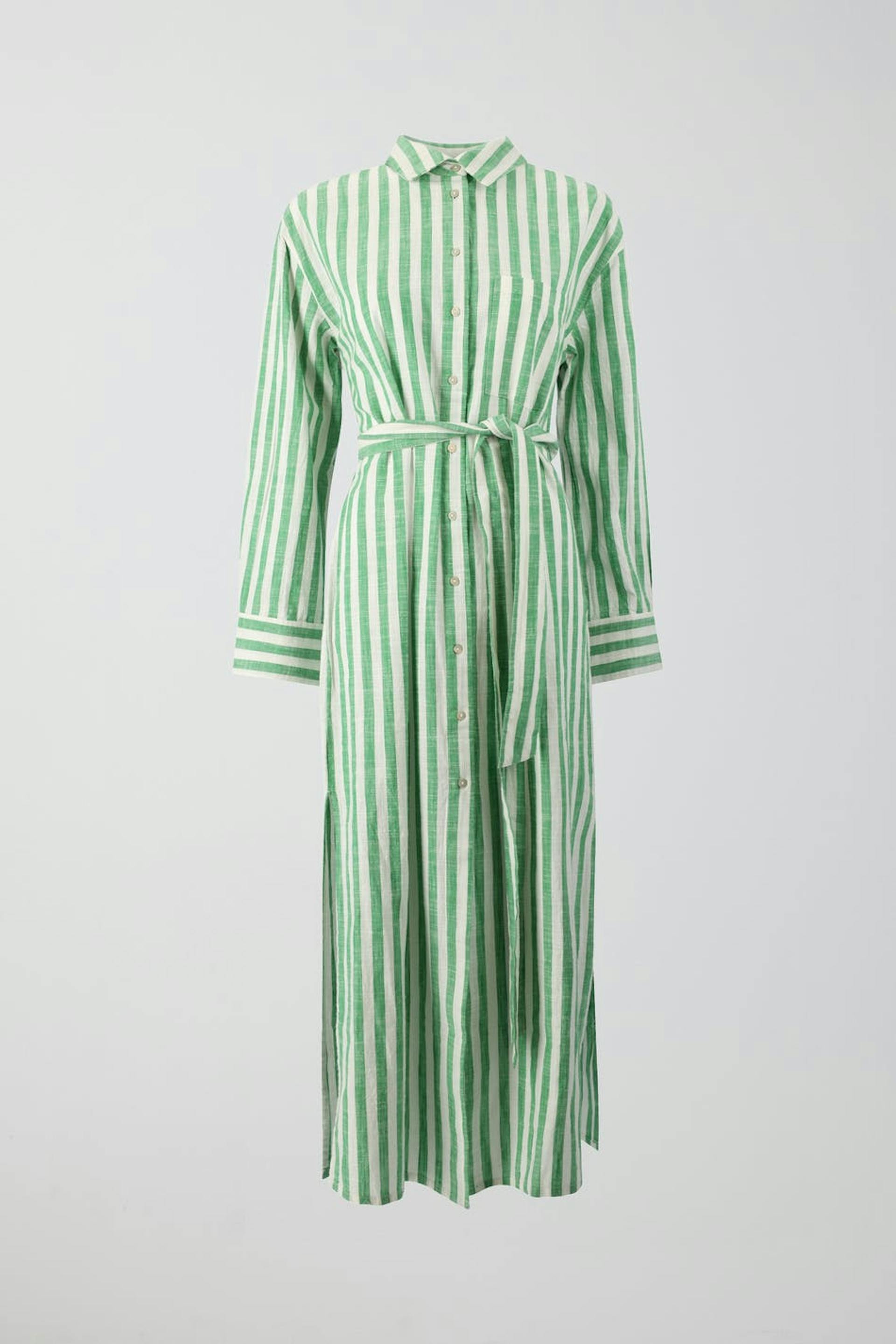 Gestreiftes Hemdkleid mit weit-geschnittenen Style. Das Kleid ist grün, weiβ und langärmlig. Es hat Knöpfung vorne, Kragen, Brusttasche, Bindegürtel in der Taille und Schlitz in den Seiten.