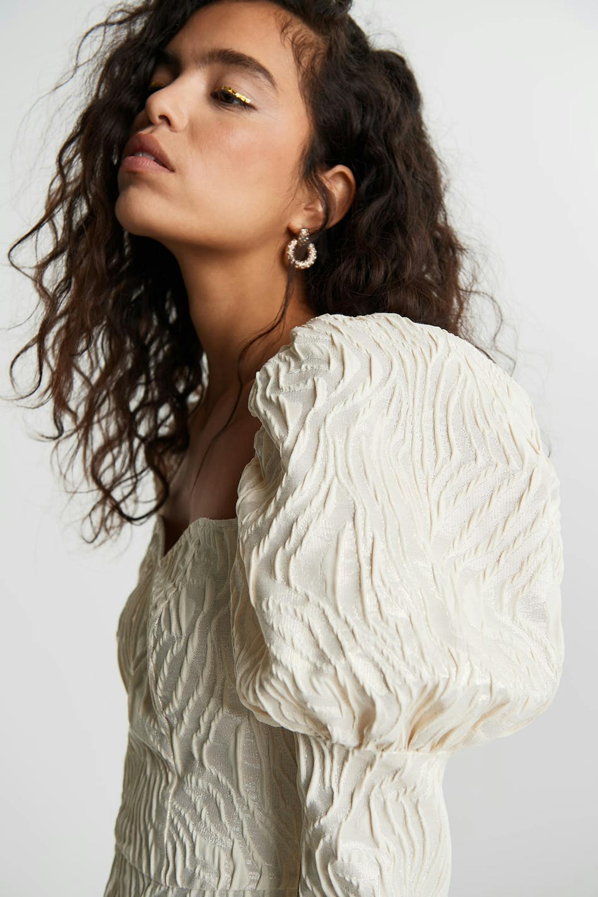 Jacquardkleid mit Puffärmeln und Herz vorne. Lieferant: Huzi Tekstil Ltd Sti Fertigungseinheit: Yesim Tekstil-Hulya Karacoban