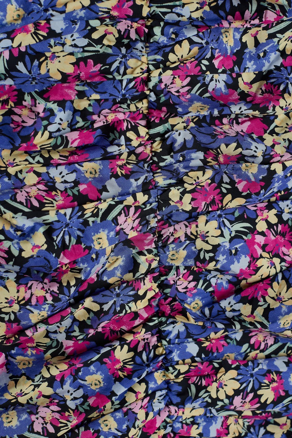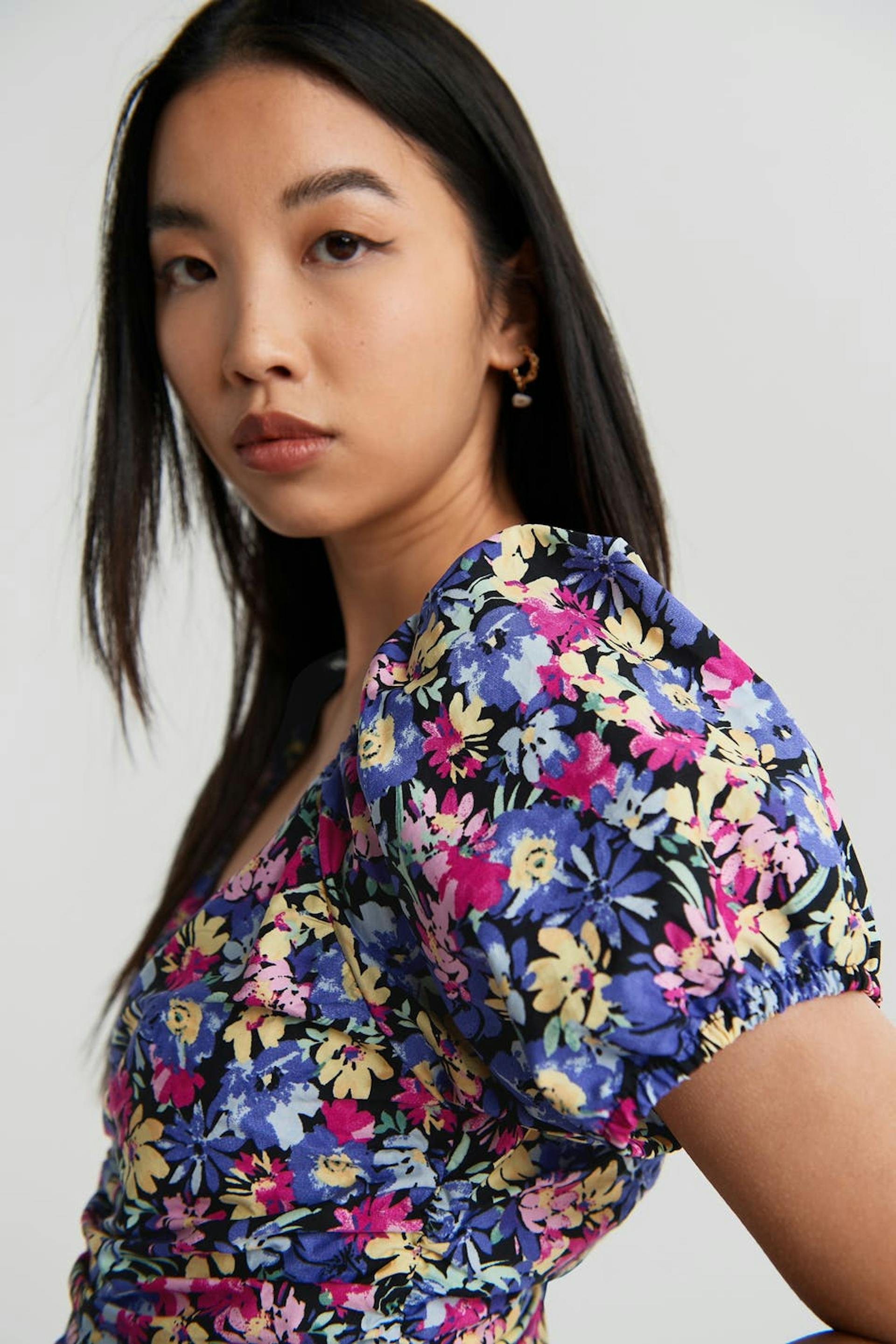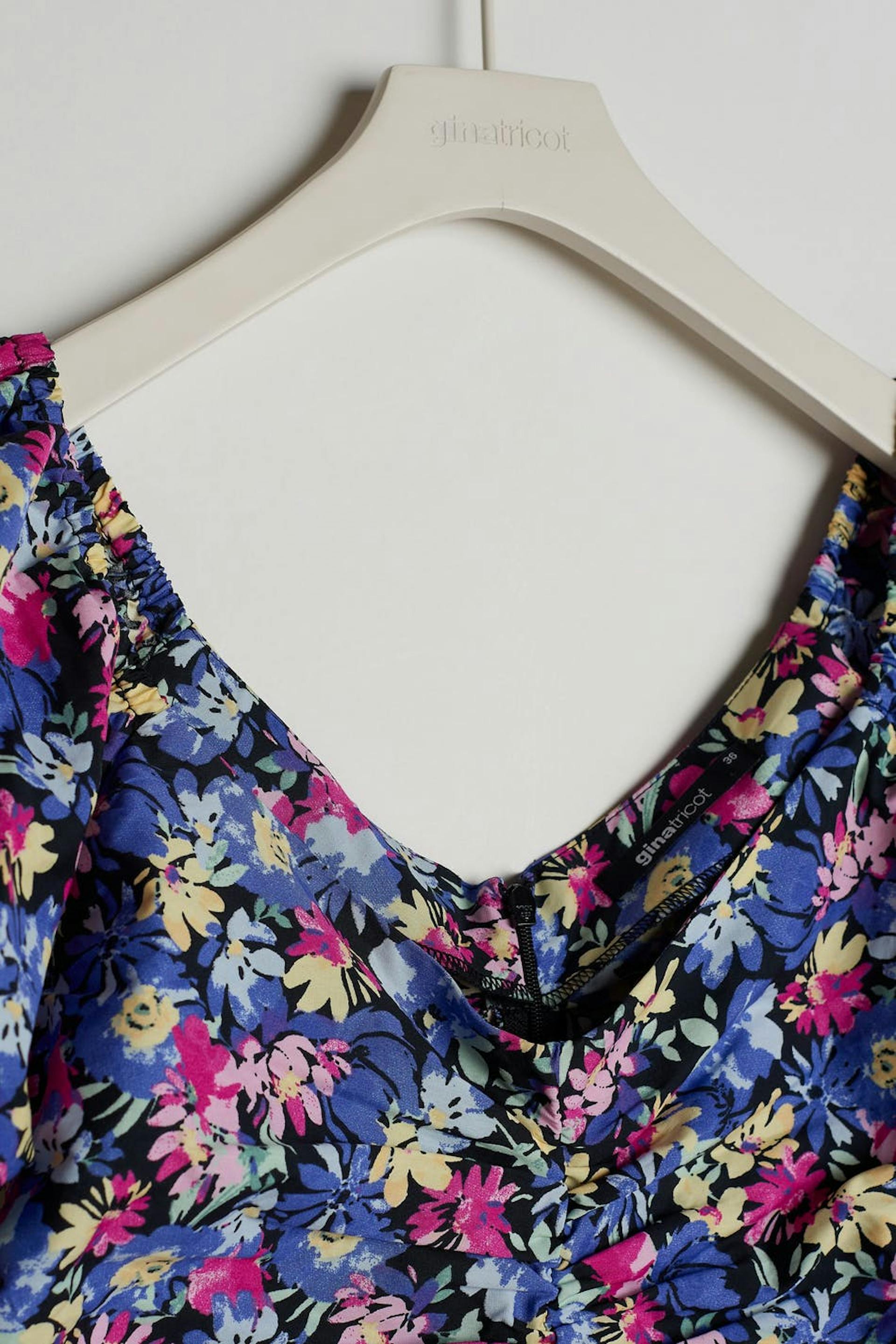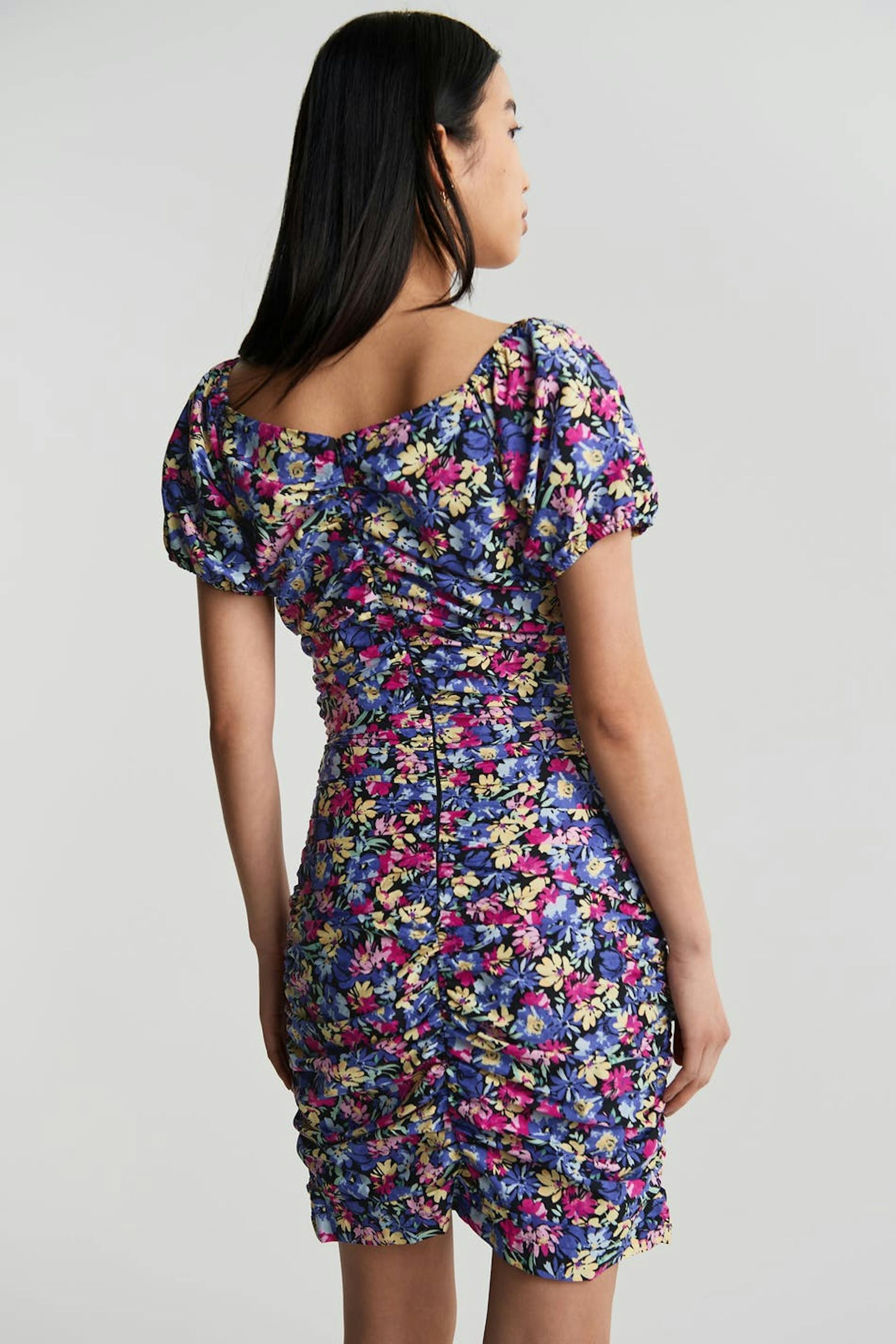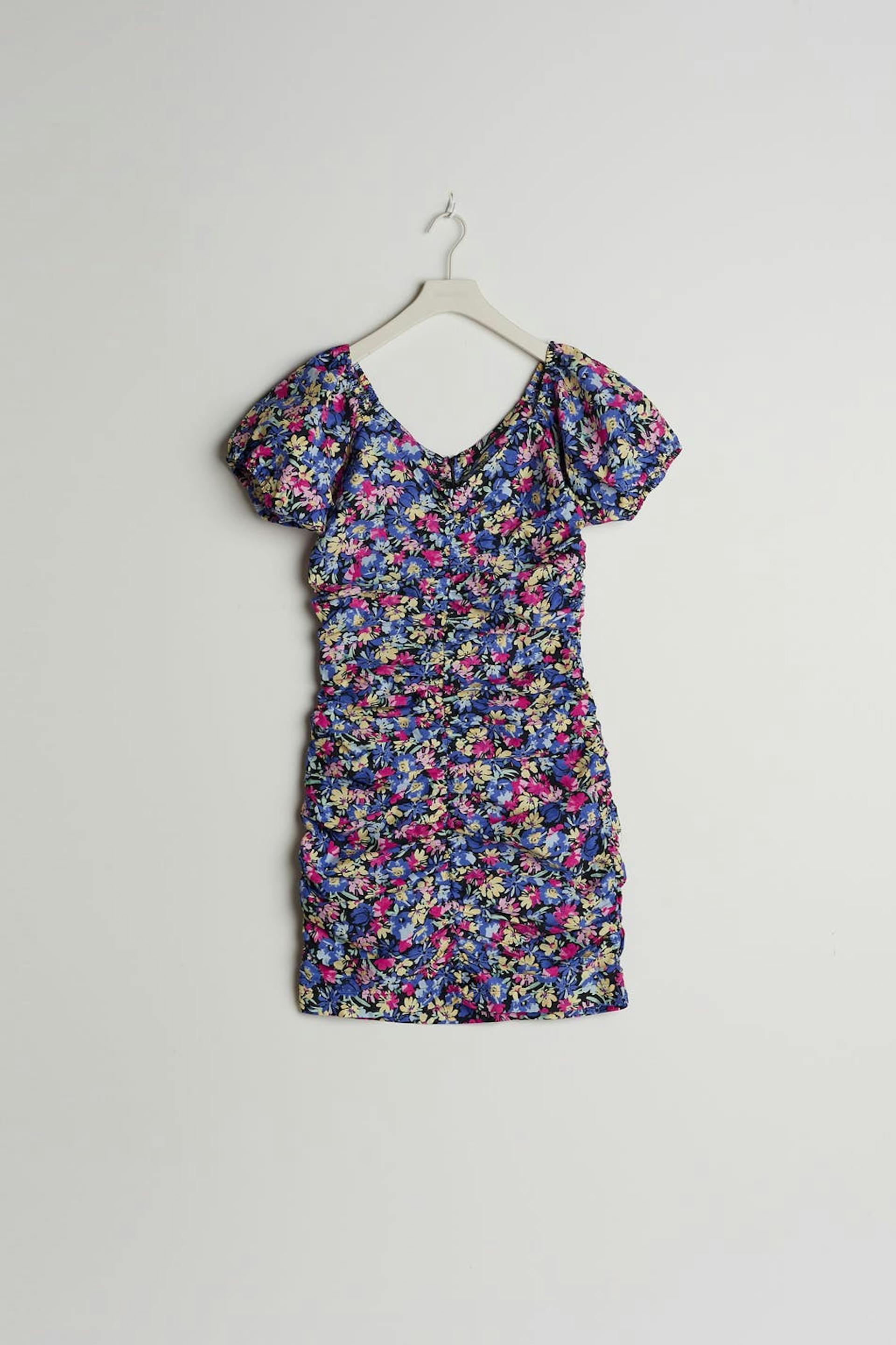 Kurzes Kleid mit rosa, lila, gelben Blumen komplett. Das Kleid hat kurze Puffärmel. Es hat Raffungen auf der Vorderseite und auf der Rückseite, einen V-Ausschnitt und einen versteckten Reißverschluss am Rücken.
