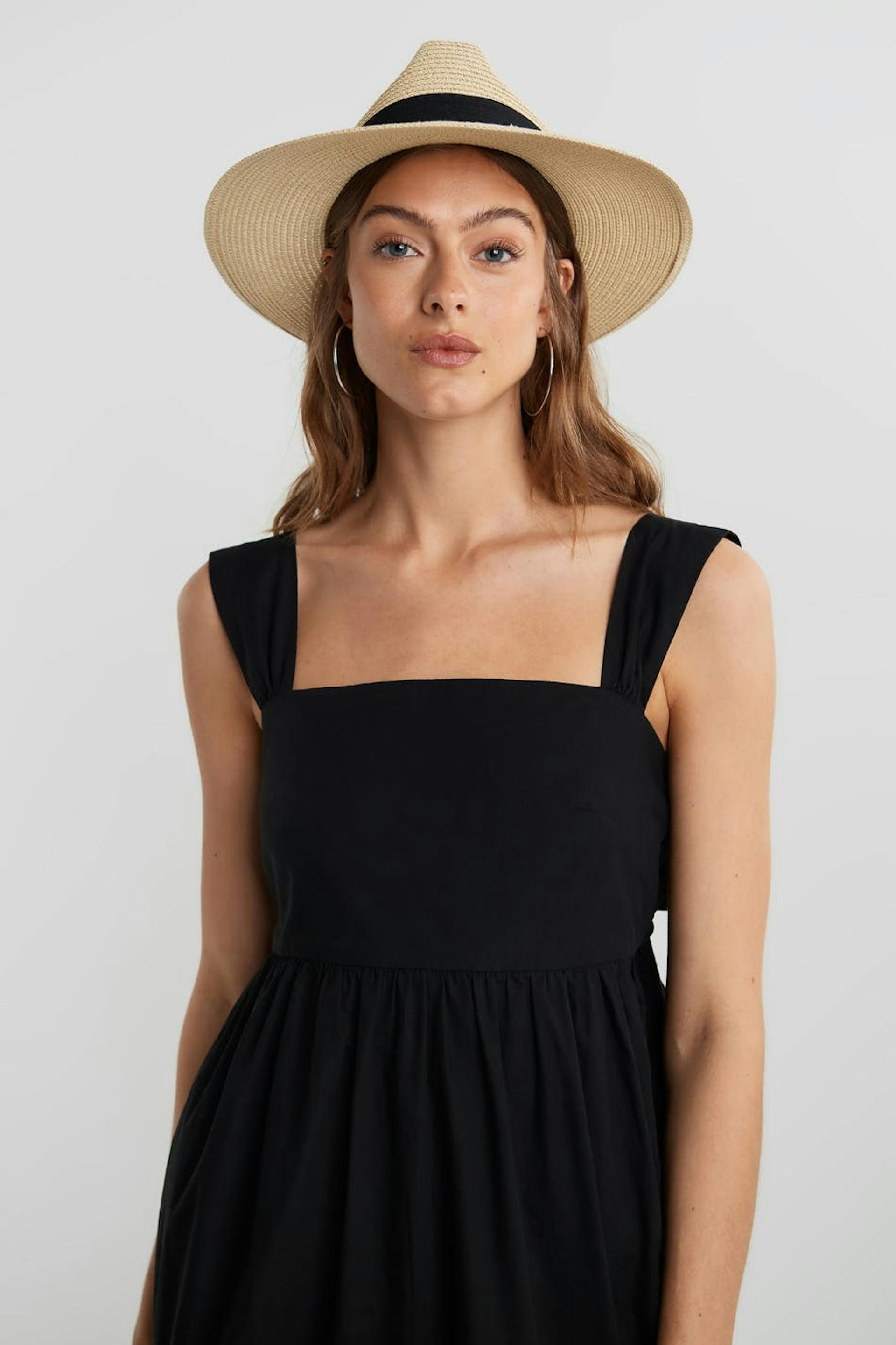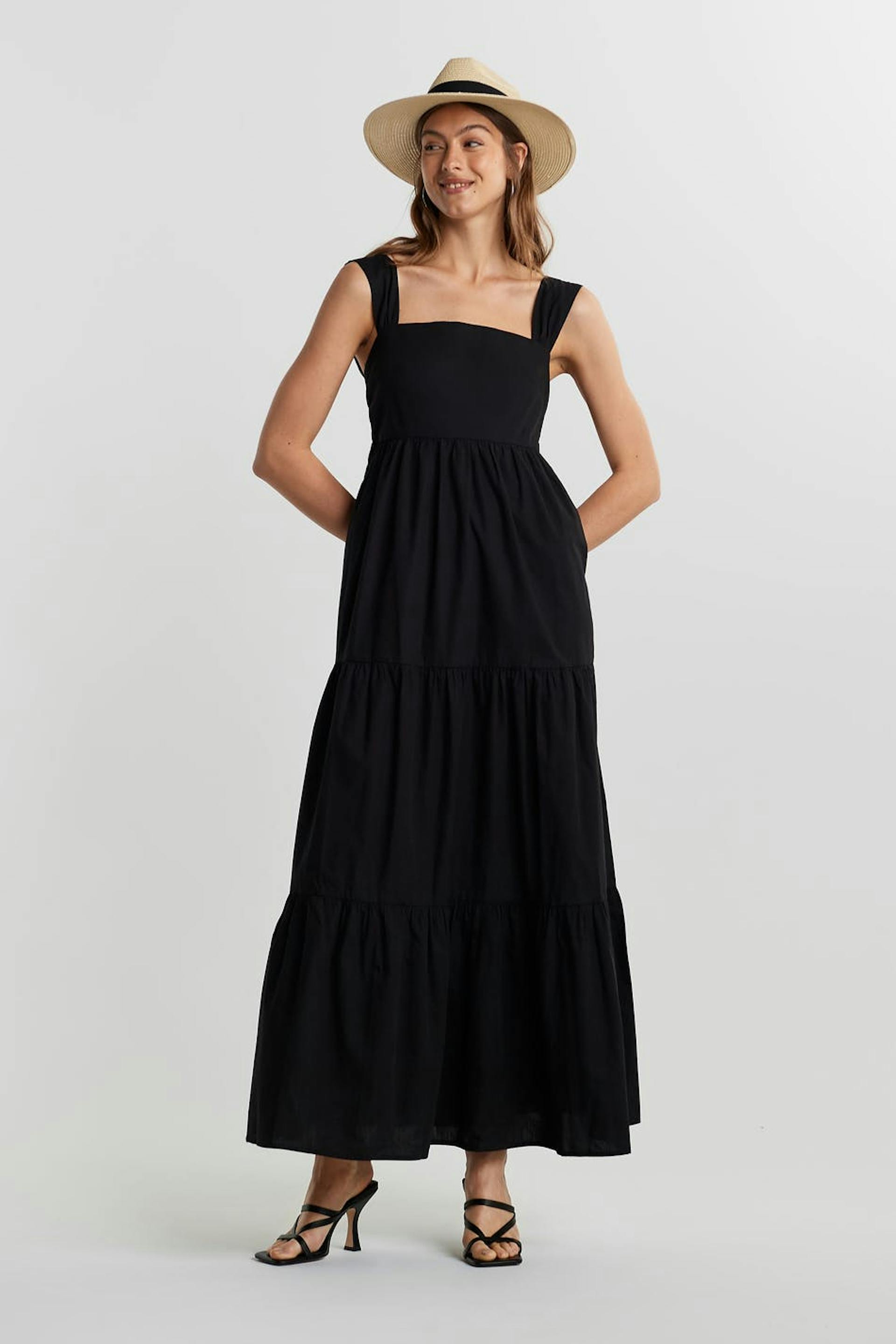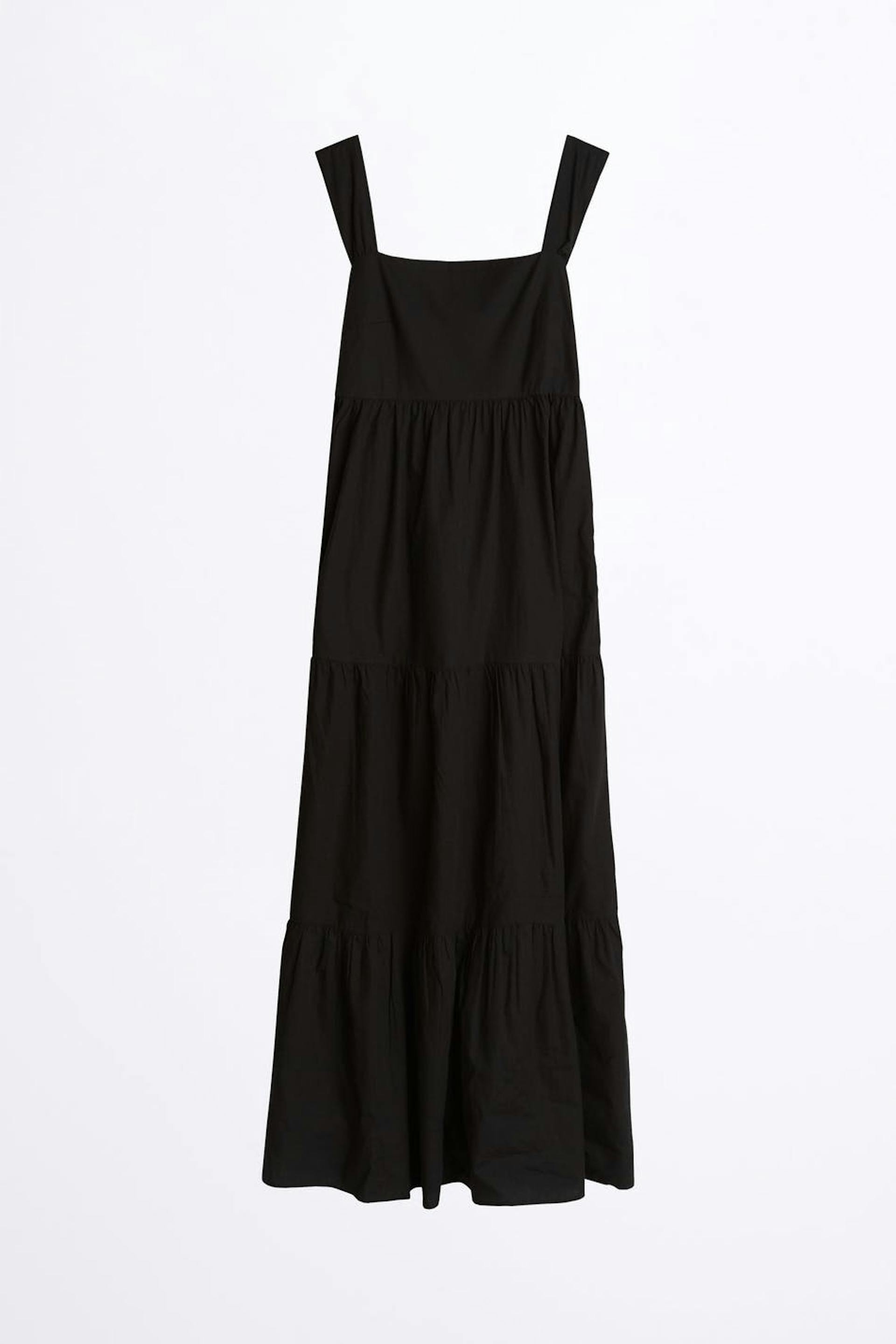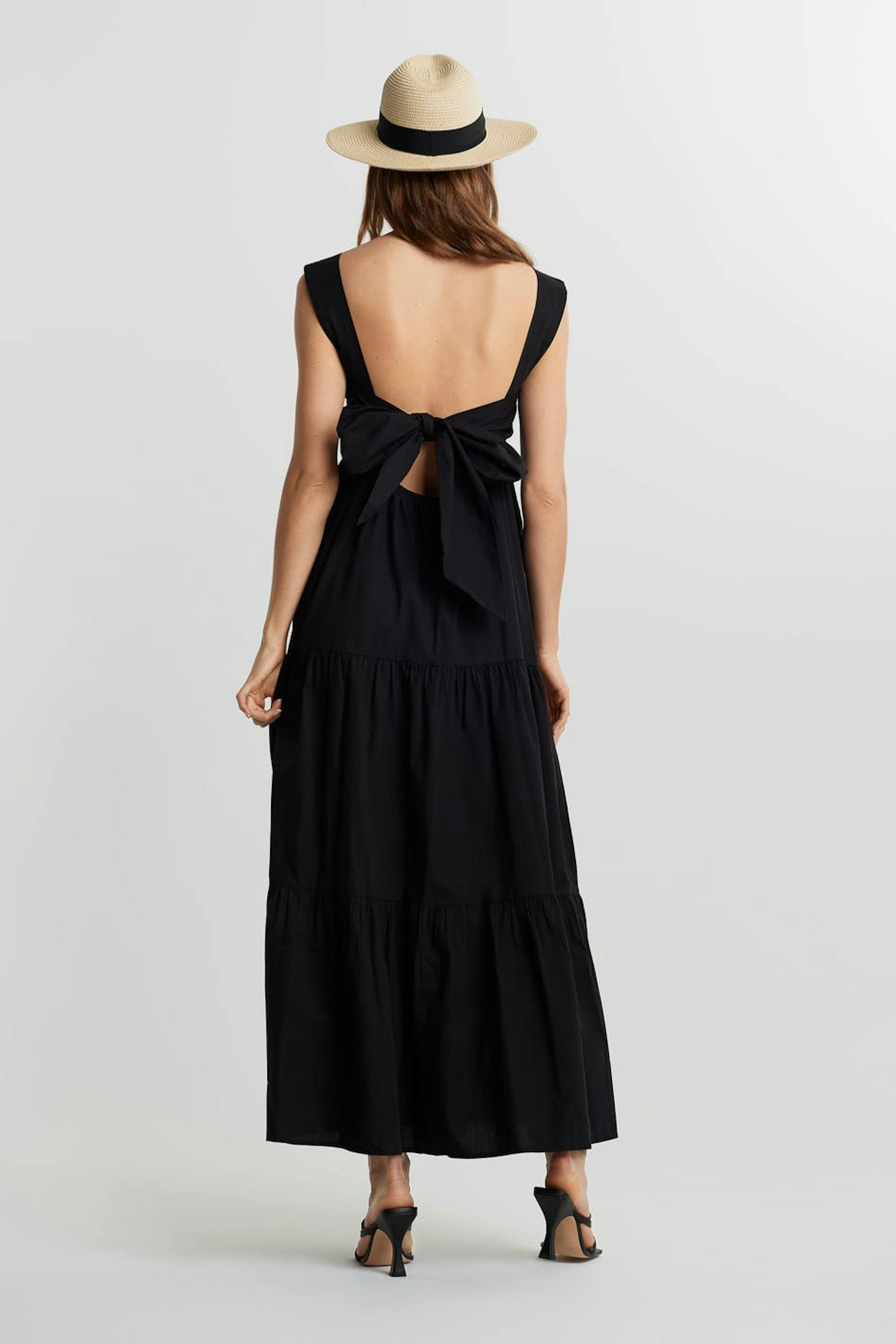 Kleid mit einer Maxi-Länge. Das Kleid ist schwarz und hat ein Detail mit einer Selbstbindung hinten.