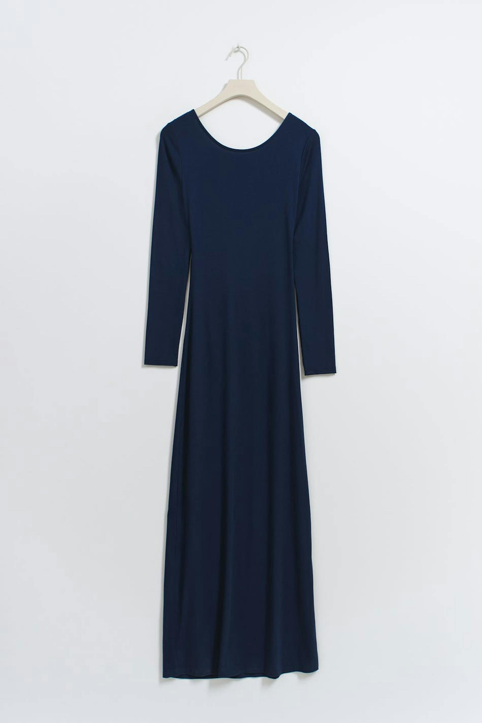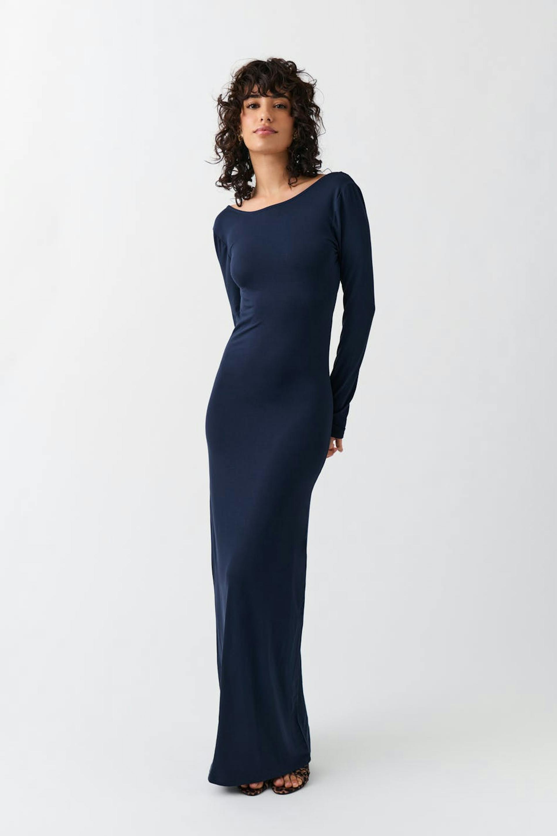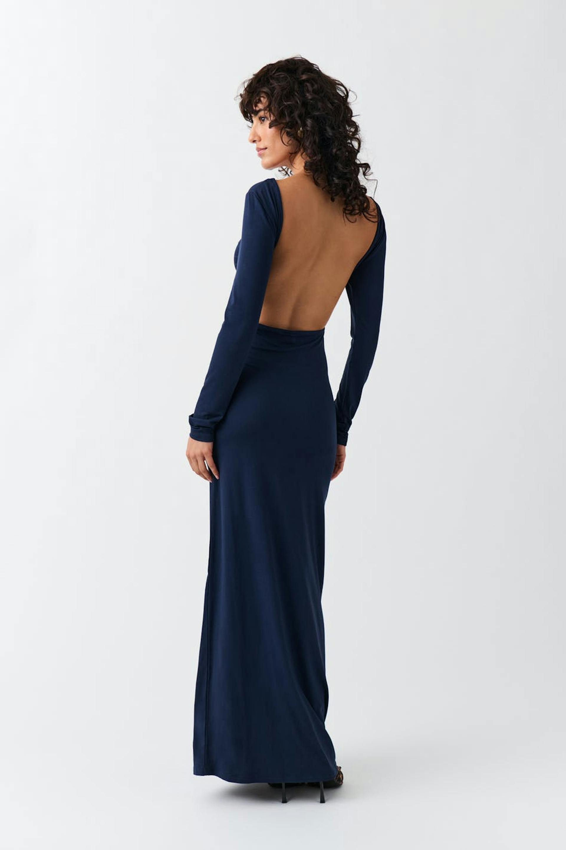 Soft touch – second skin comfort. Langärmliges Kleid mit offenem Rücken. Das Kleid ist blau und hat figurbetonte Passform. Es hat weiche, elastische Qualität, Rundhalsausschnitt und Maxi-Länge.