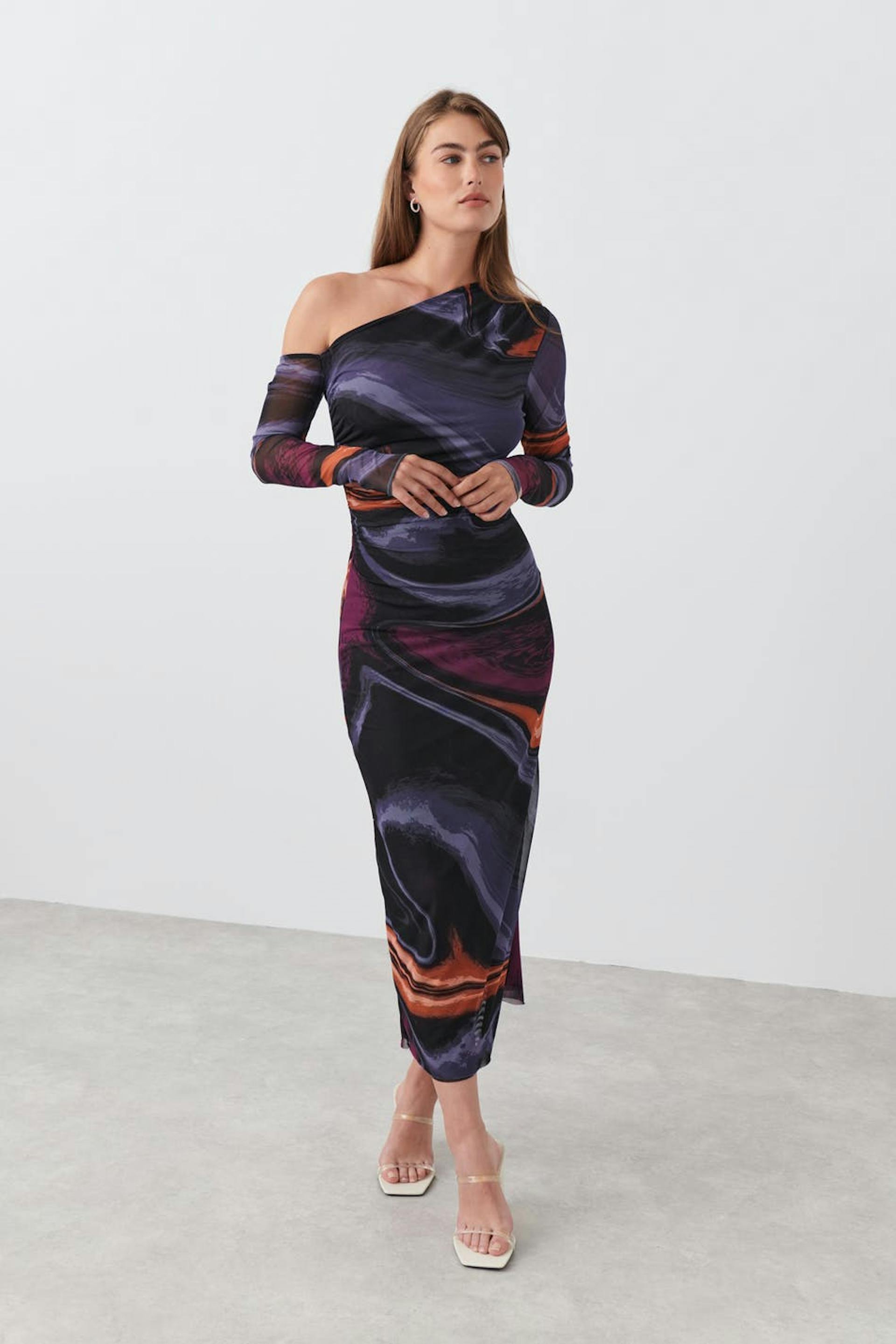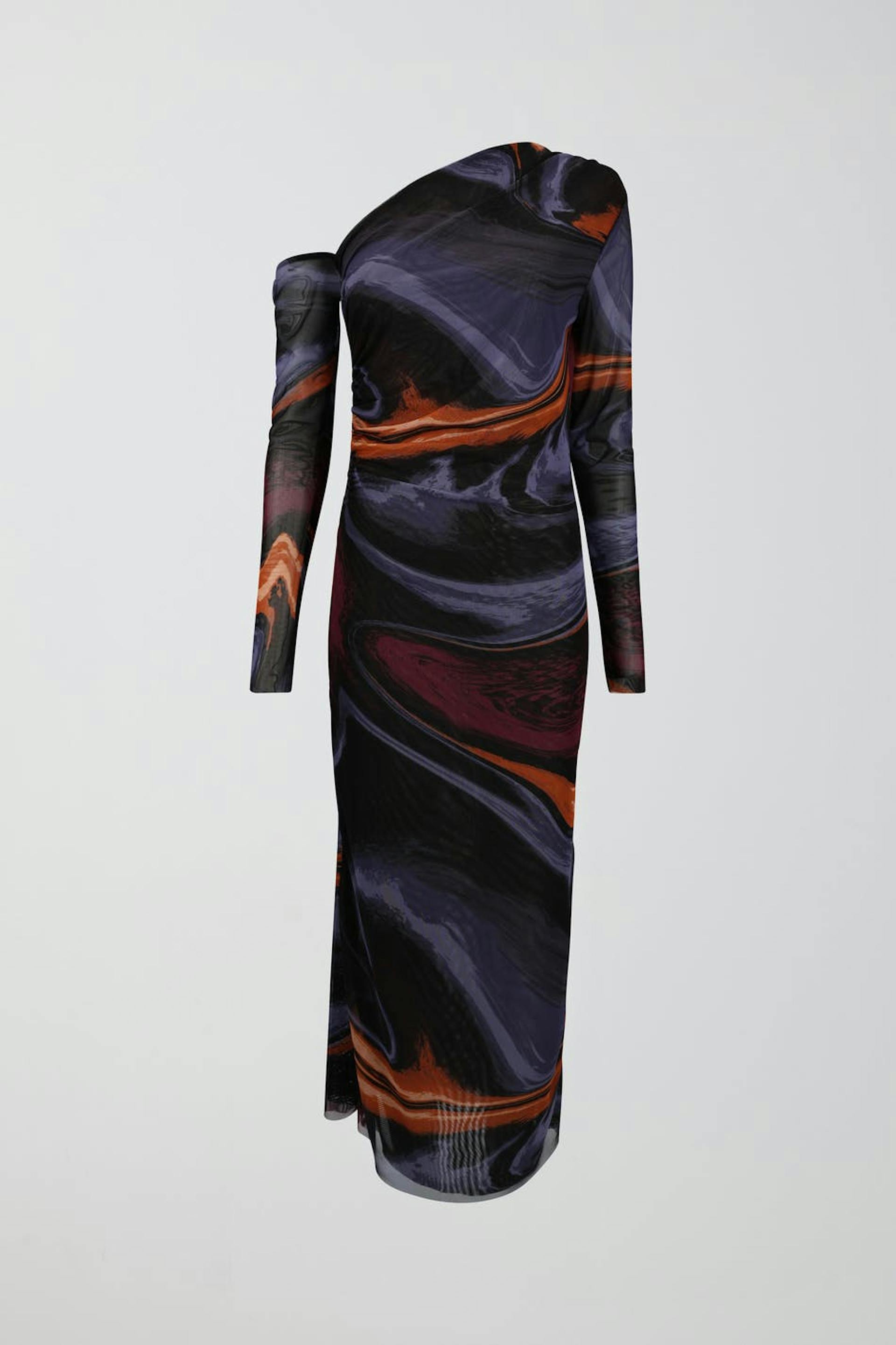Gemustertes Kleid aus Mesh mit asymmetrischem Ausschnitt. Das Kleid ist schwarz und hat drapierte Details. Es hat langen Ärmel und eine Maxi-Länge.