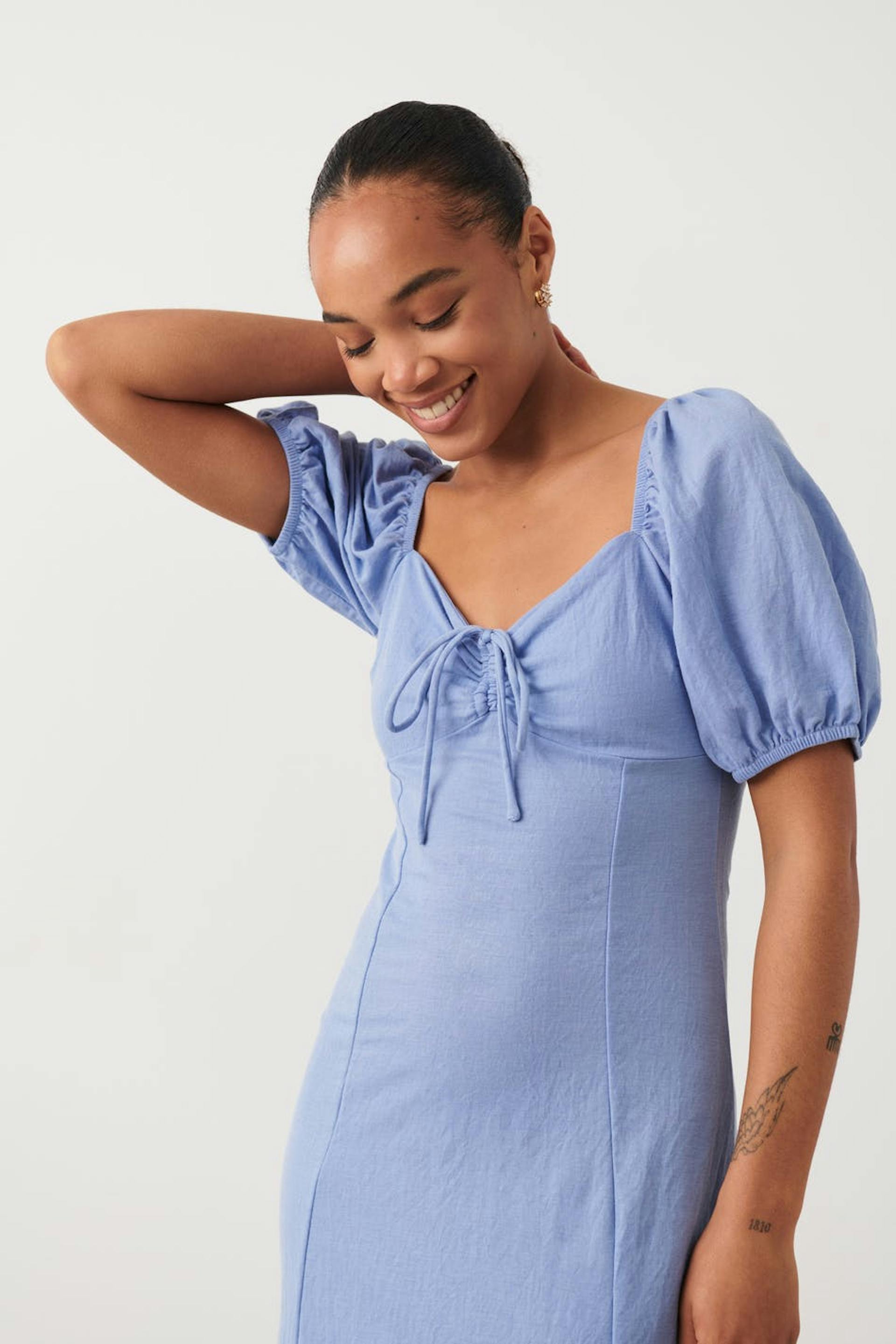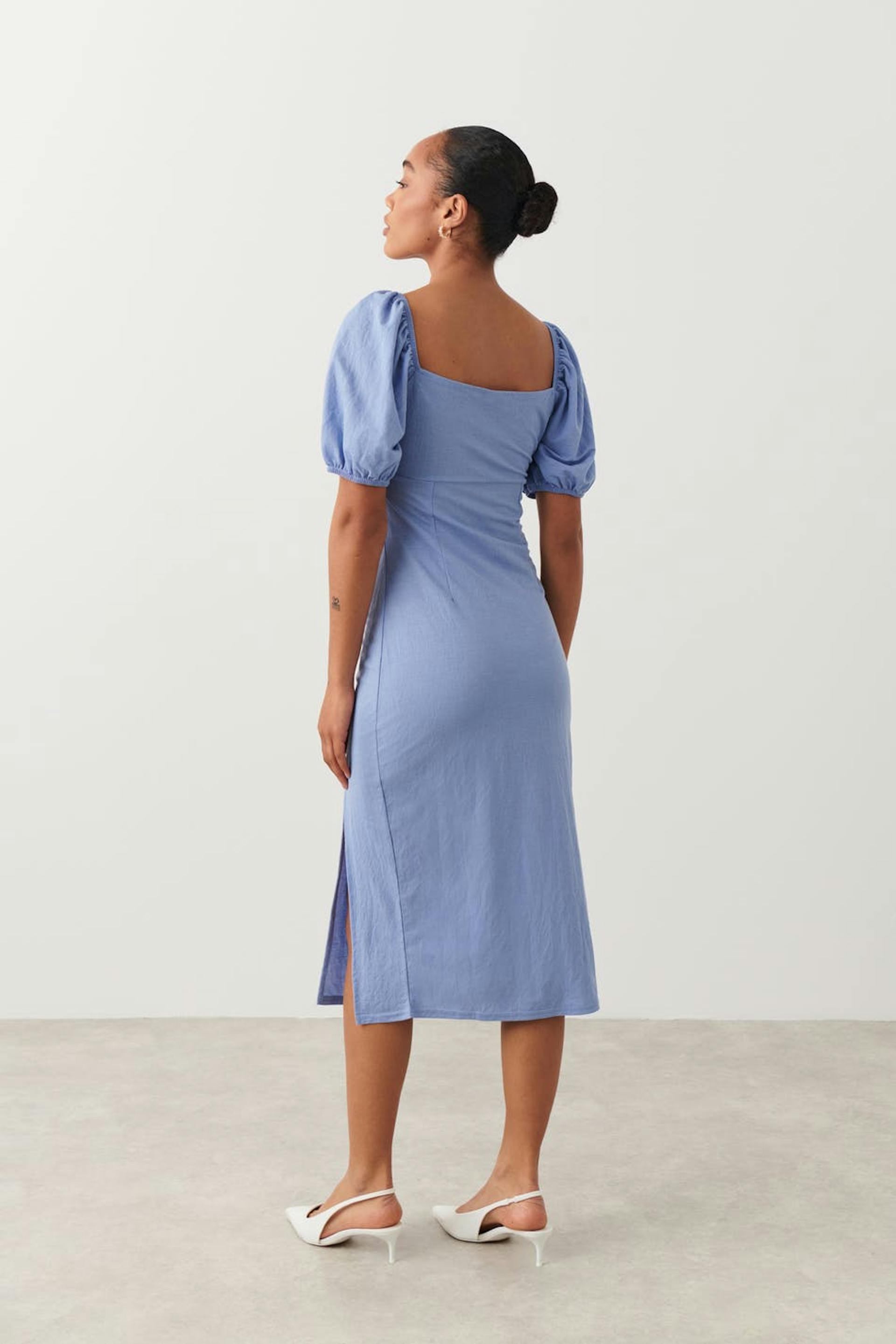 Midikleid mit kurzen Puffärmeln. Das Kleid ist blau und hat normale Passform. Es hat hohen Schlitz vorne und quadratischen Ausschnitt mit Knoten-Detail.
