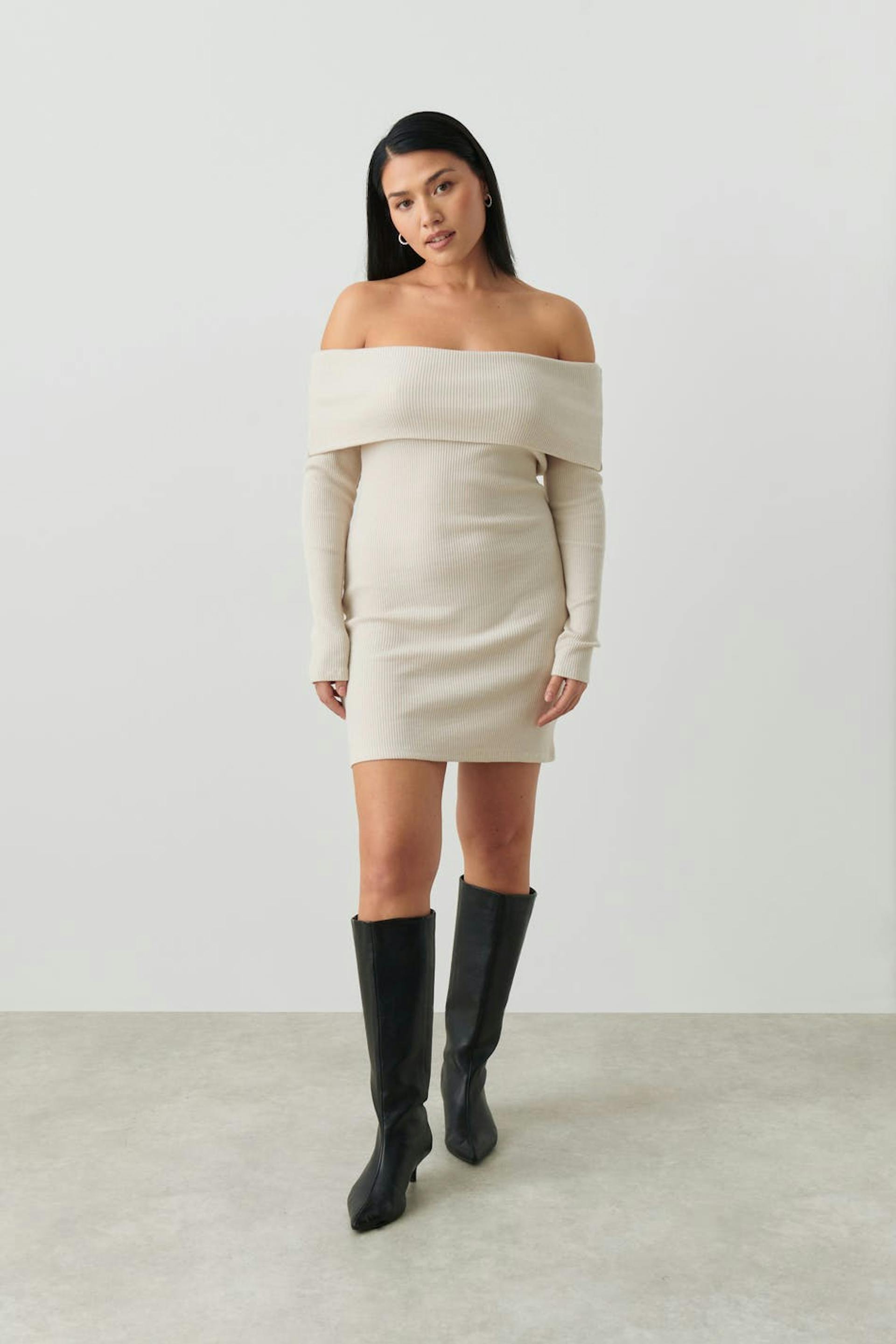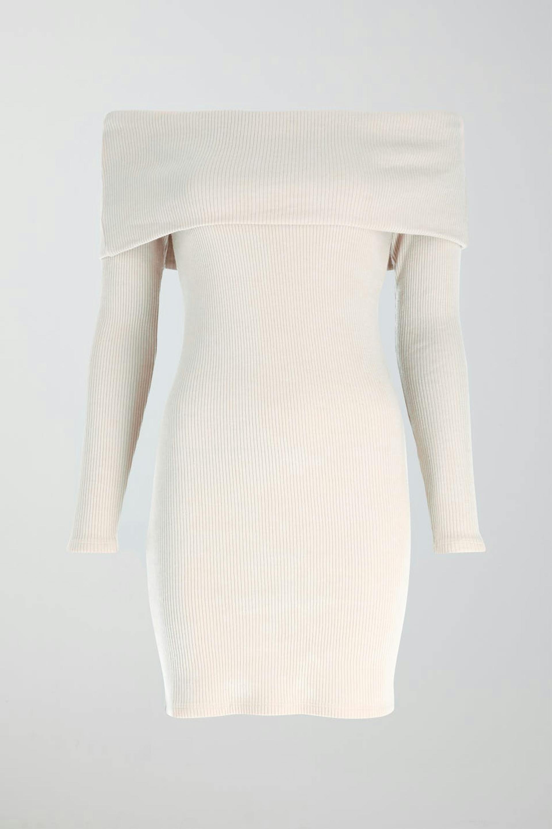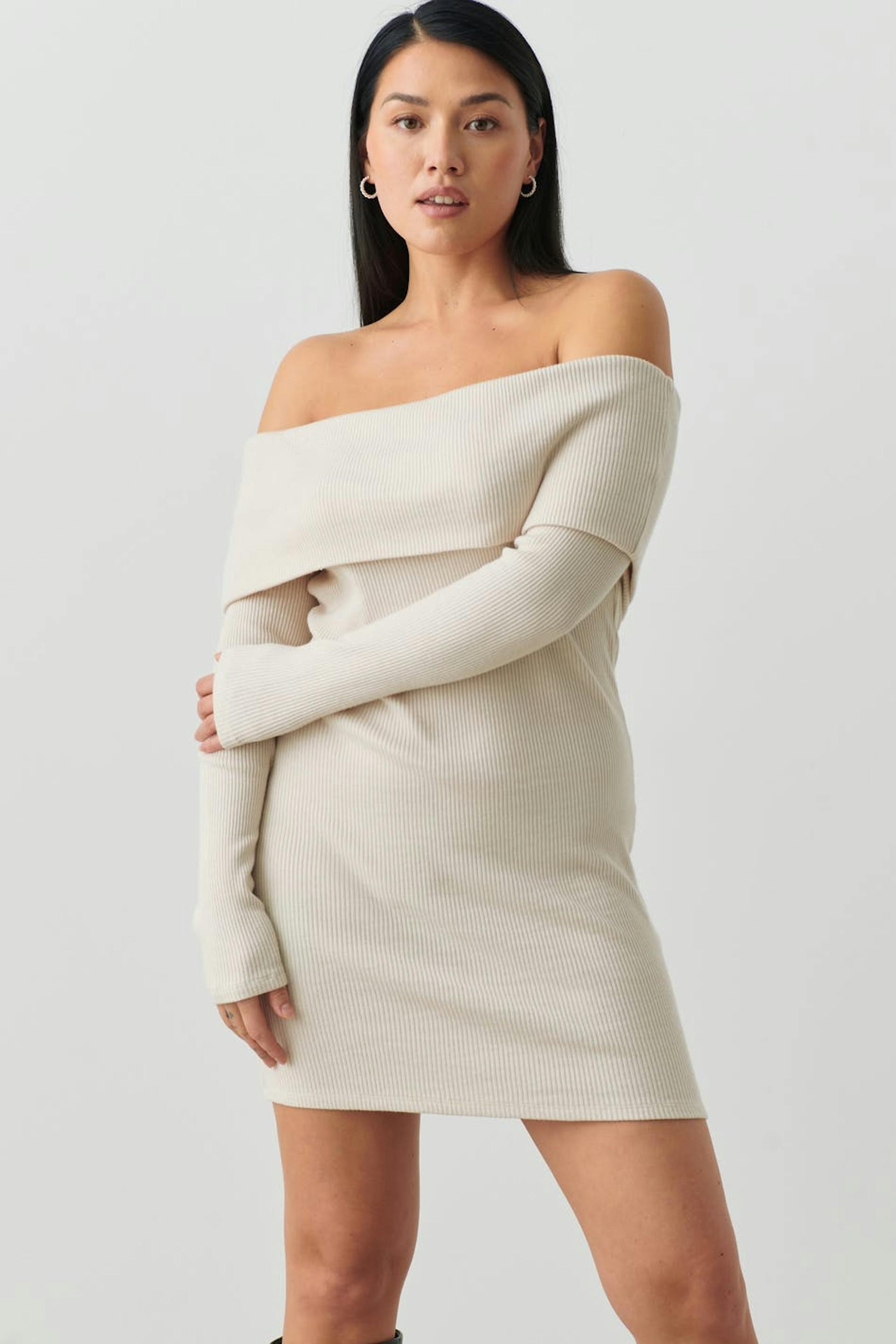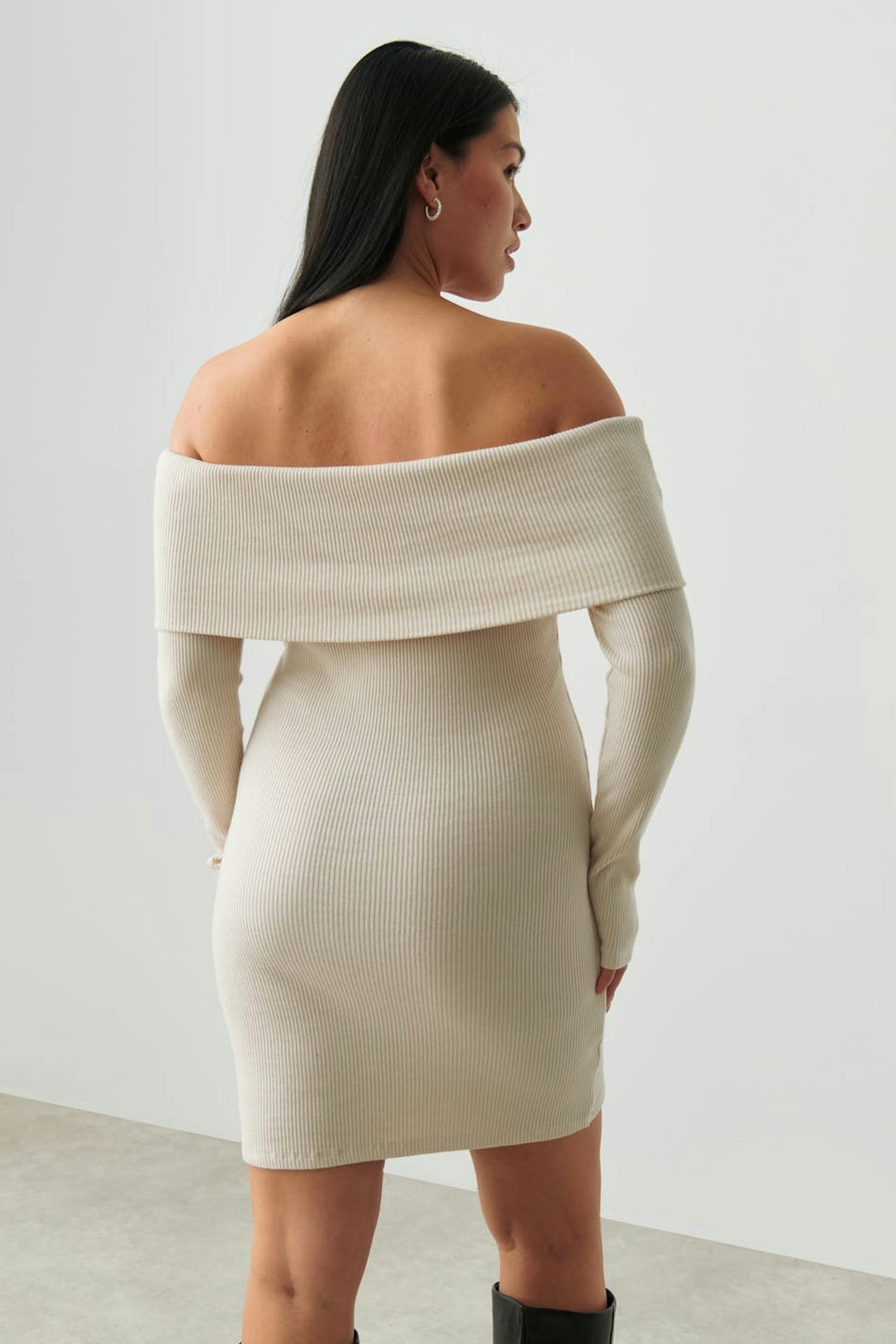 Geripptes schulterfreies Kleid mit langem Ärmel. Das Kleid ist beige und hat figurbetonte Passform.