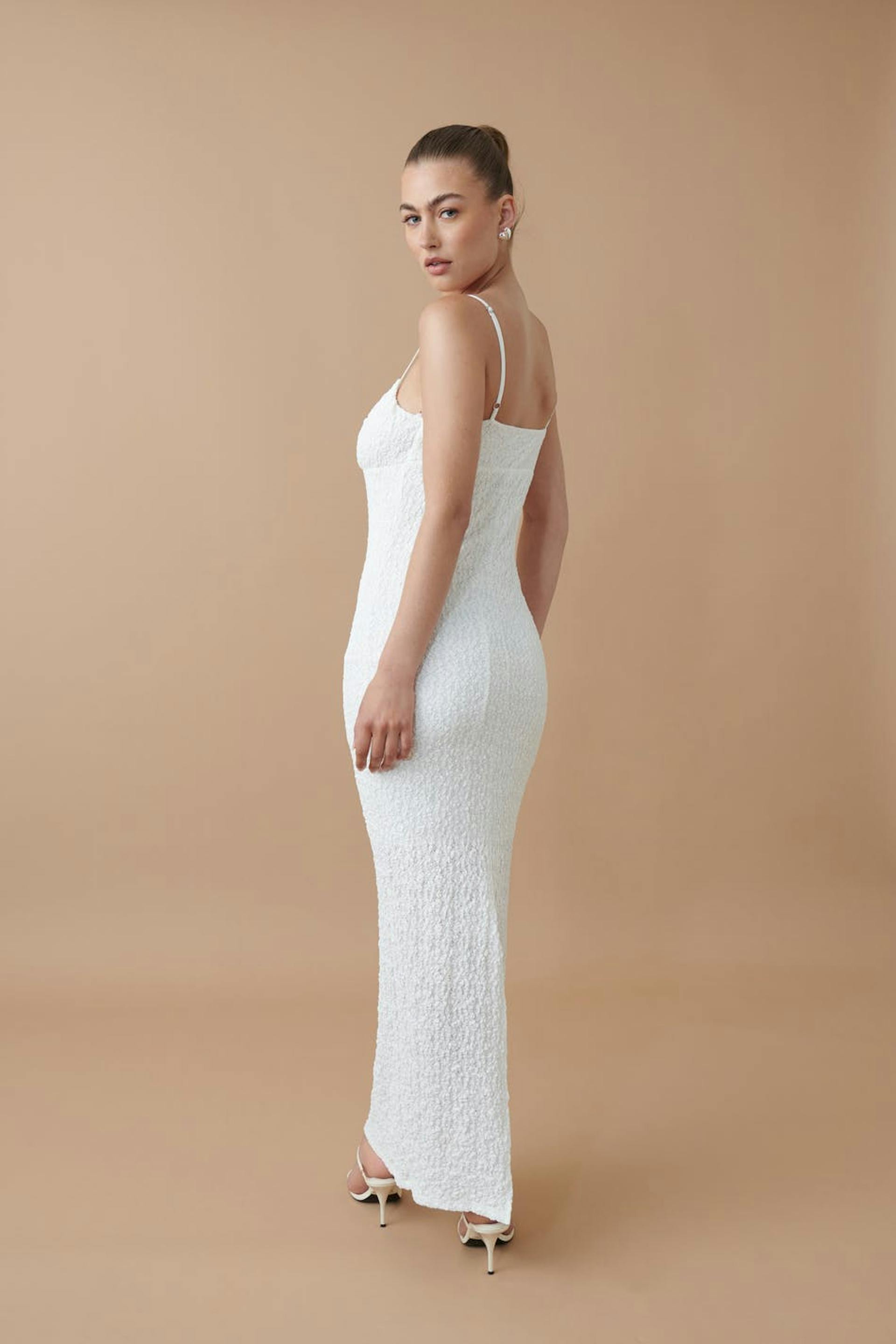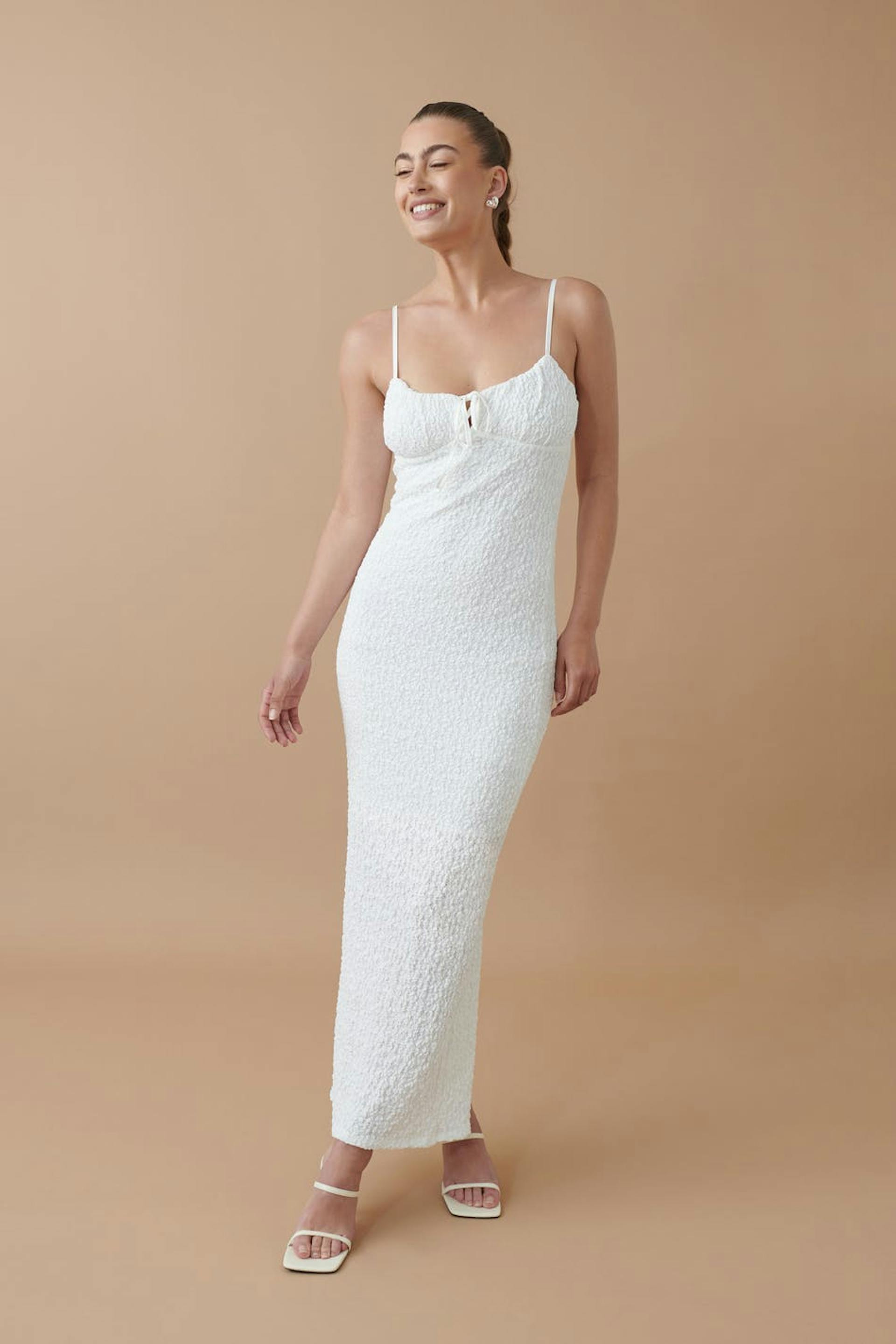 Ärmelloses Maxikleid mit gerüschter Brustpartie. Das Kleid ist weiβ und hat figurbetonte Passform. Es hat strukturiertes Material, Knoten-Detail vorne und schmale, verstellbare Trägerbänder.