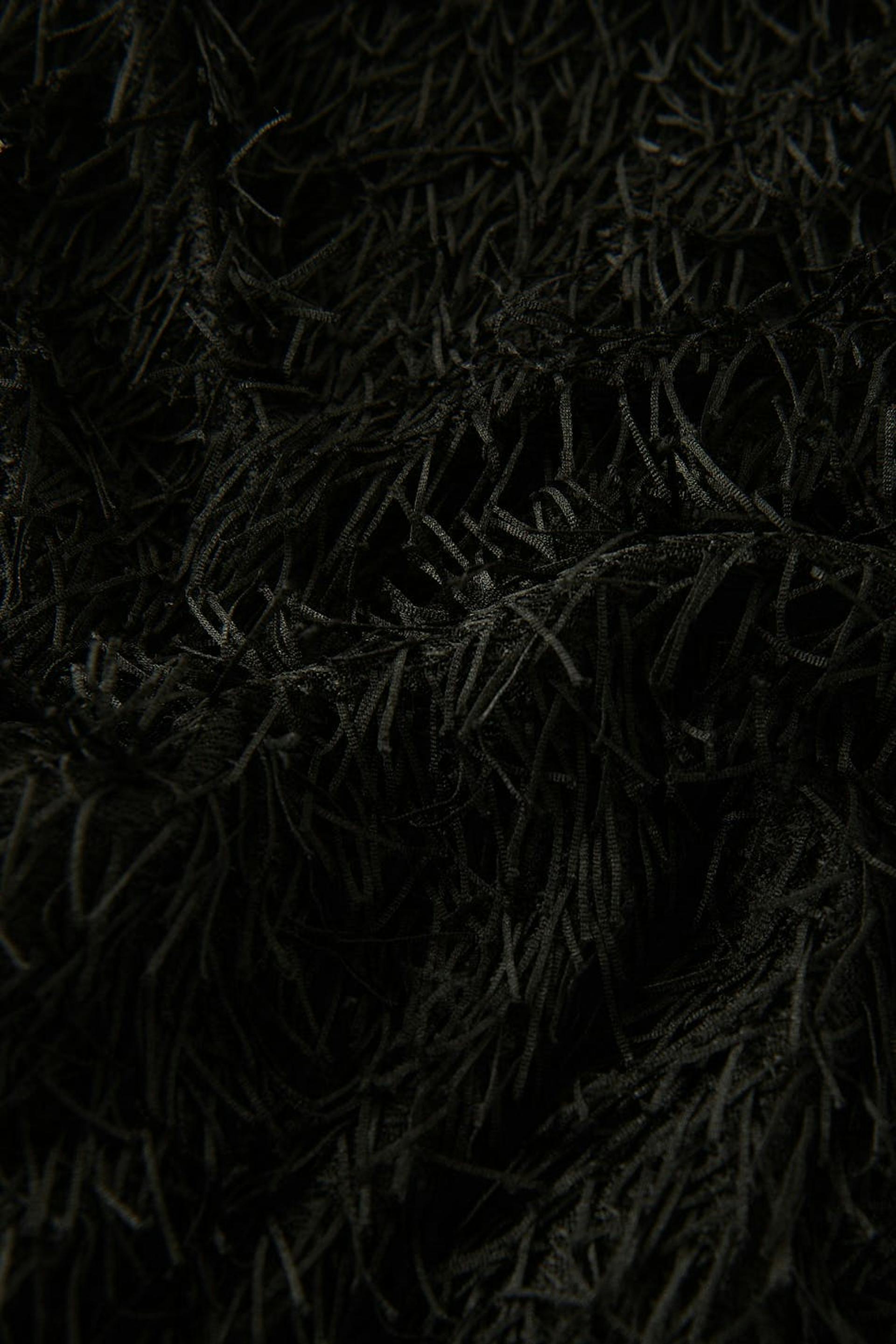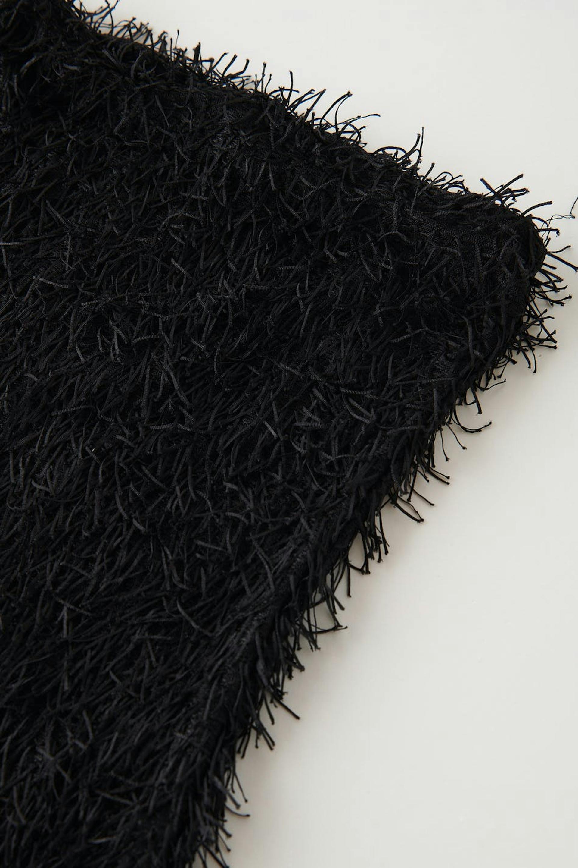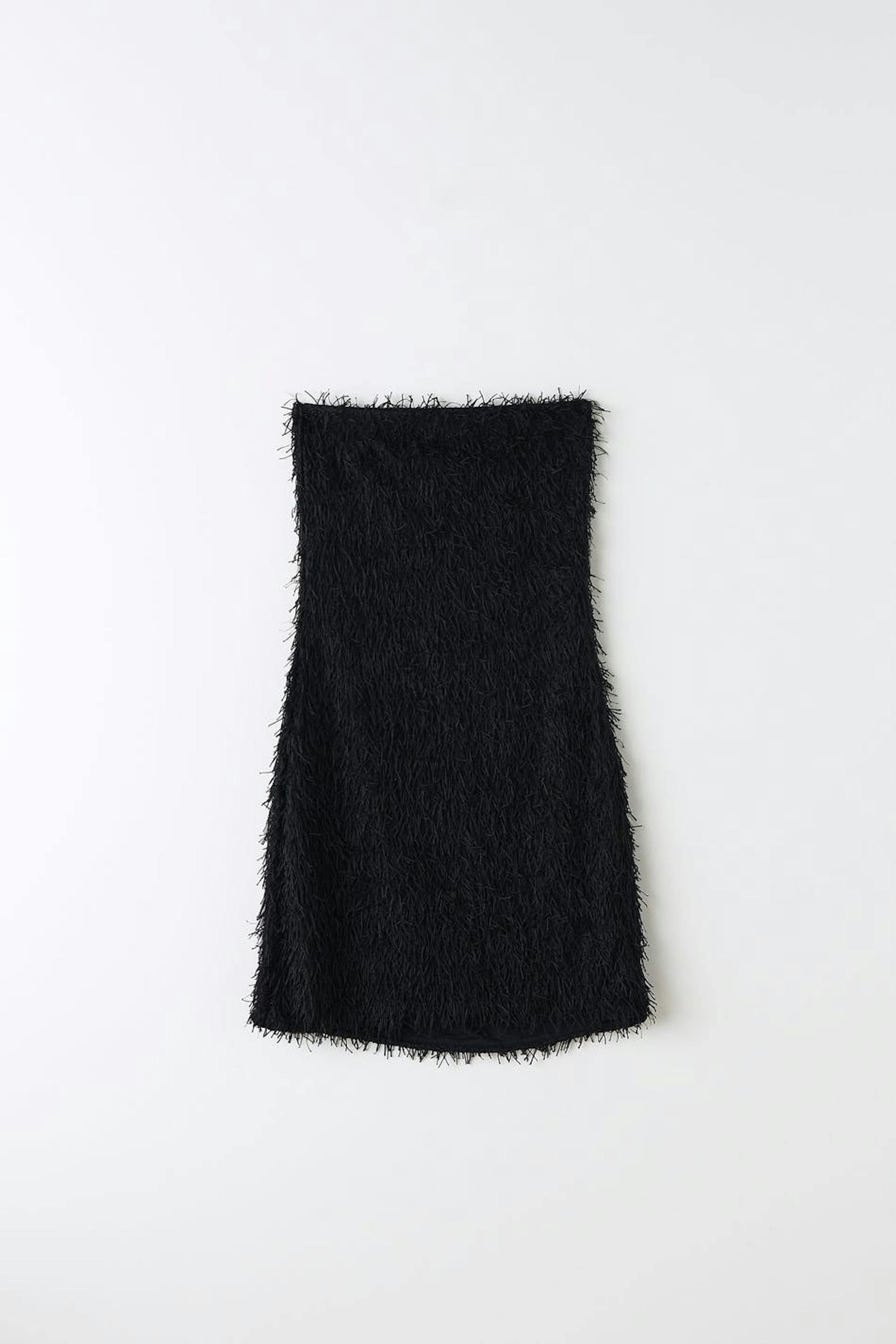 Kurzes Schlauchkleid mit einer Qualität im Federlook. Das Kleid ist schwarz und hat ein elastisches Material.