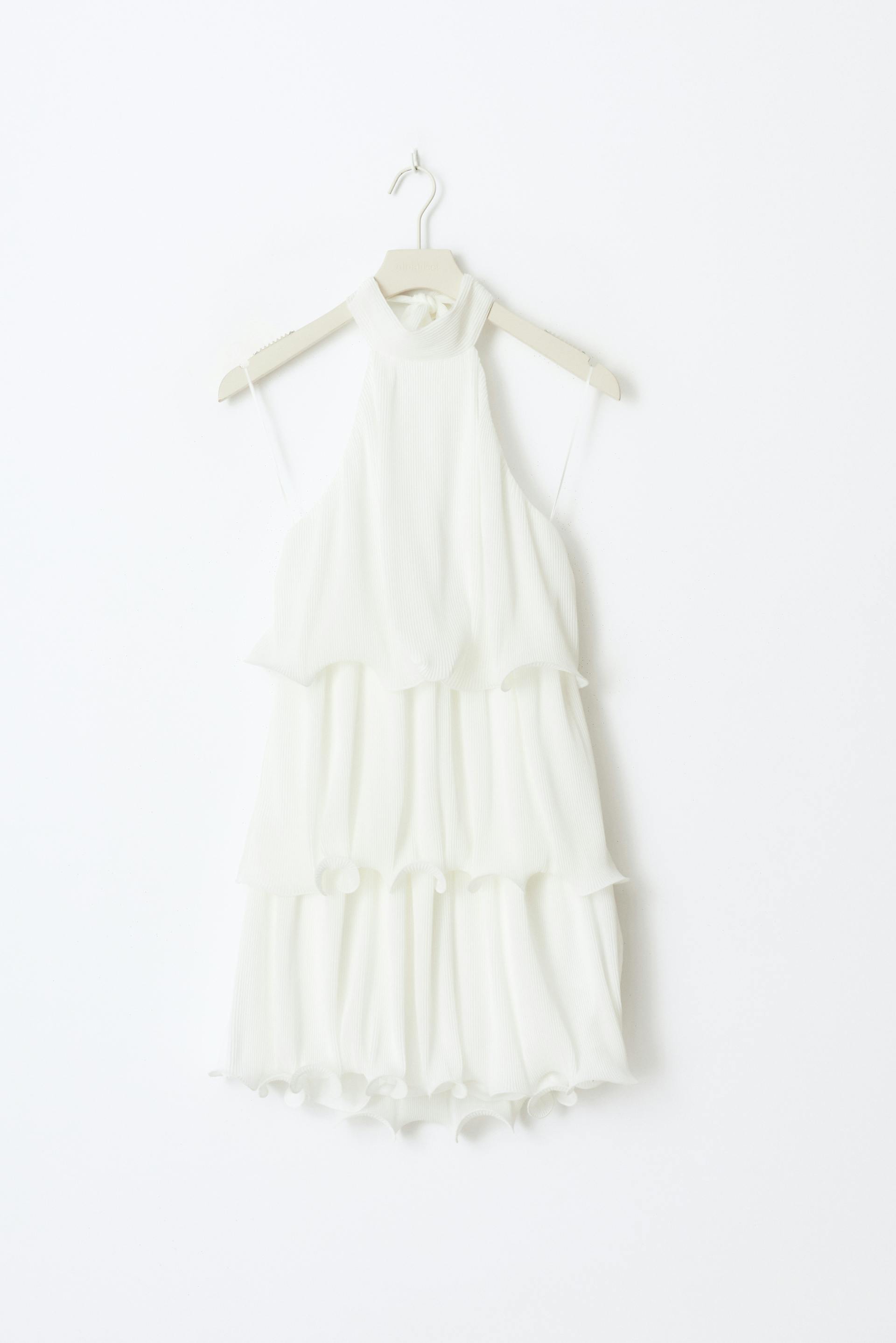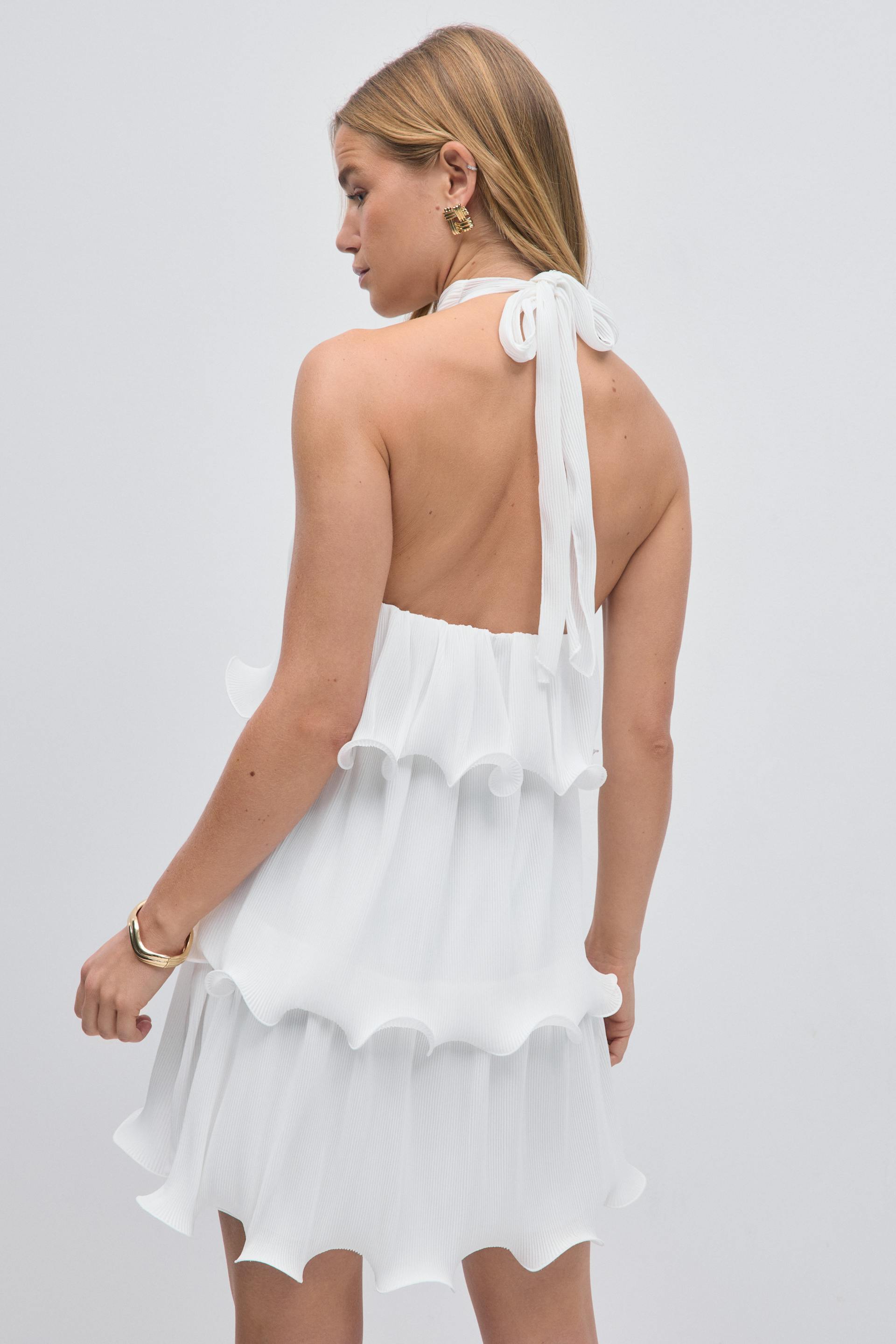 Plissiertes Kleid mit Kragen. Das Kleid ist weiβ und hat ärmelloses Design. Es hat offenen Rücken, Schleifen-Detail am Hals und Volants.
