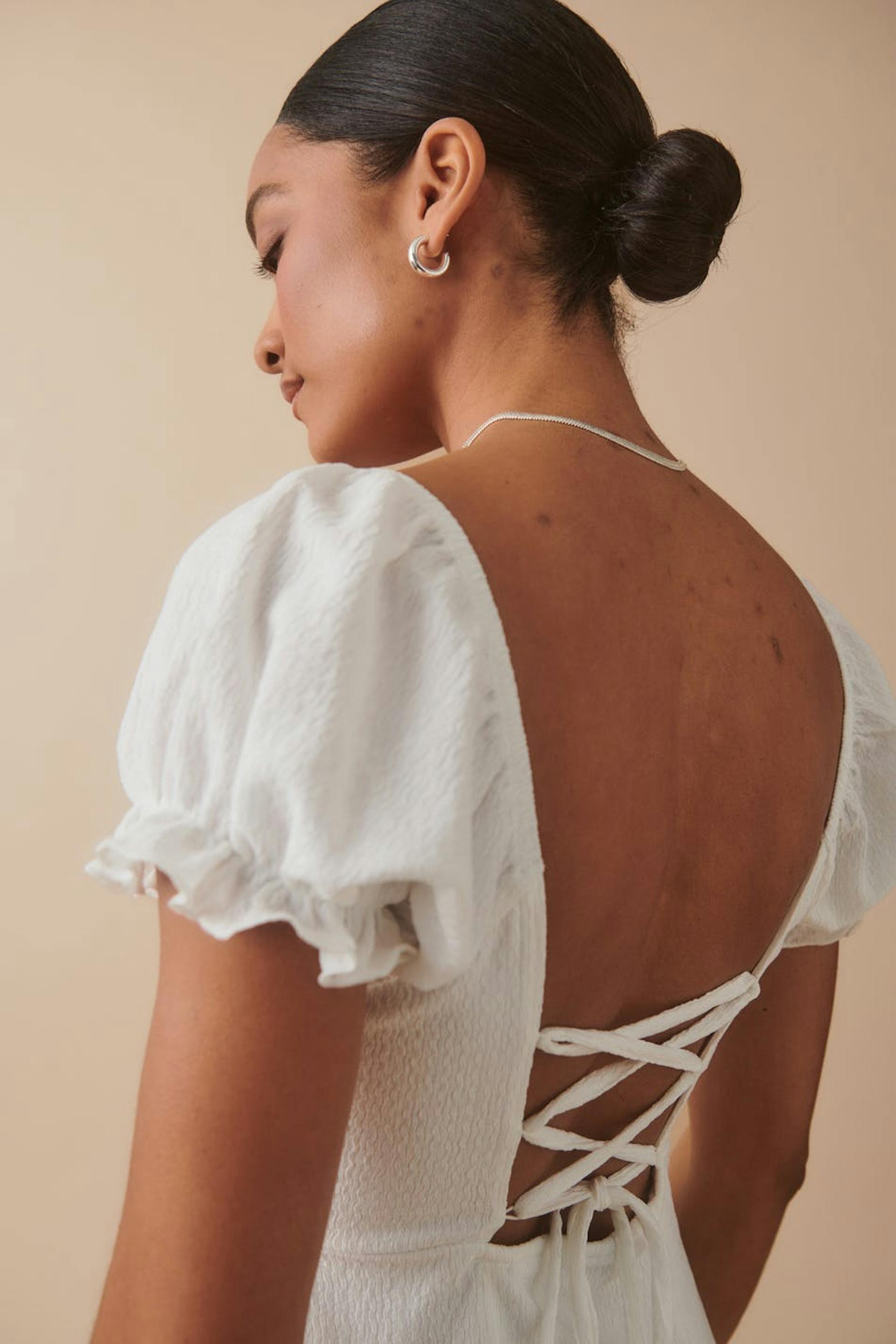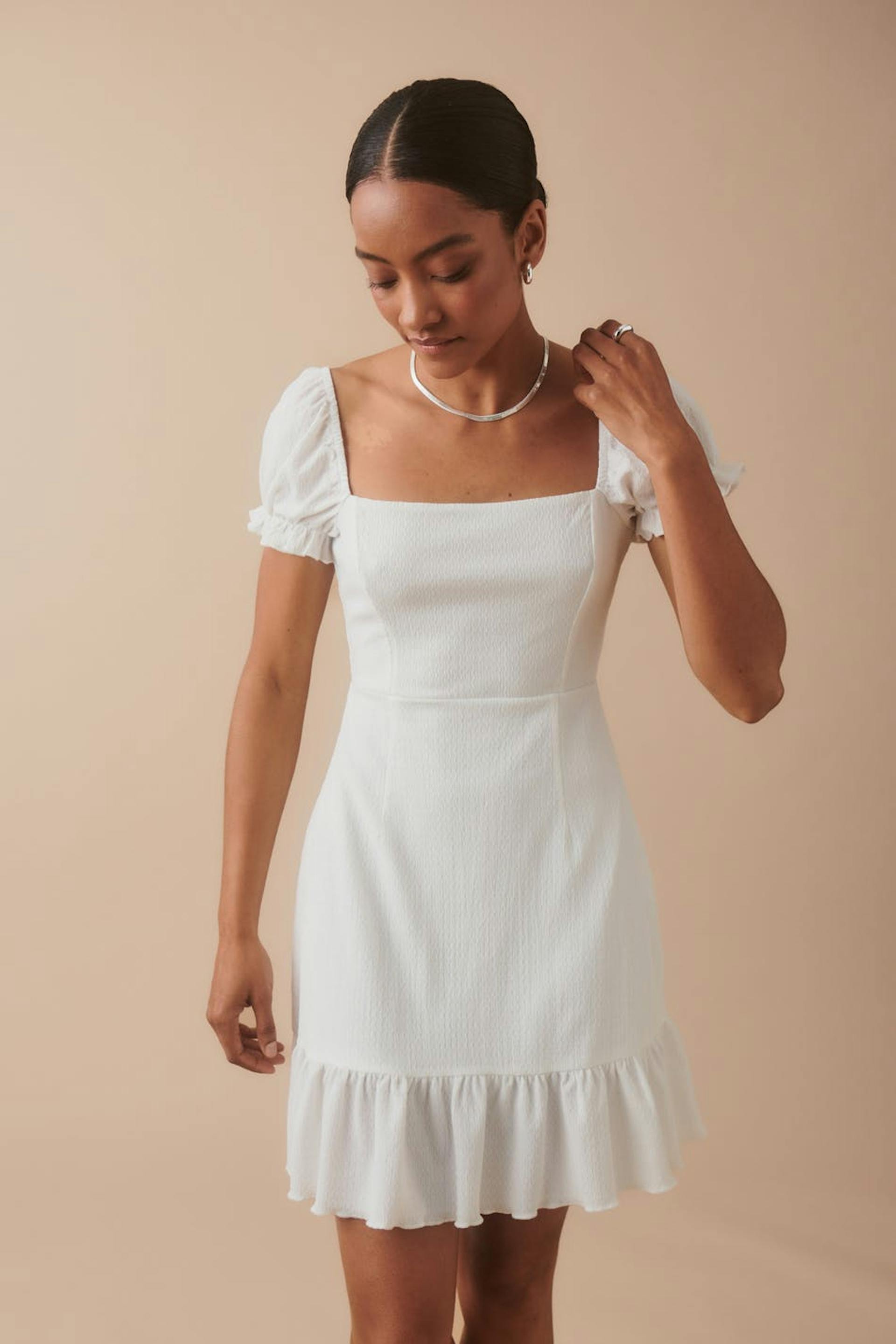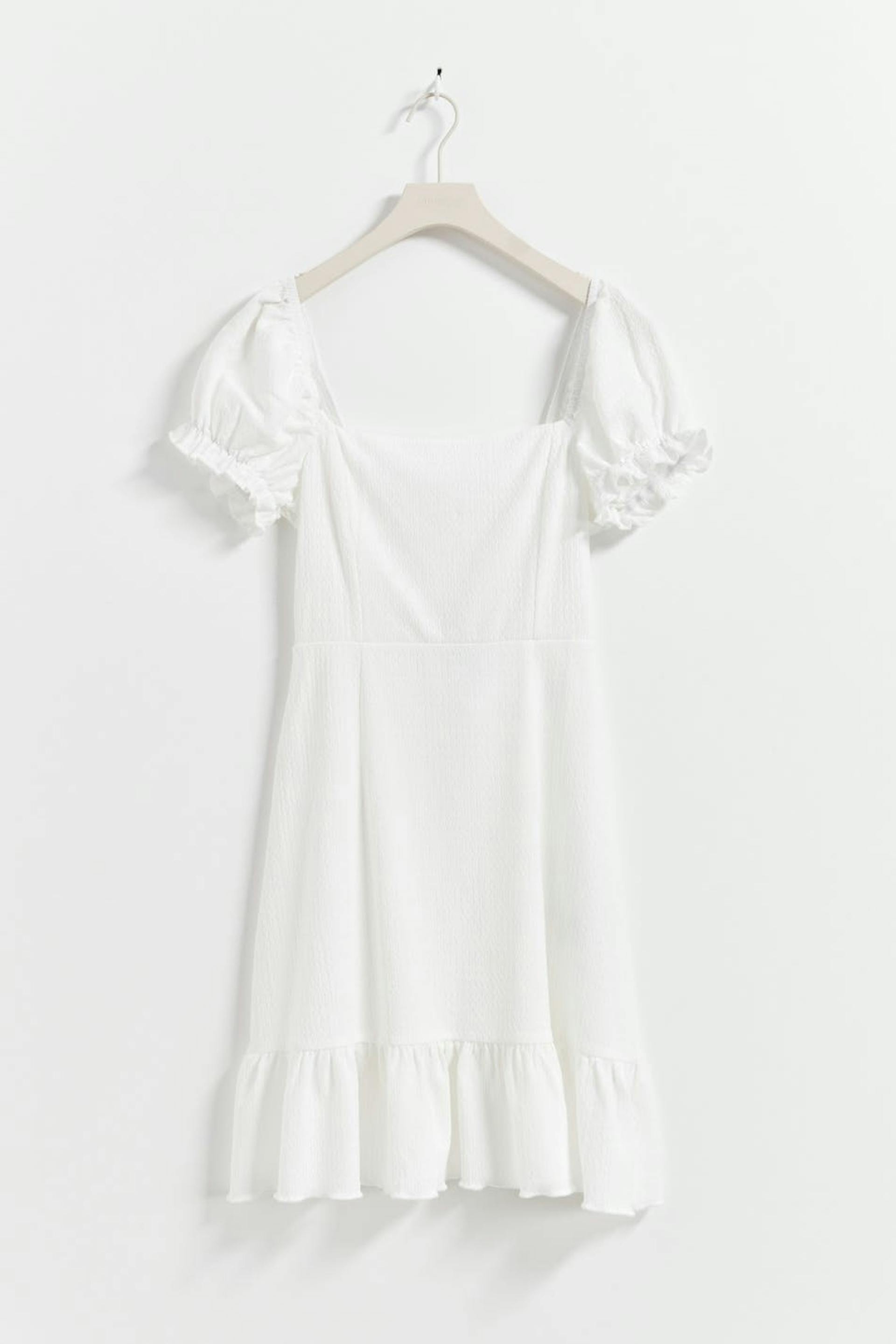 Kurzes Kleid mit Puffärmel. Das Kleid ist weiβ, gefüttert und kurzärmlig. Es hat normale Passform, Schnürung am Rücken, quadratischen Ausschnitt, offenen Rücken, Gummiband um die Schultern herum und Rüschenrock an den Ärmelenden und an der Unterkante.