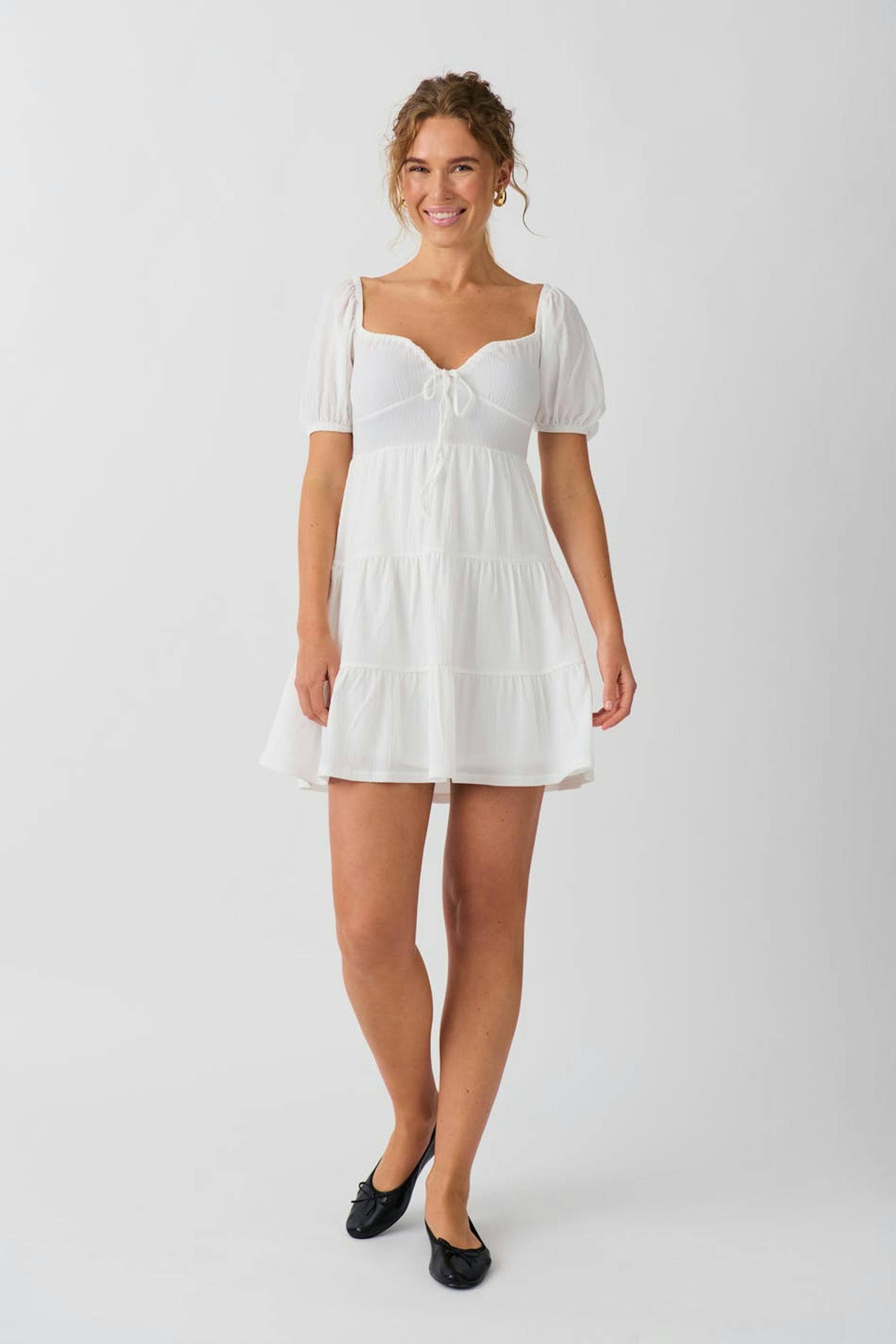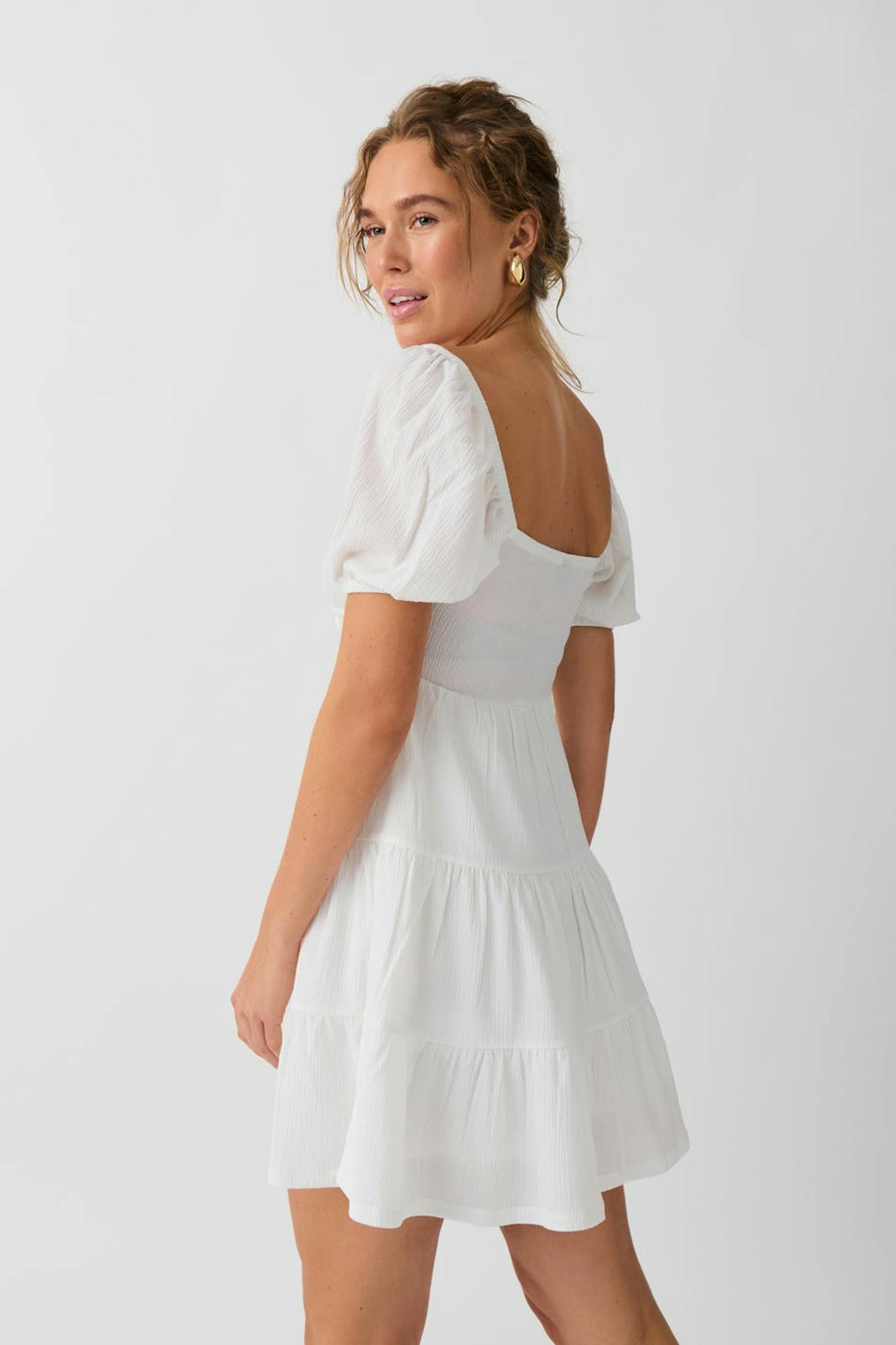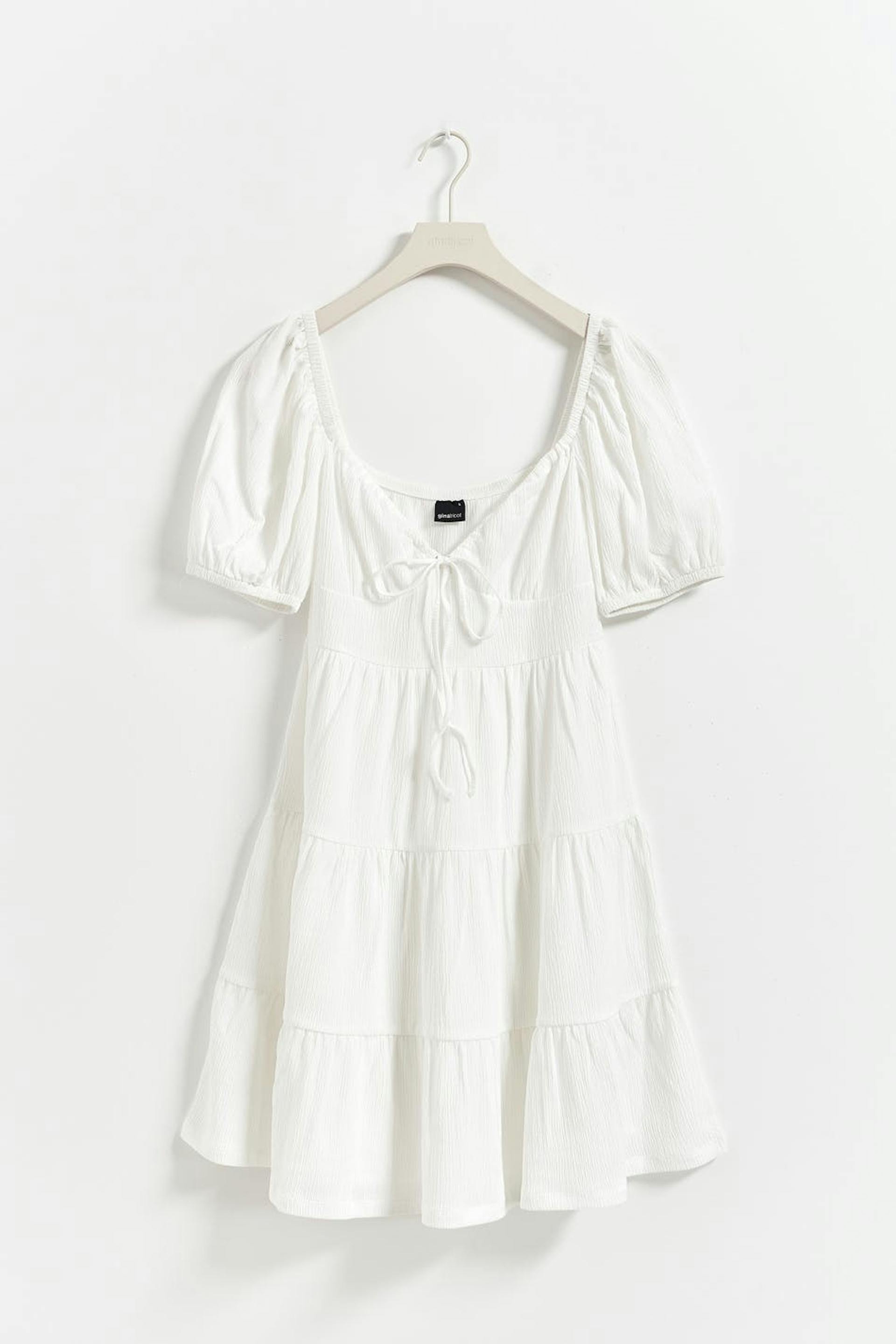 Kurzes Kleid aus Jersey mit Rüschen-Details an der Unterkante. Das Kleid ist weiβ und hat Selbstbindung vorne. Es hat normale Passform, V-Ausschnitt, kurzen Puffärmel und Gummiband an den Ärmelenden und um die Schultern herum.