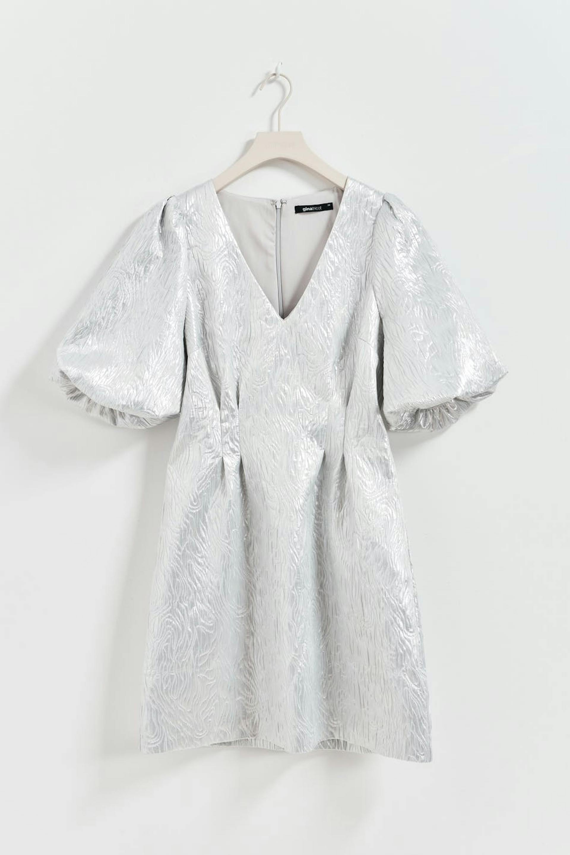 Kleid mit Jacquard-Gewebe und kurzen Puffärmeln. Das Kleid ist silbern, kurz und gemustert. Es hat V-Ausschnitt, Reißverschluss am Rücken und Falten-Details vorne und hinten.