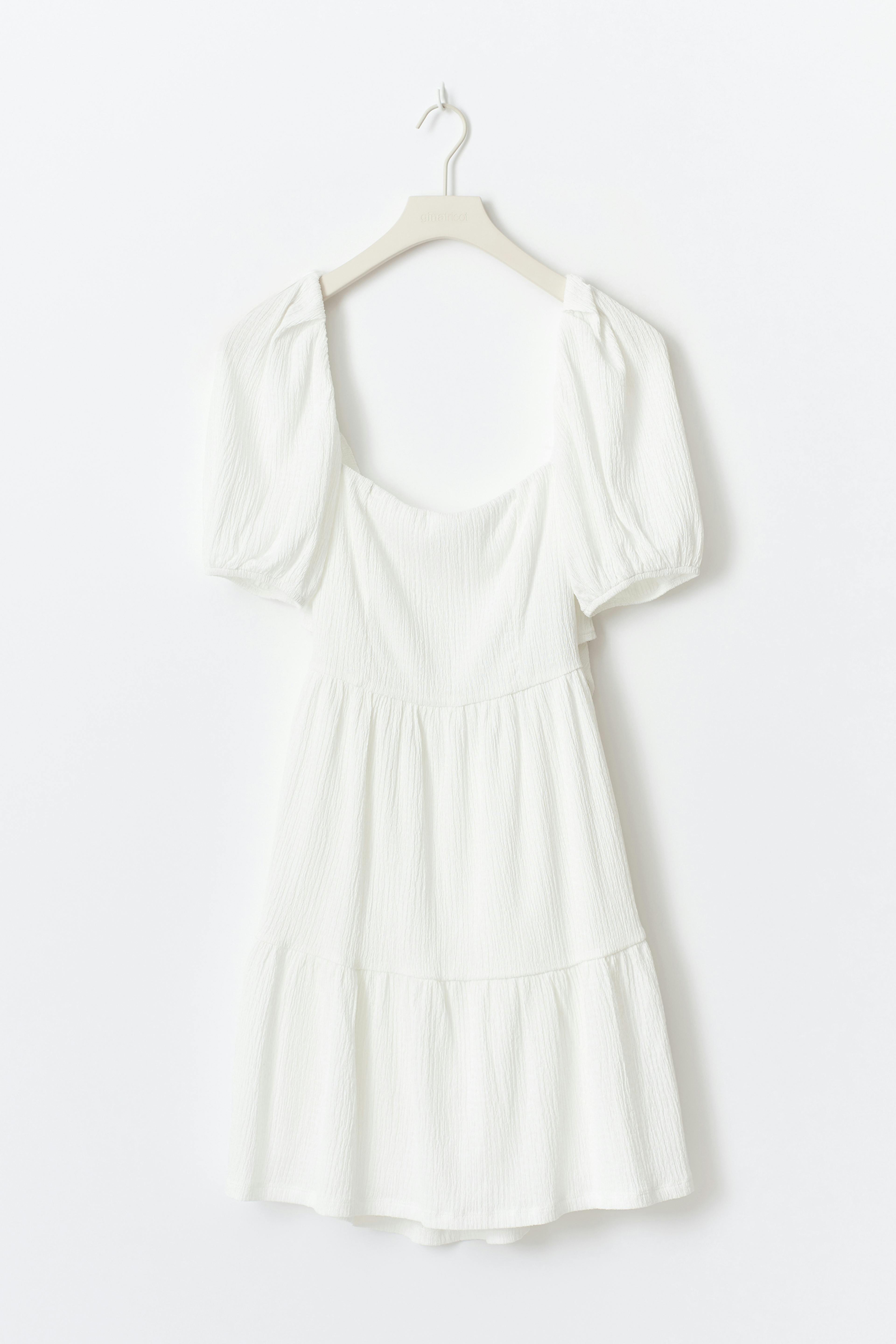 Kleid mit kurzen Puffärmeln. Das Kleid ist weiβ und hat Rüschenröcke. Es hat quadratischen Ausschnitt, normale Länge, normale Passform, elastische Taille, eine Selbstbindung am Rücken, strukturiertes Tuch und Futter.