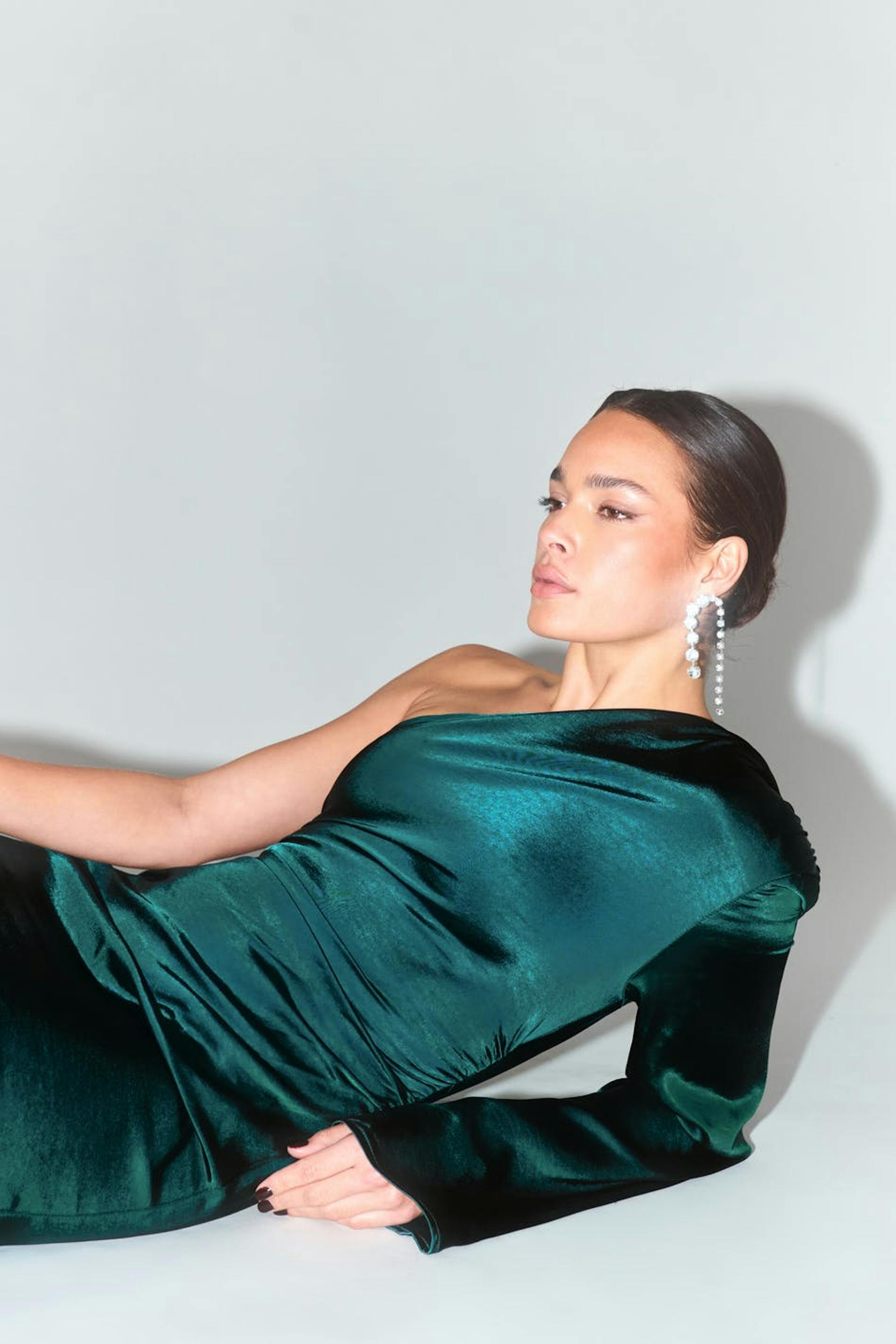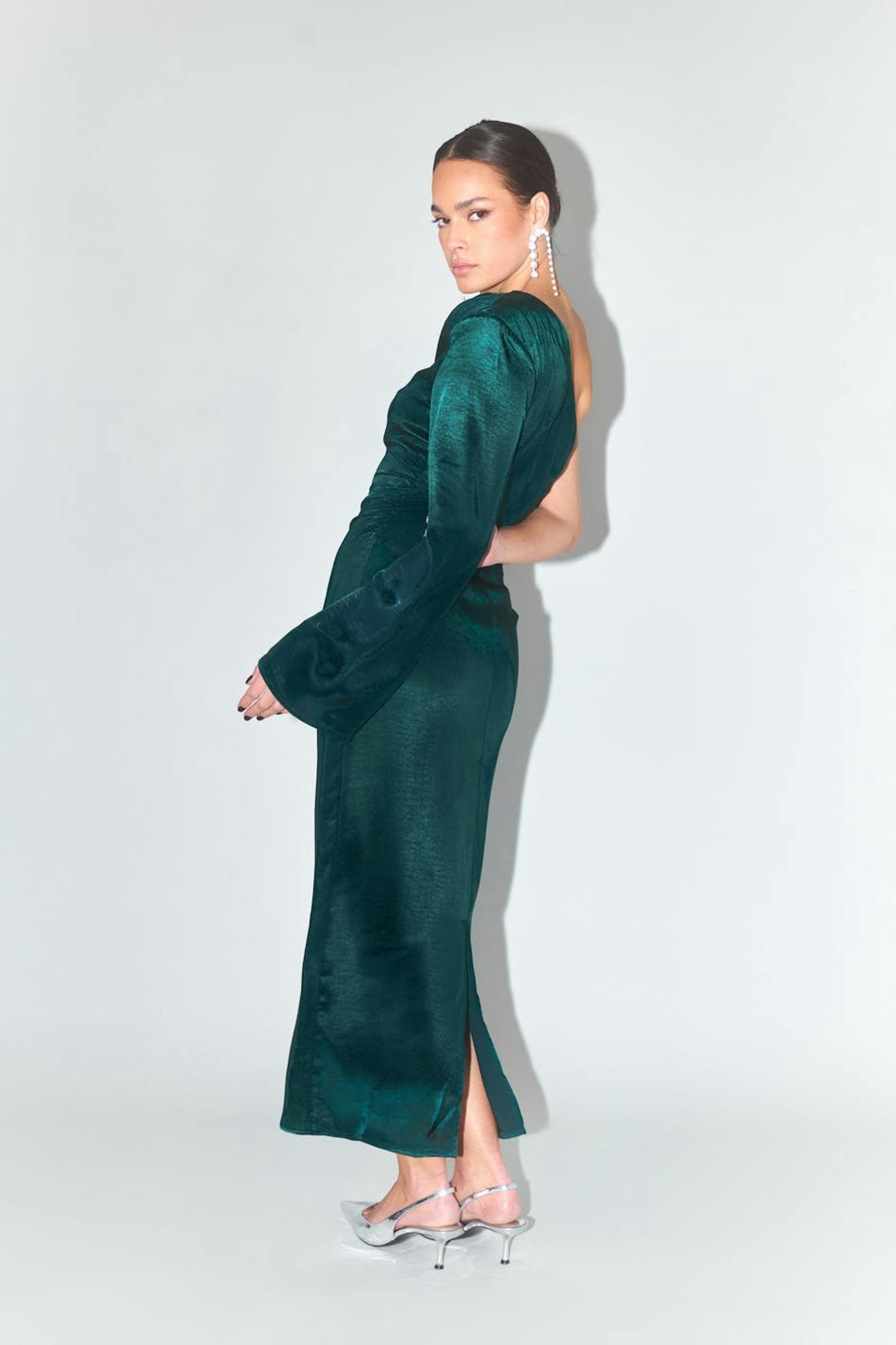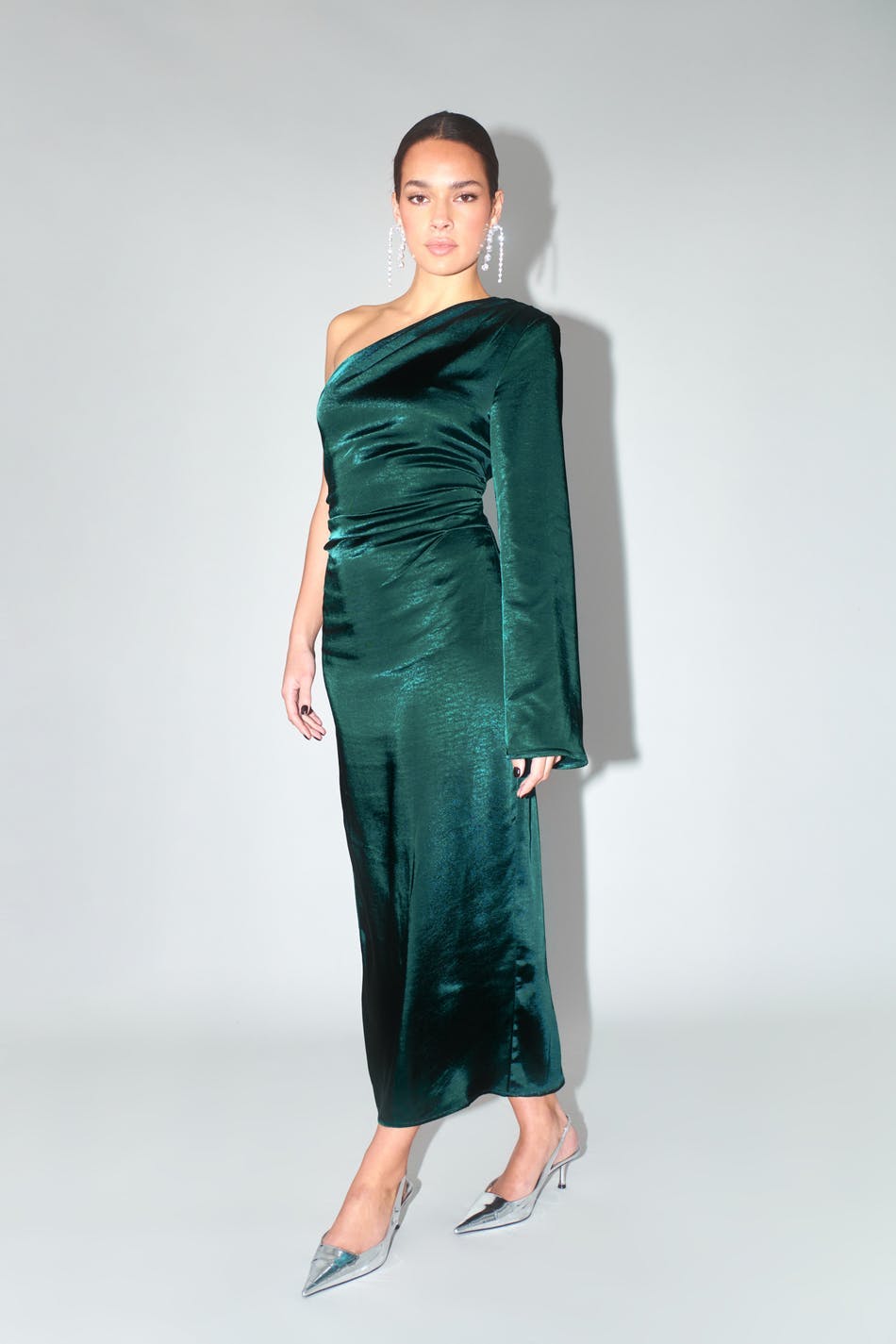 Eine Schulter aus Satin mit langem Ärmel. Das Kleid ist grün und hat Raffungen in der Taille und an der Schulter. Es hat Reißverschluss in der Seitennaht und Midi-Länge.