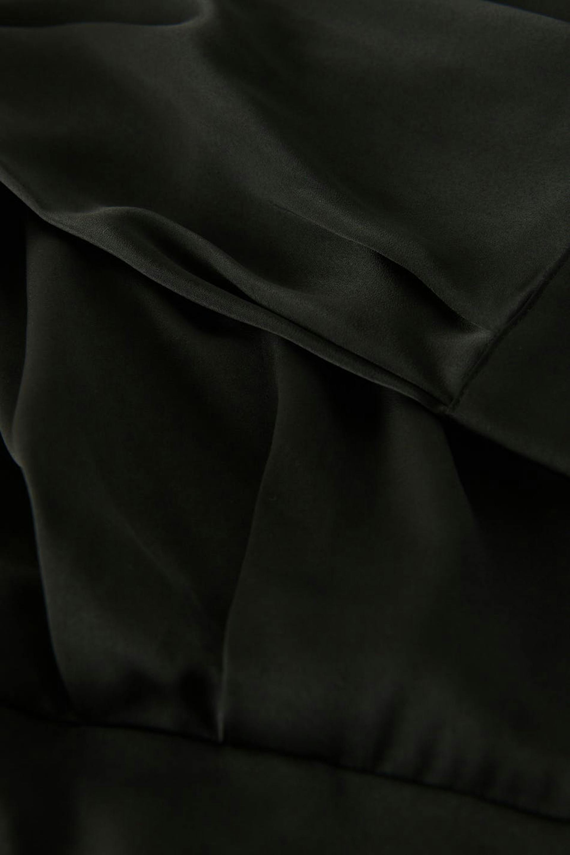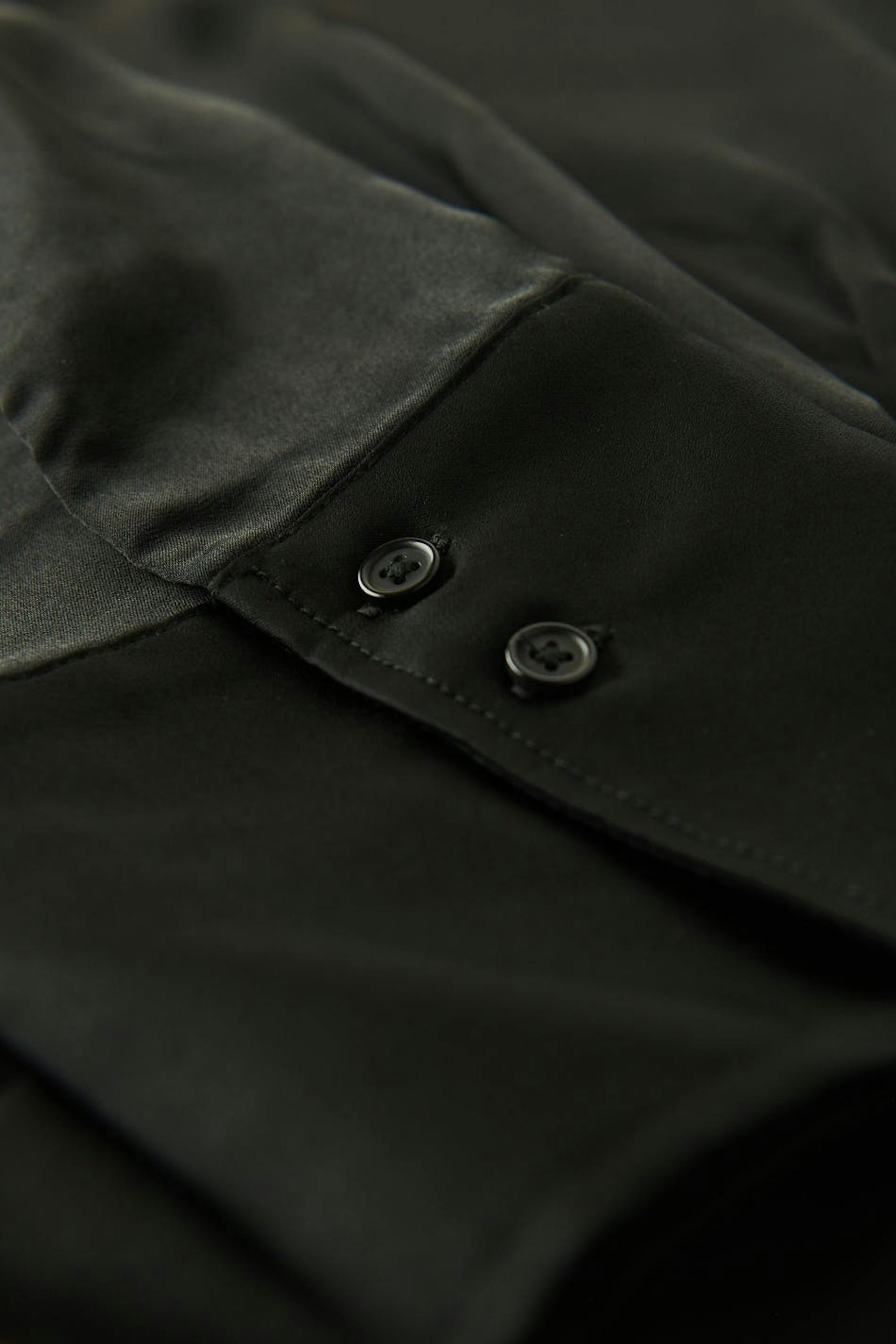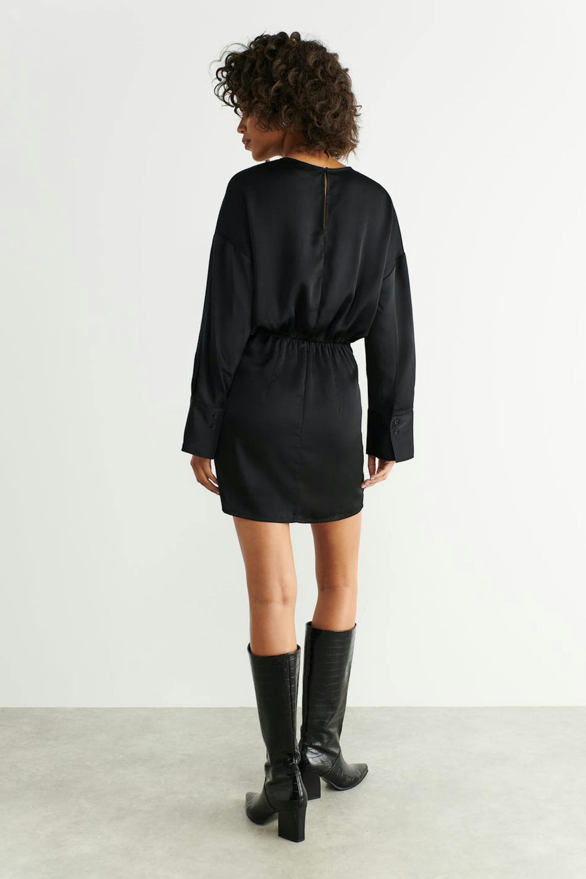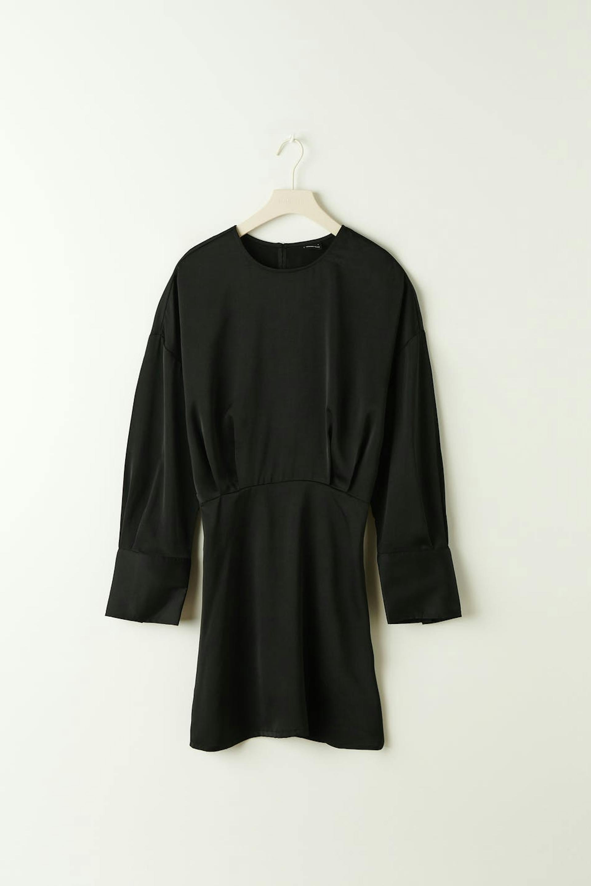 Langärmliges Satinkleid mit Falten-Details vorne. Das Satinkleid ist schwarz und hat Drop-Schultern. Es hat weit-geschnittenen Style auf der Oberseite, taillierten Rock, Gummiband auf der Rückseite, Manschetten und Schlüssellochöffnung mit Knopf am Rücken.