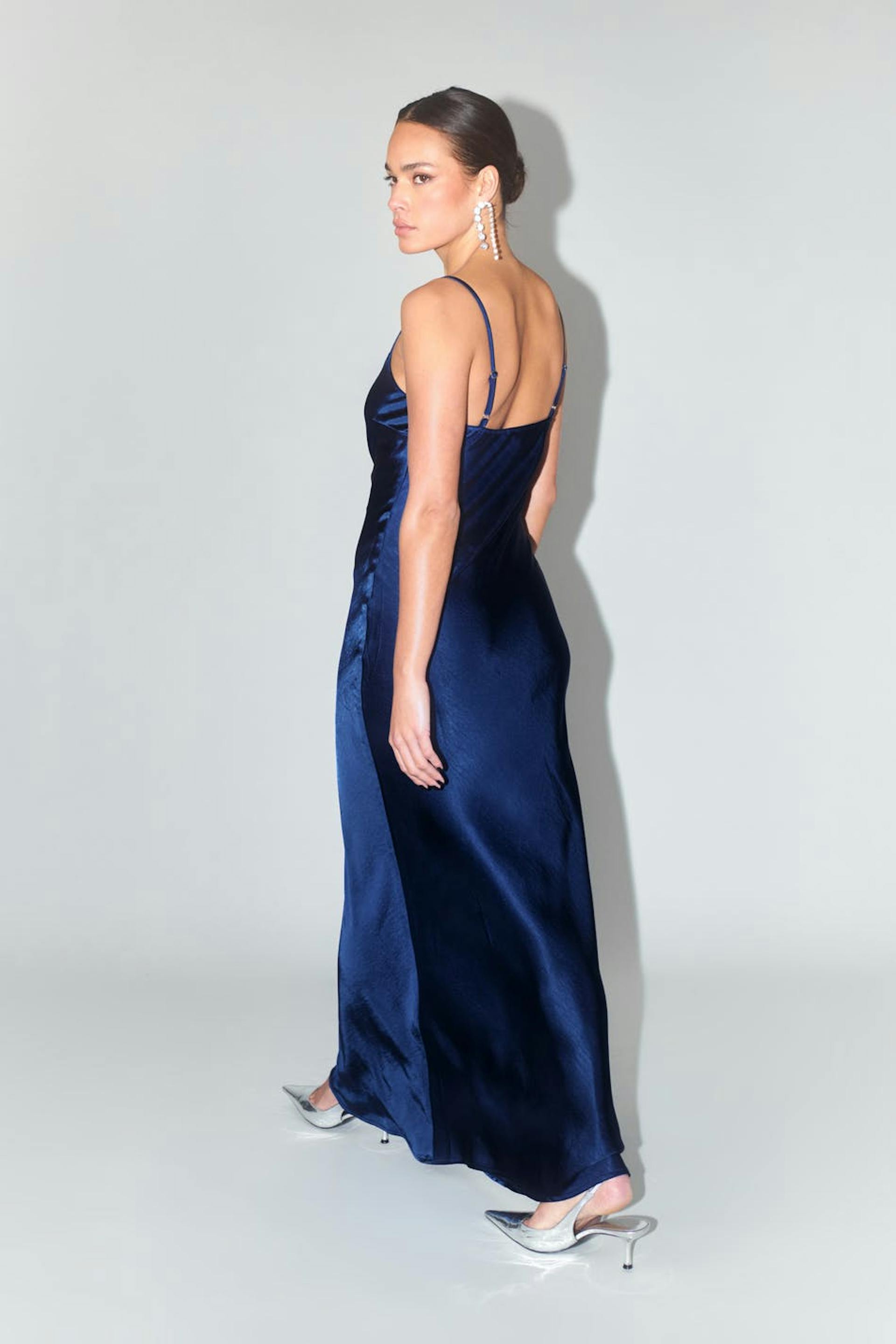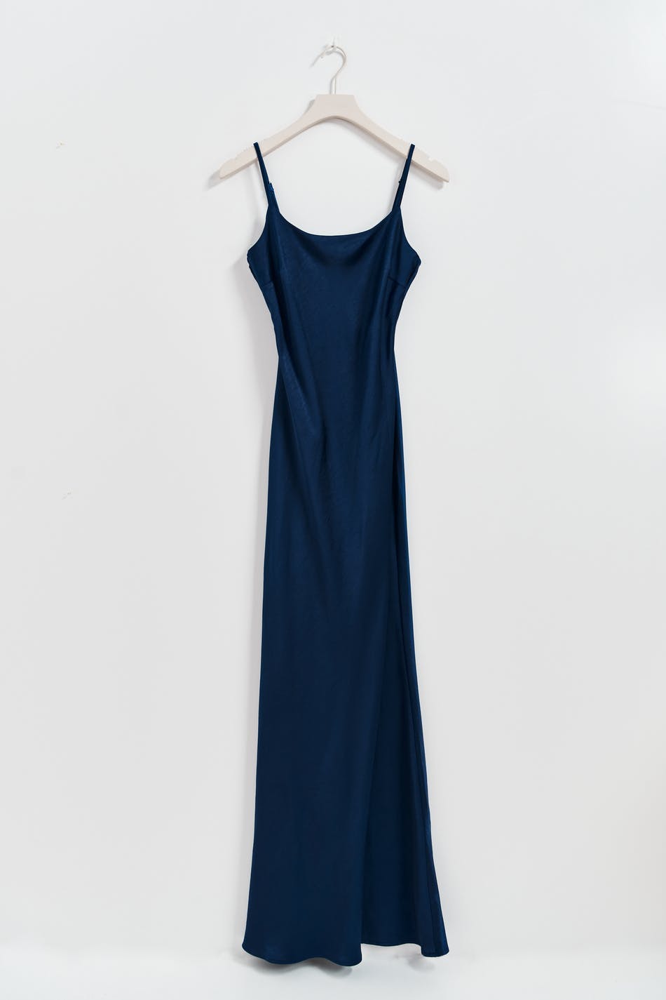Langes Satinkleid mit dünnen, verstellbaren Trägerbändern. Das Satinkleid ist blau und hat weiche, glänzende Qualität.