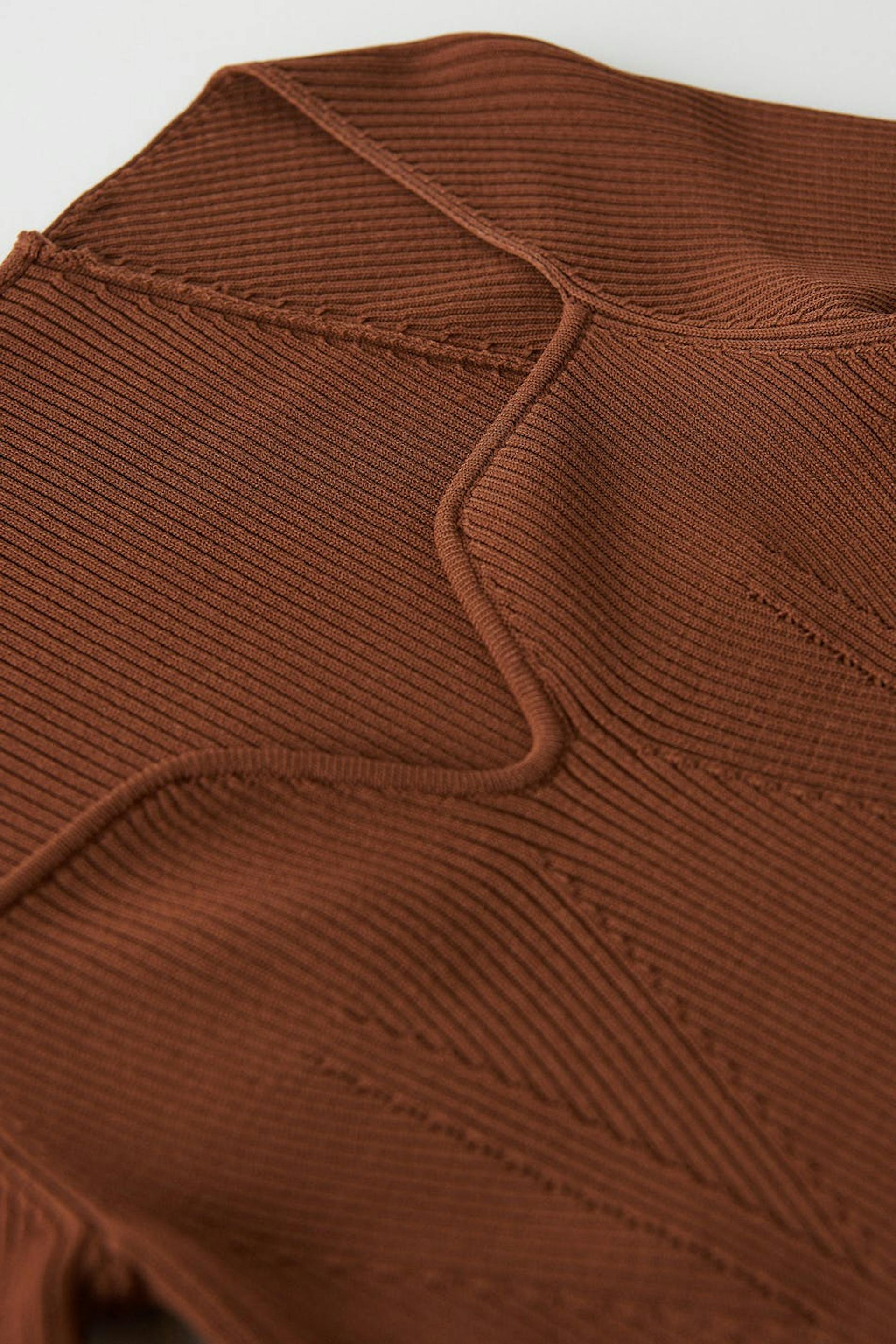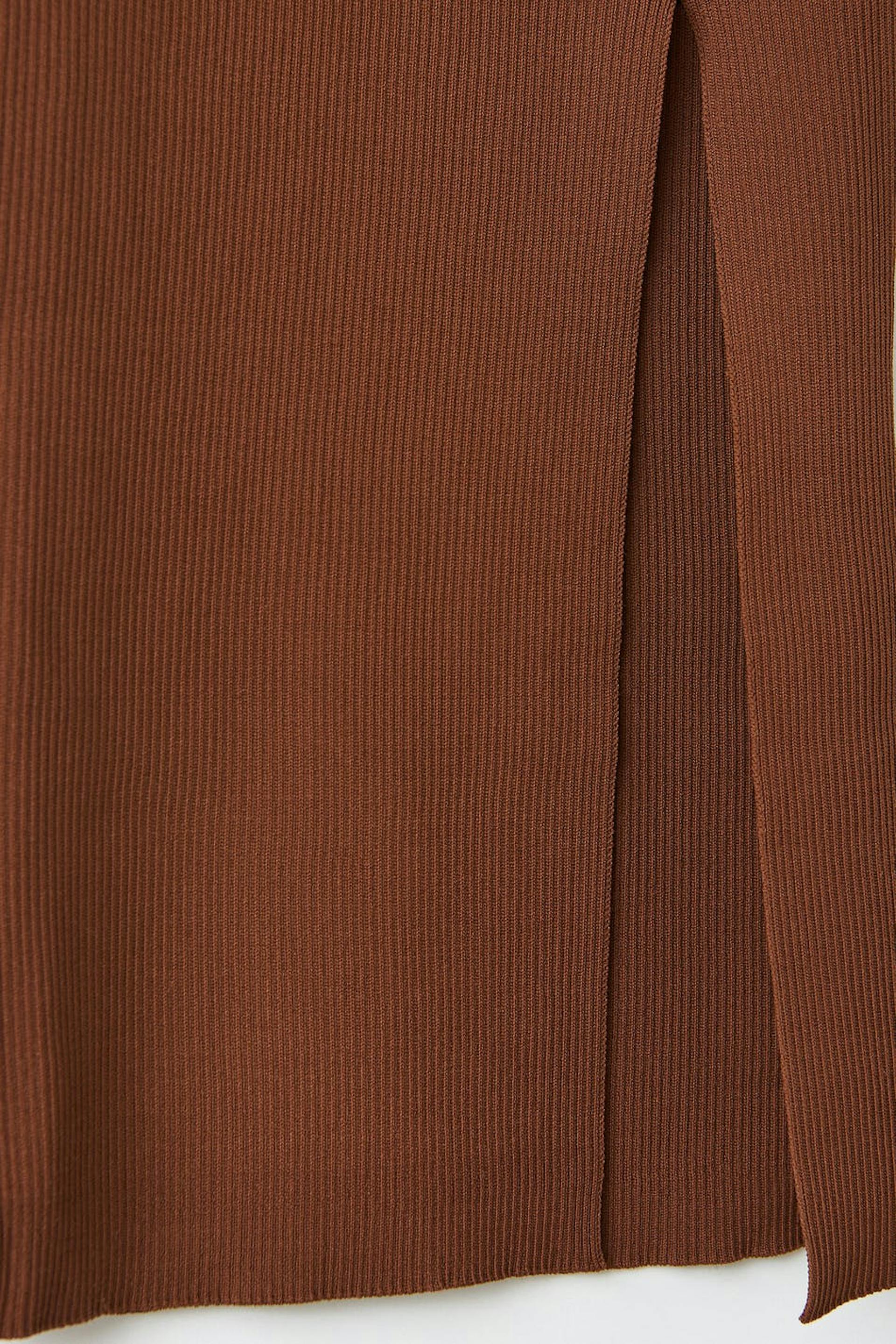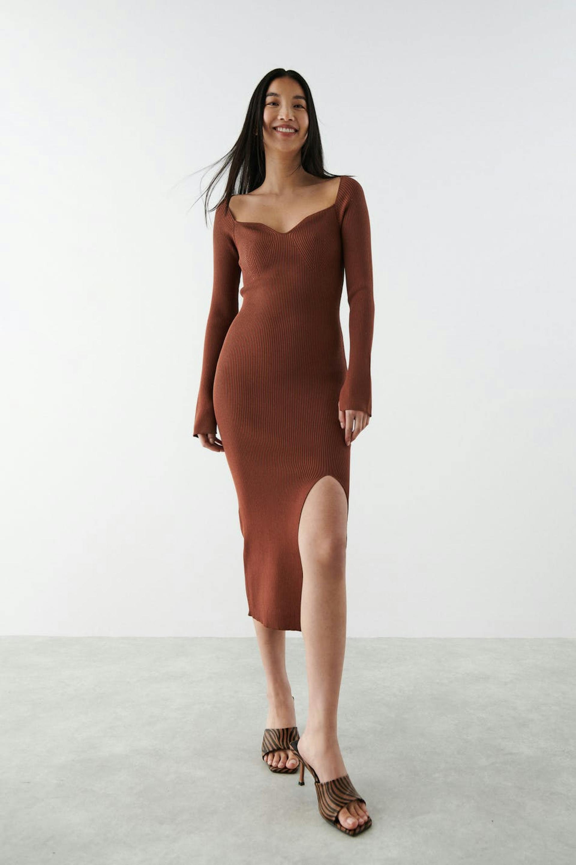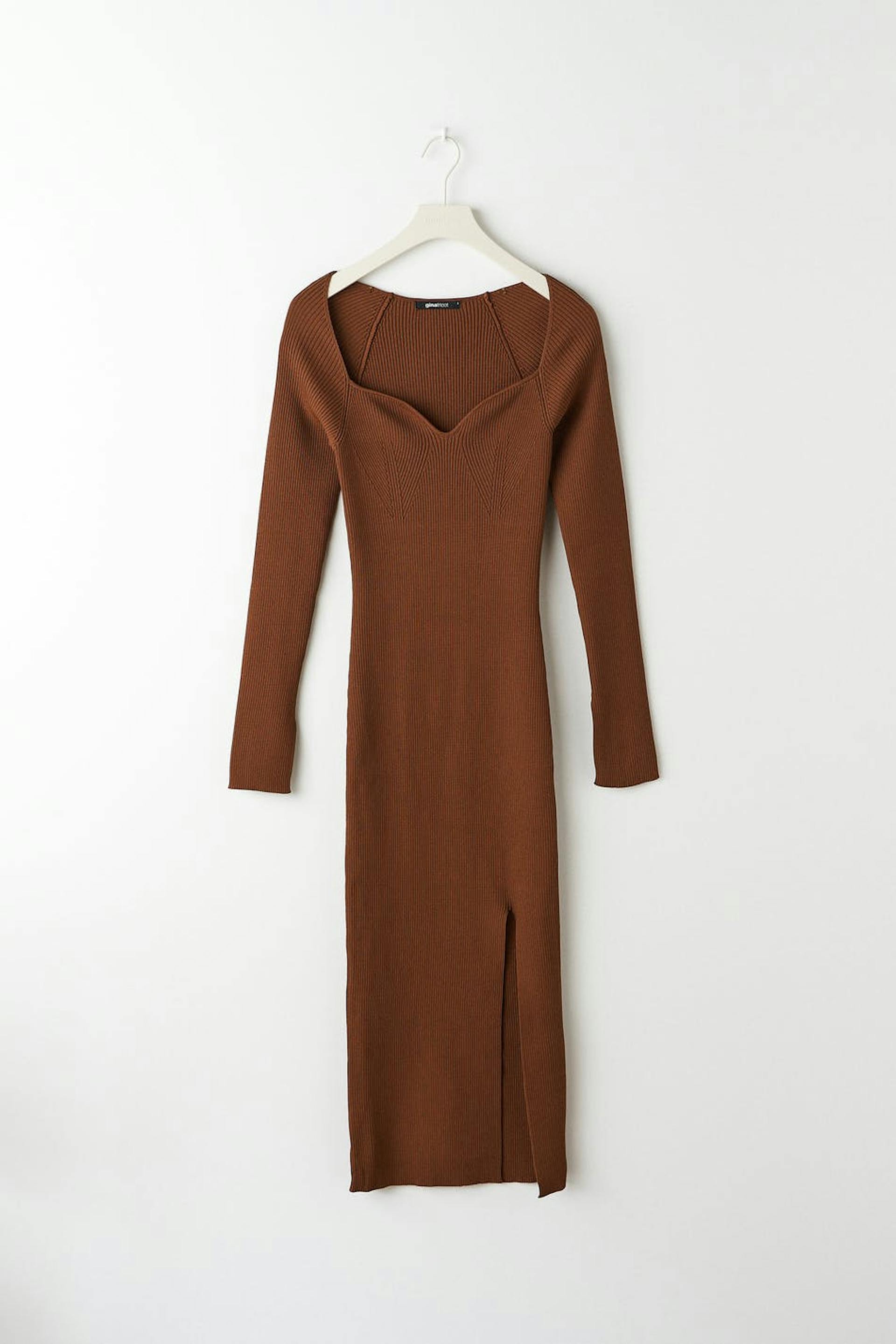 Gestricktes Kleid mit Schlitz an der Seite. Das Kleid ist perfekt für eine Party, braun und gerippt. Es hat eine Midi-Länge, Herzausschnitt, taillierte Passform und lange Ärmel mit Schlitz an den Ärmelenden.
