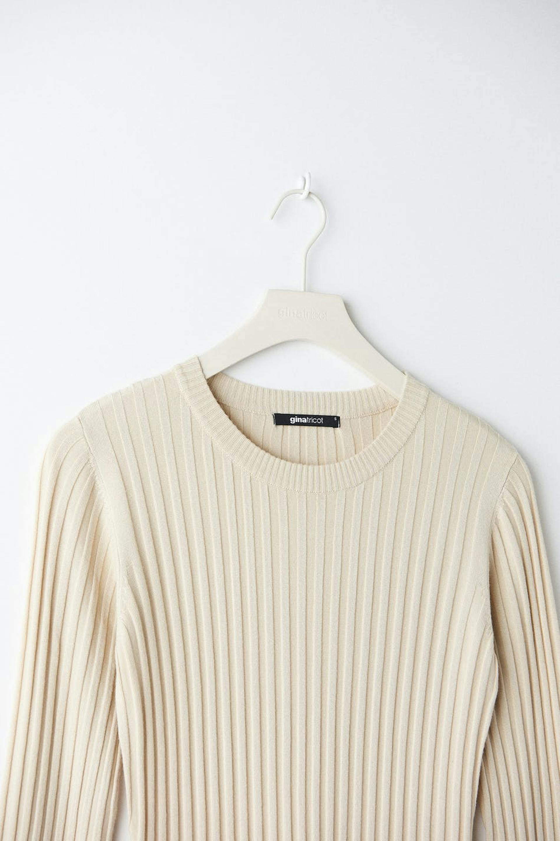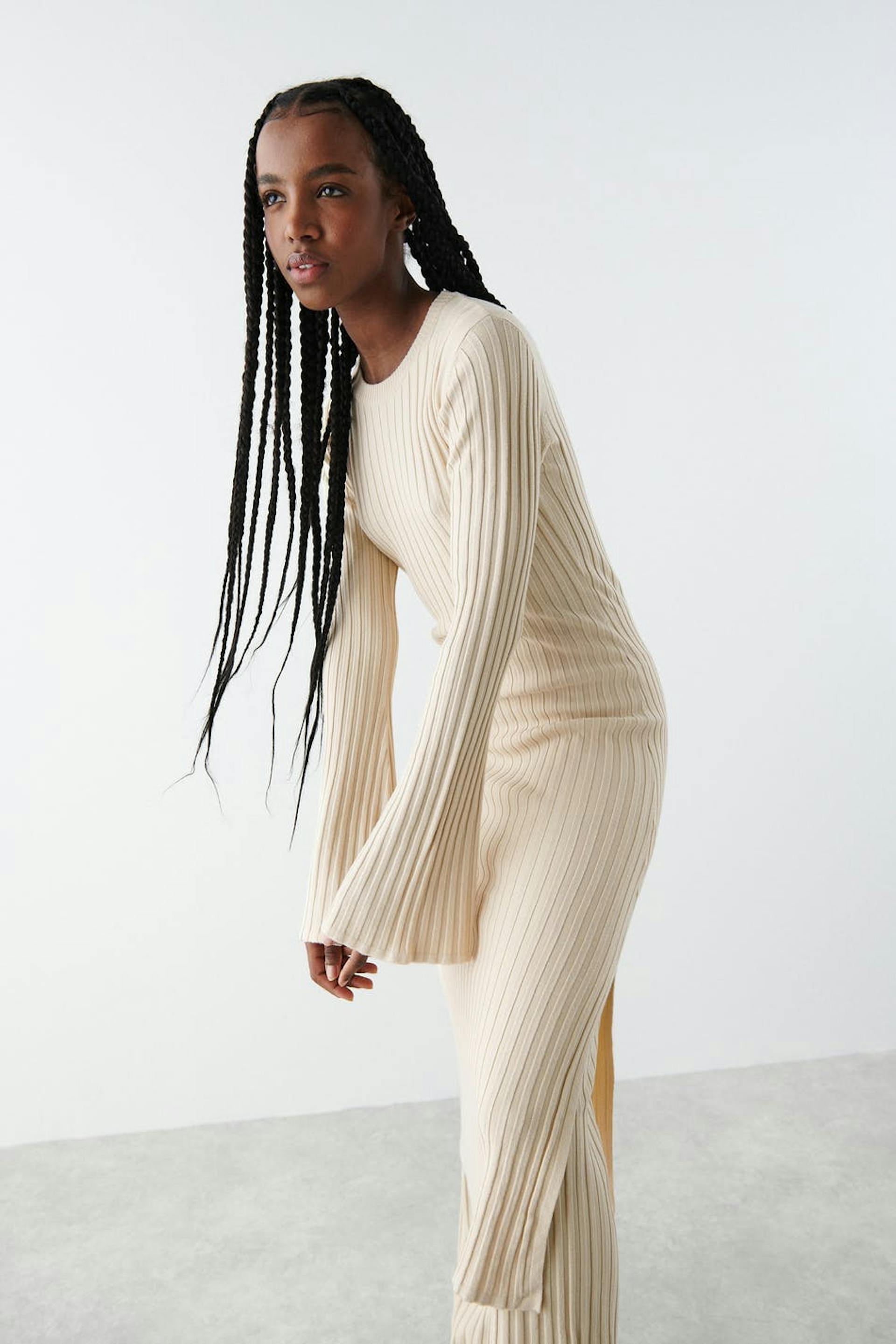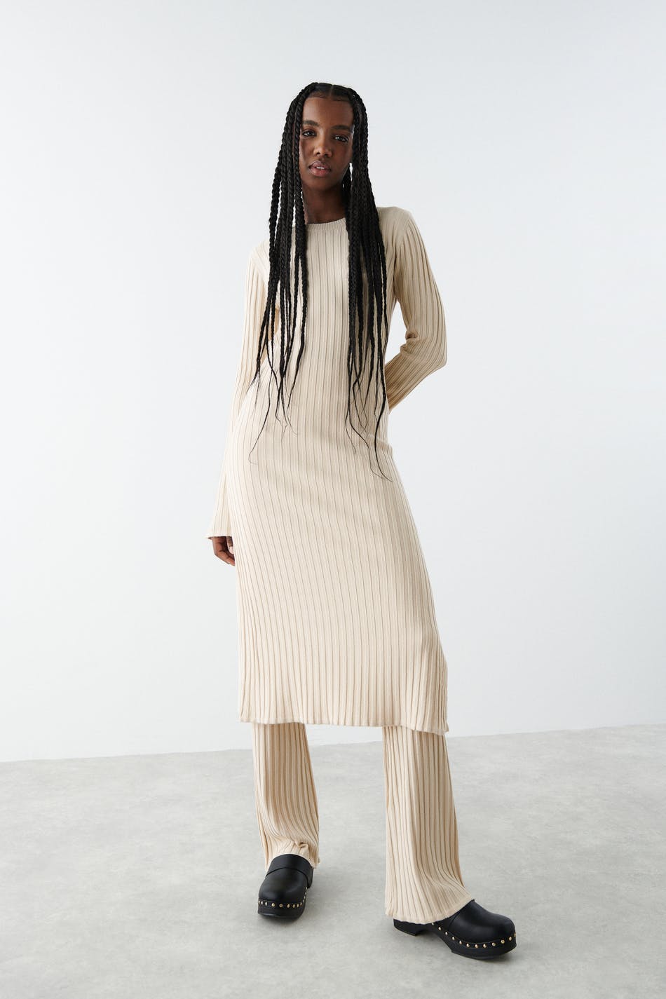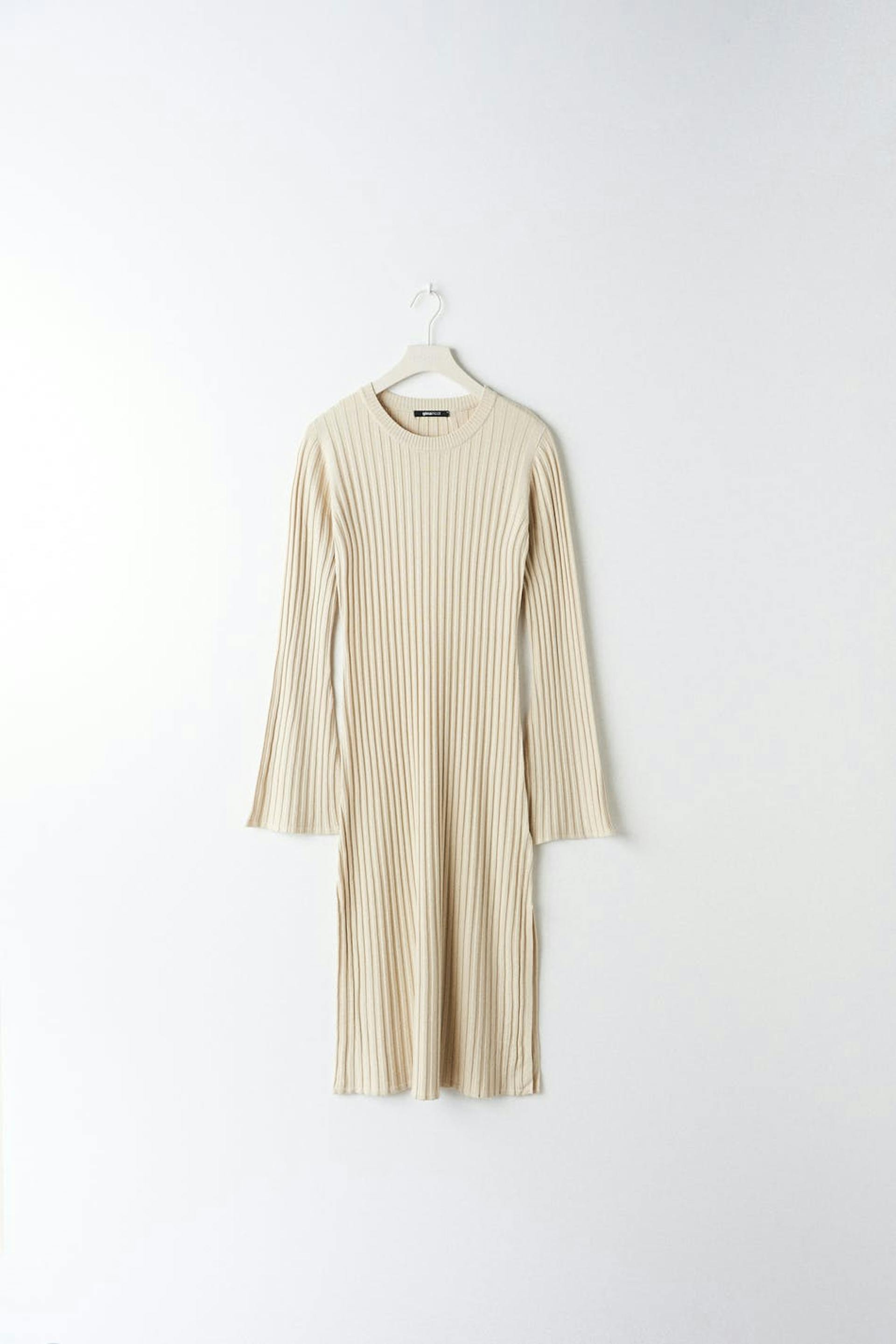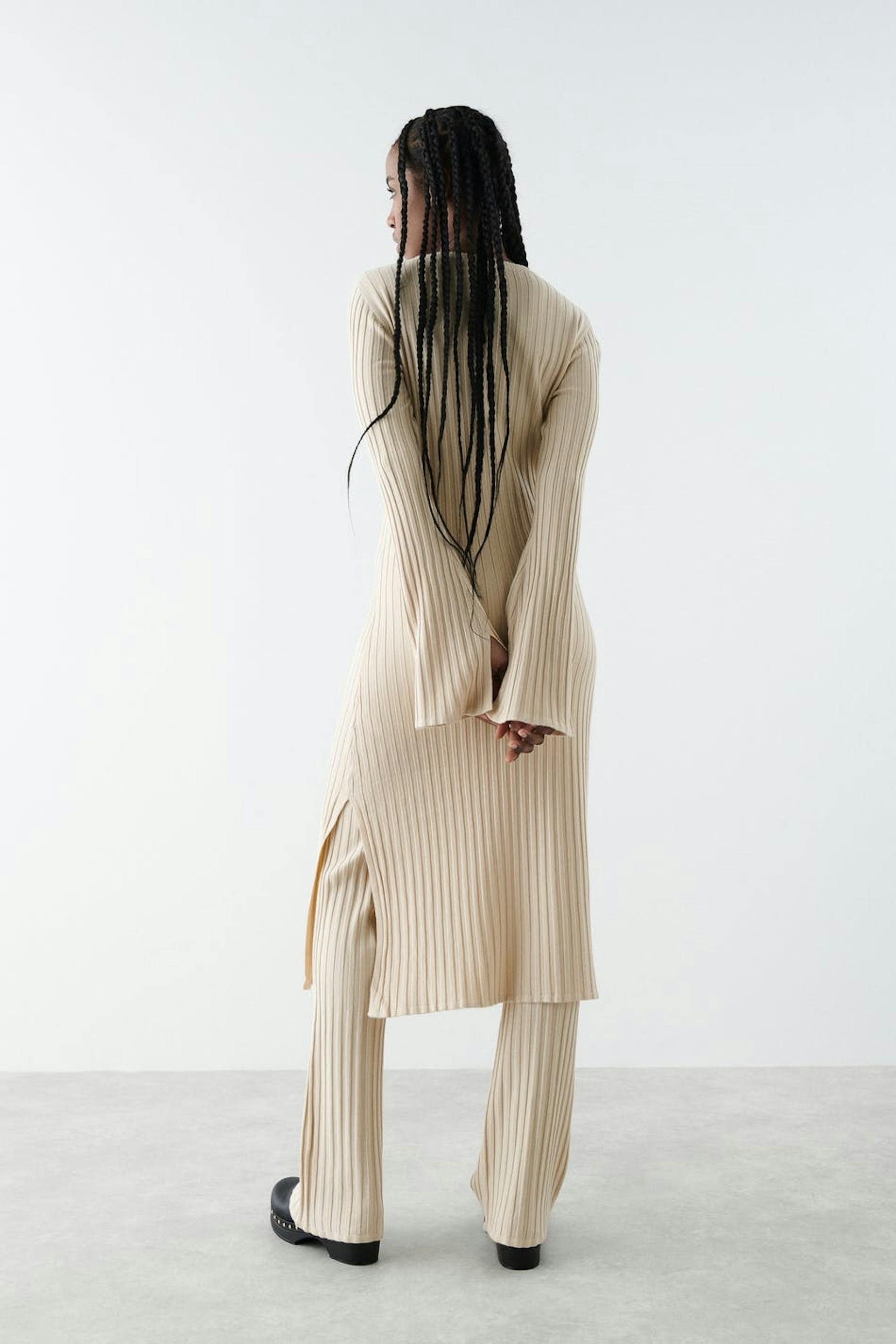 Langärmliges Strickkleid mit Schlitz unten. Das Kleid ist beige und hat eine gerippte Qualität. Es ist hergestellt aus Viskose von EcoVero™ und hat einen Rundhalsausschnitt und Laternenärmel mit Schlitz.