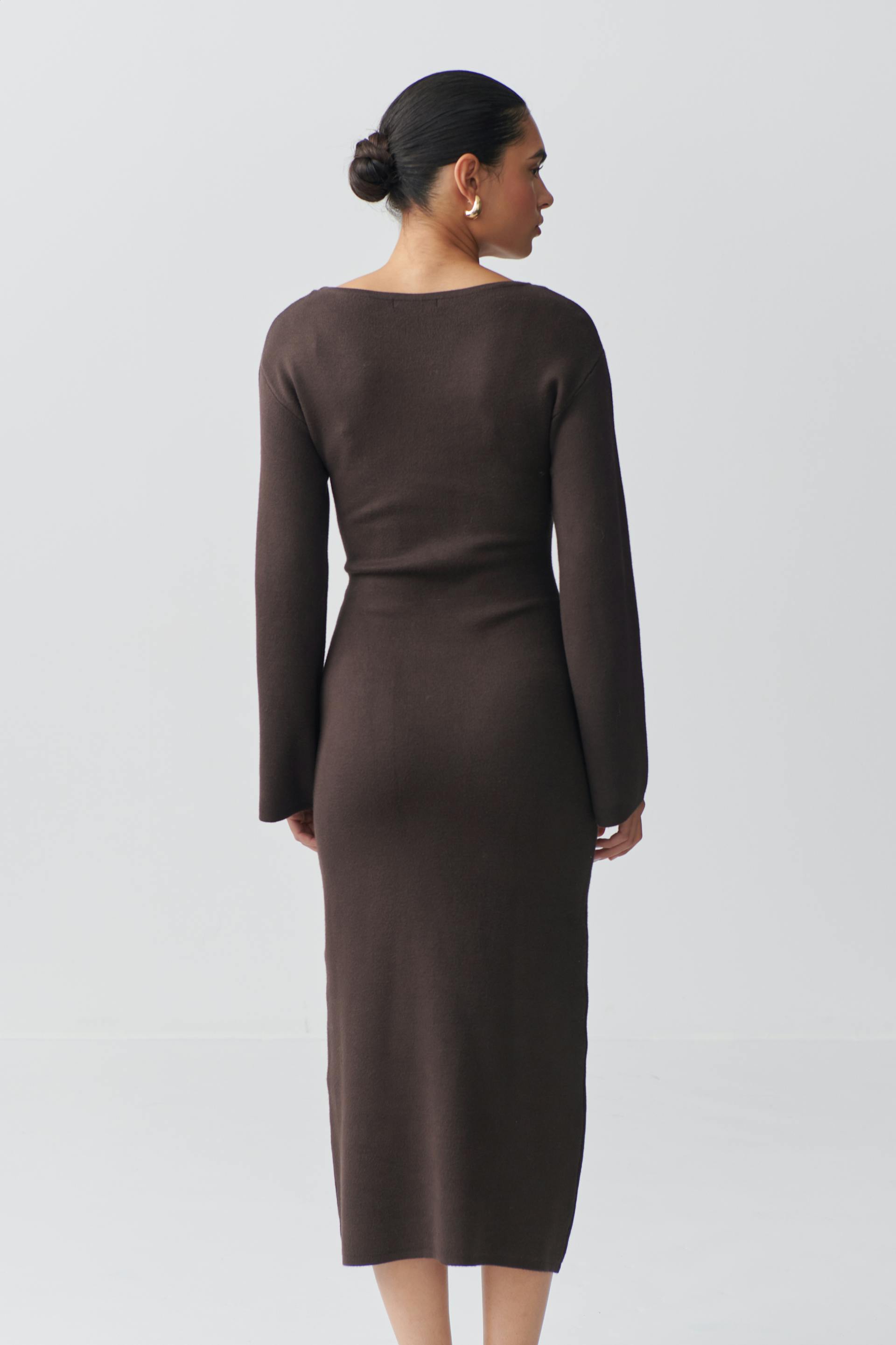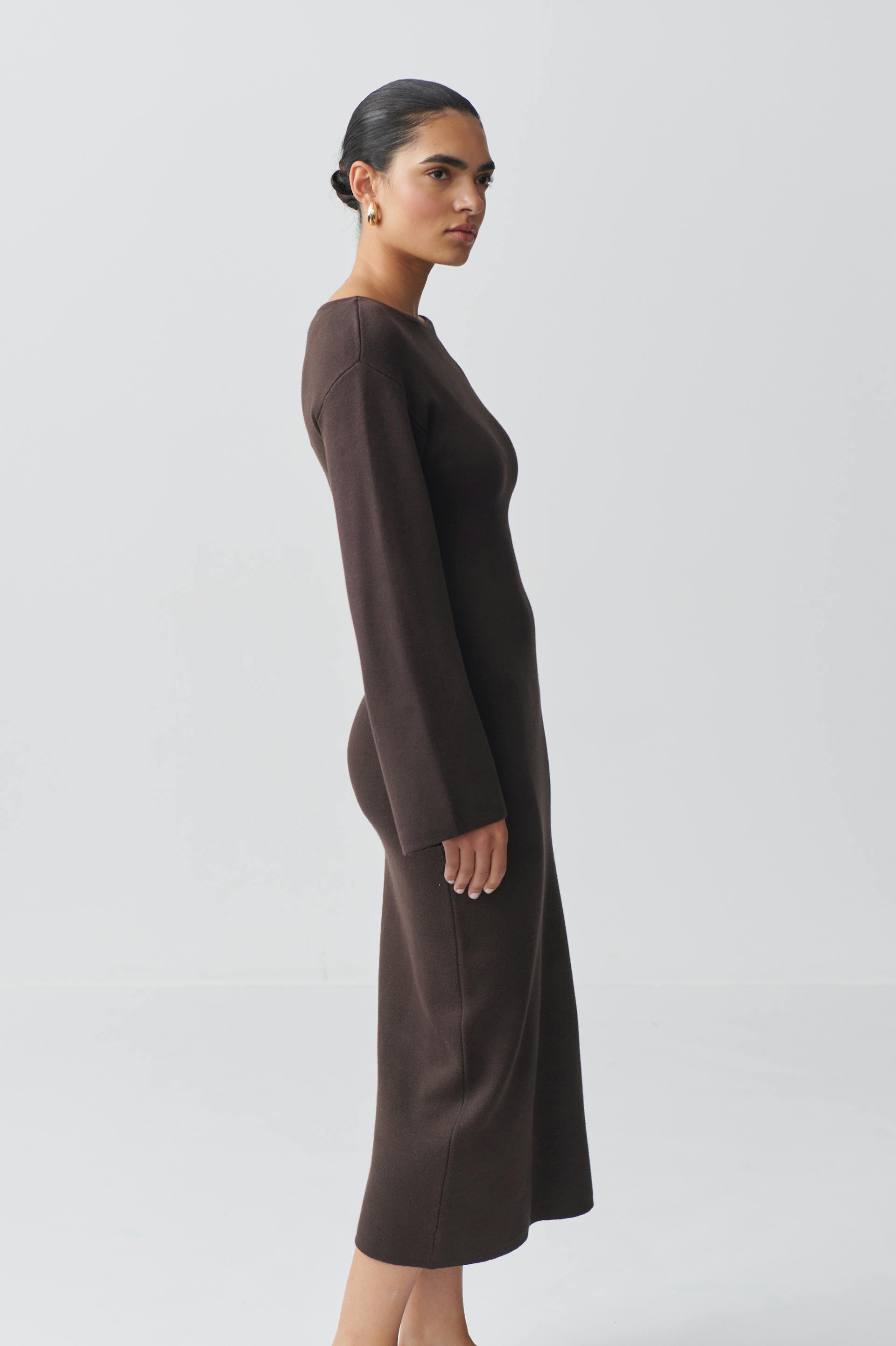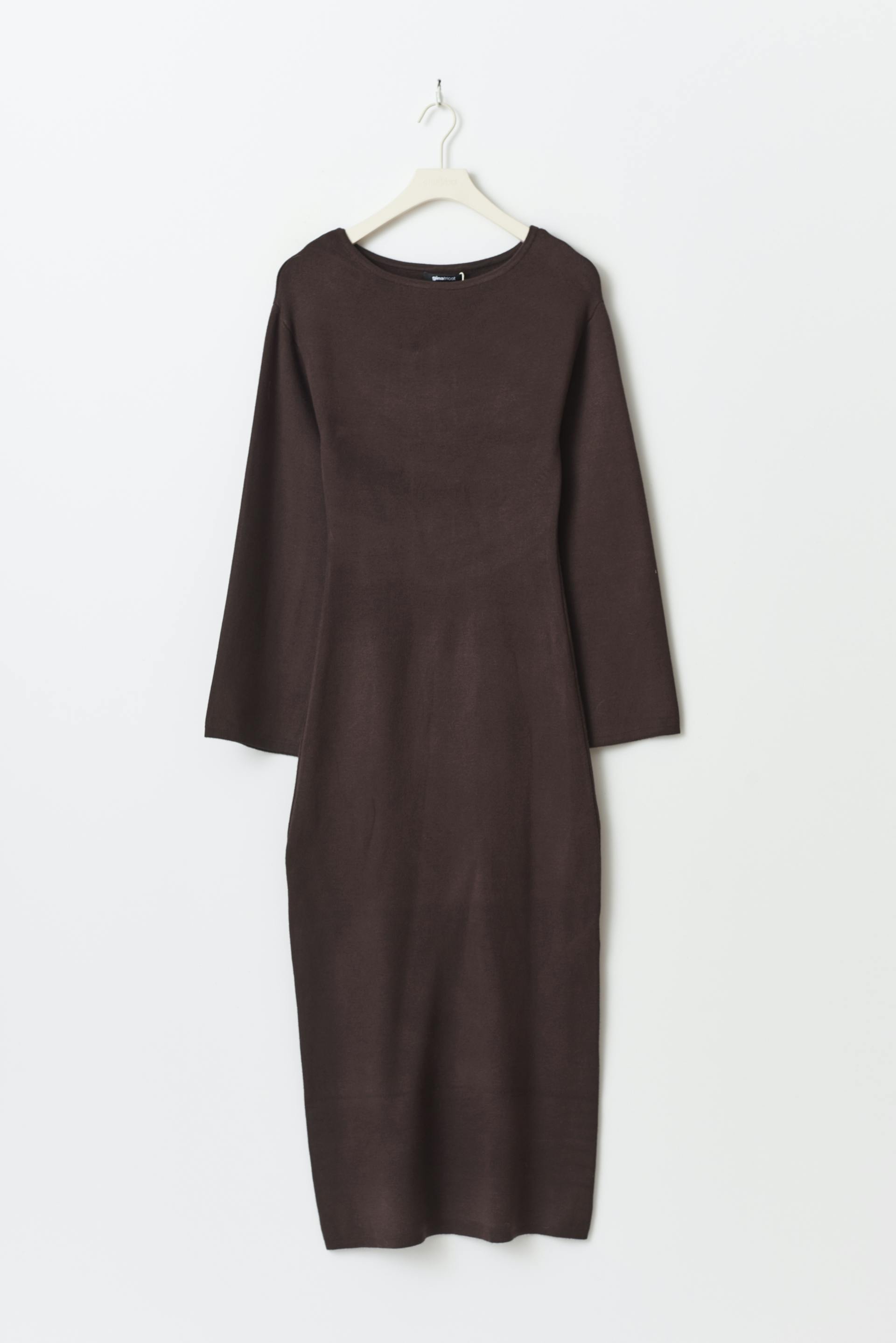 Langes Strickkleid mit U-Boot-Ausschnitt. Das Kleid ist braun und hat normale Passform. Es hat taillierte Taille, langen Ärmel und Midi-Länge.