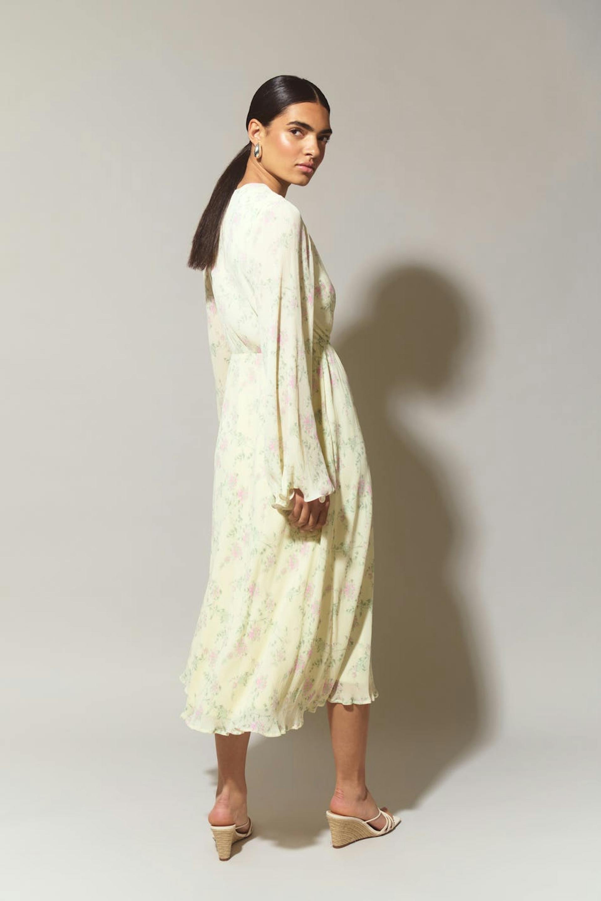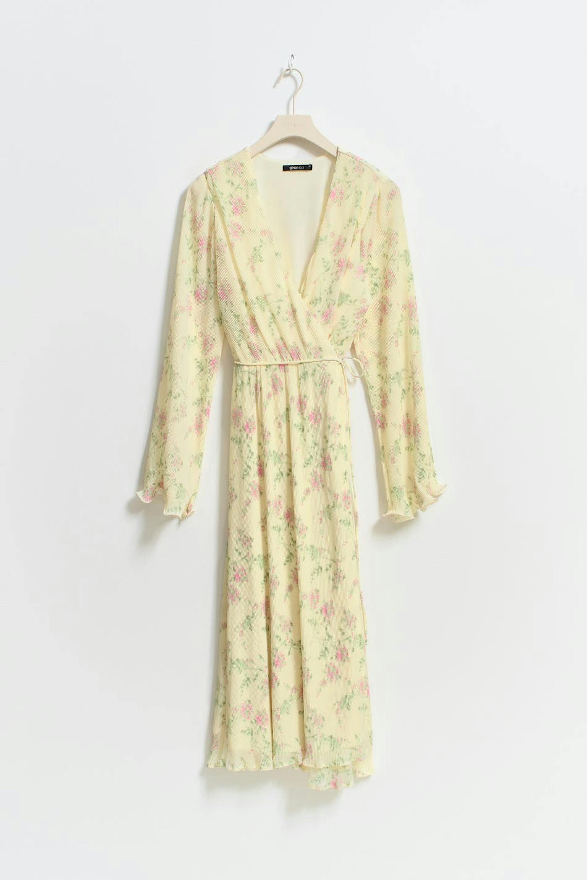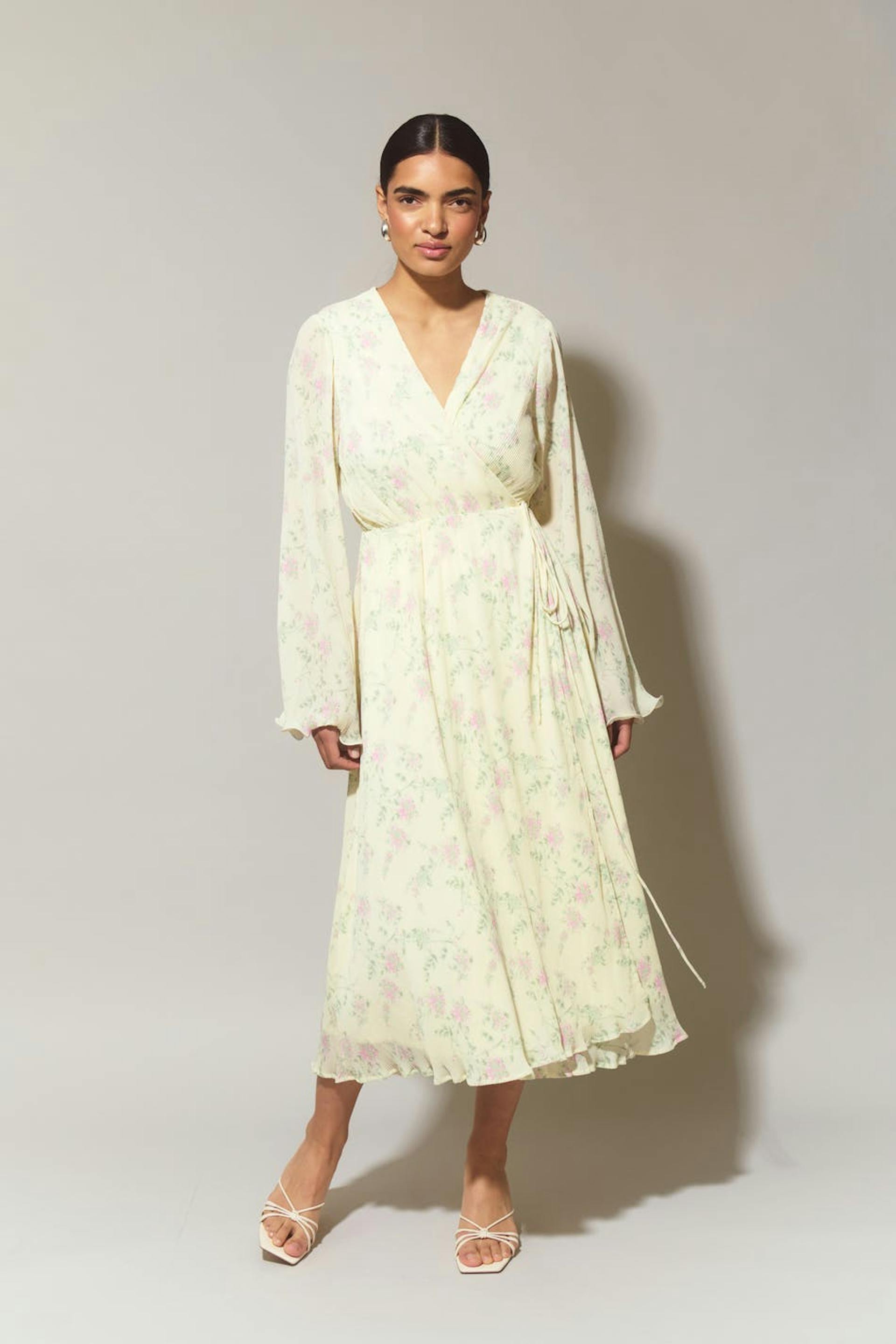 Blumiges Wickelkleid mit Selbstbindung in der Taille. Gelb, plissiert, langärmlig und gefüttert. Es hat elastische Qualität, Wickeloberteil mit V-Ausschnitt, breiten Ärmel mit schwankendem Ärmelende und Midi-Länge.