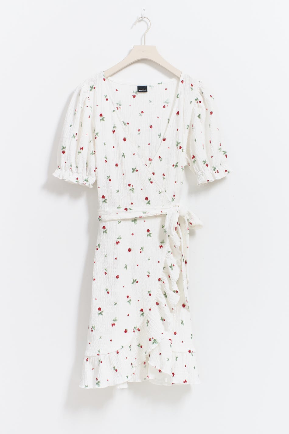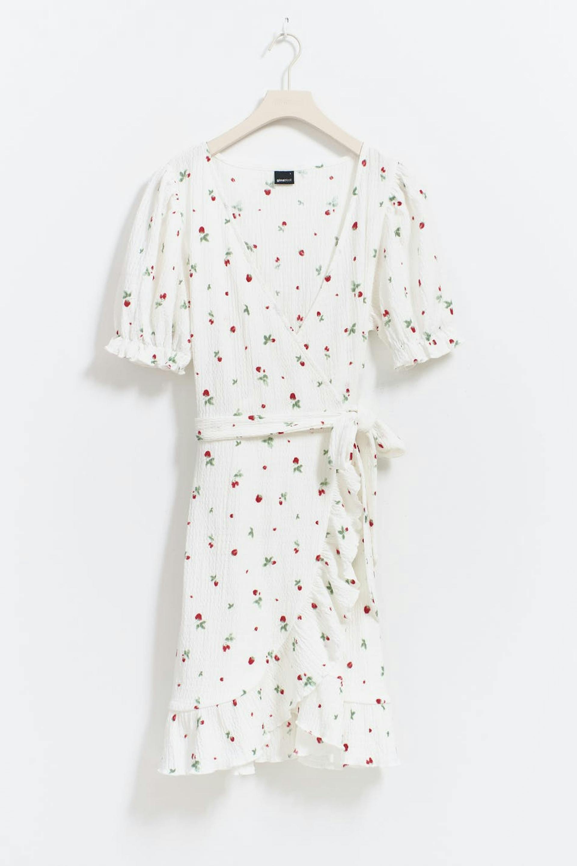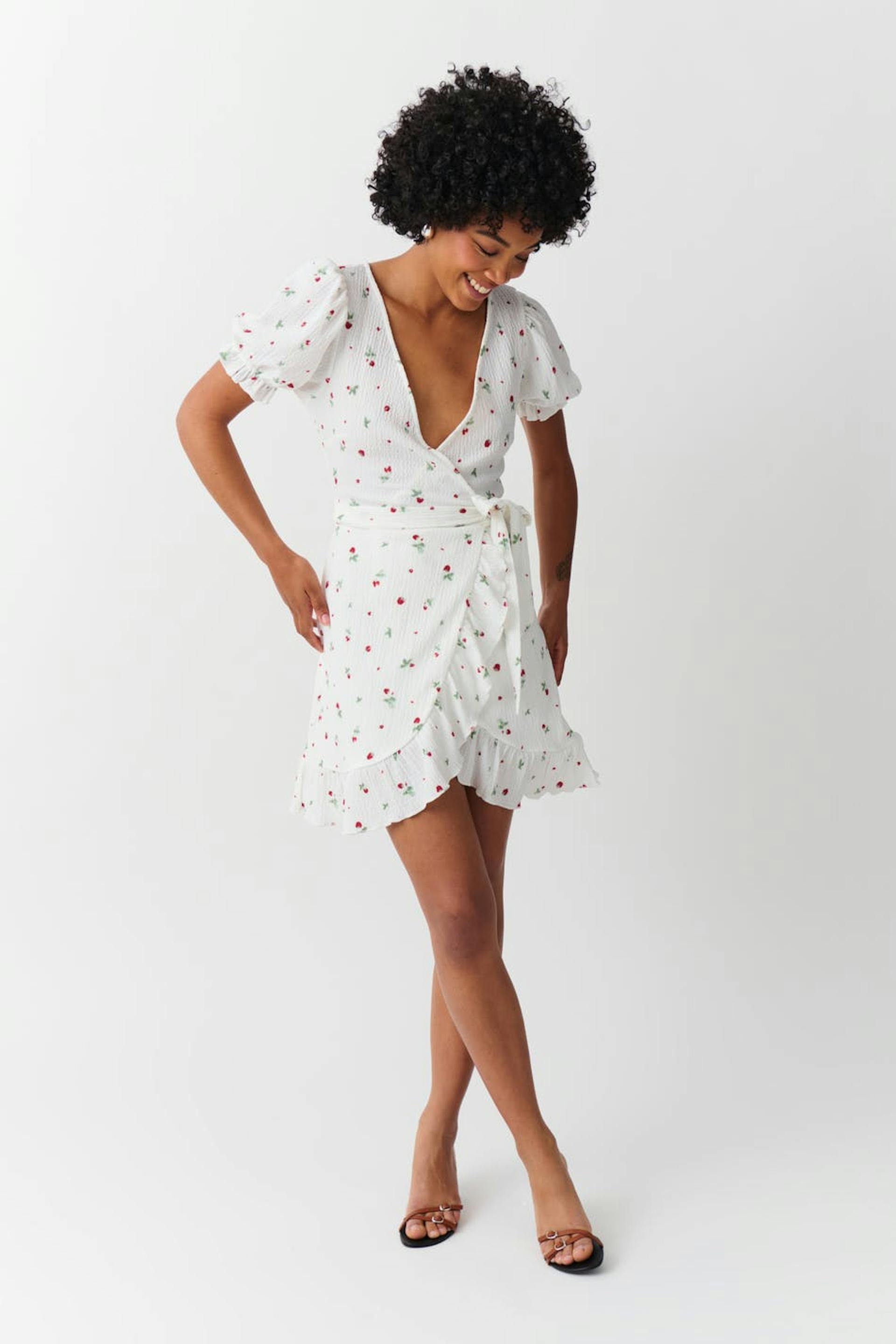 Gemustertes Wickelkleid mit Selbstbindung in der Taille. Das Kleid ist weiβ, rot und kurz. Es hat strukturiertes Material, normale Passform, kurzen Puffärmel, V-Ausschnitt und Rüschenrock an den Ärmelenden und an der Unterkante.