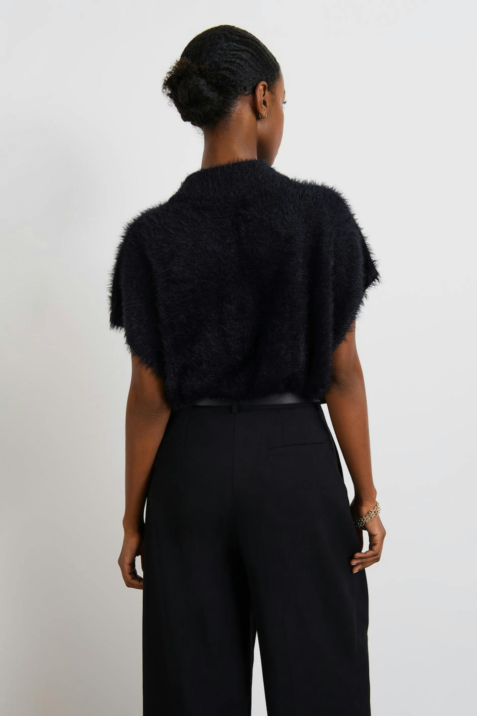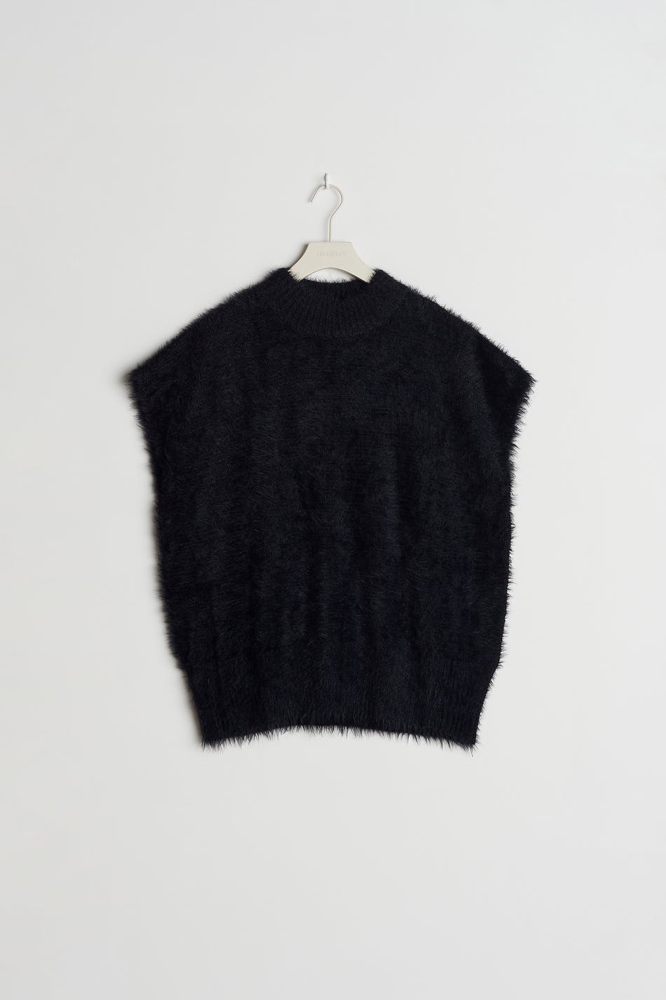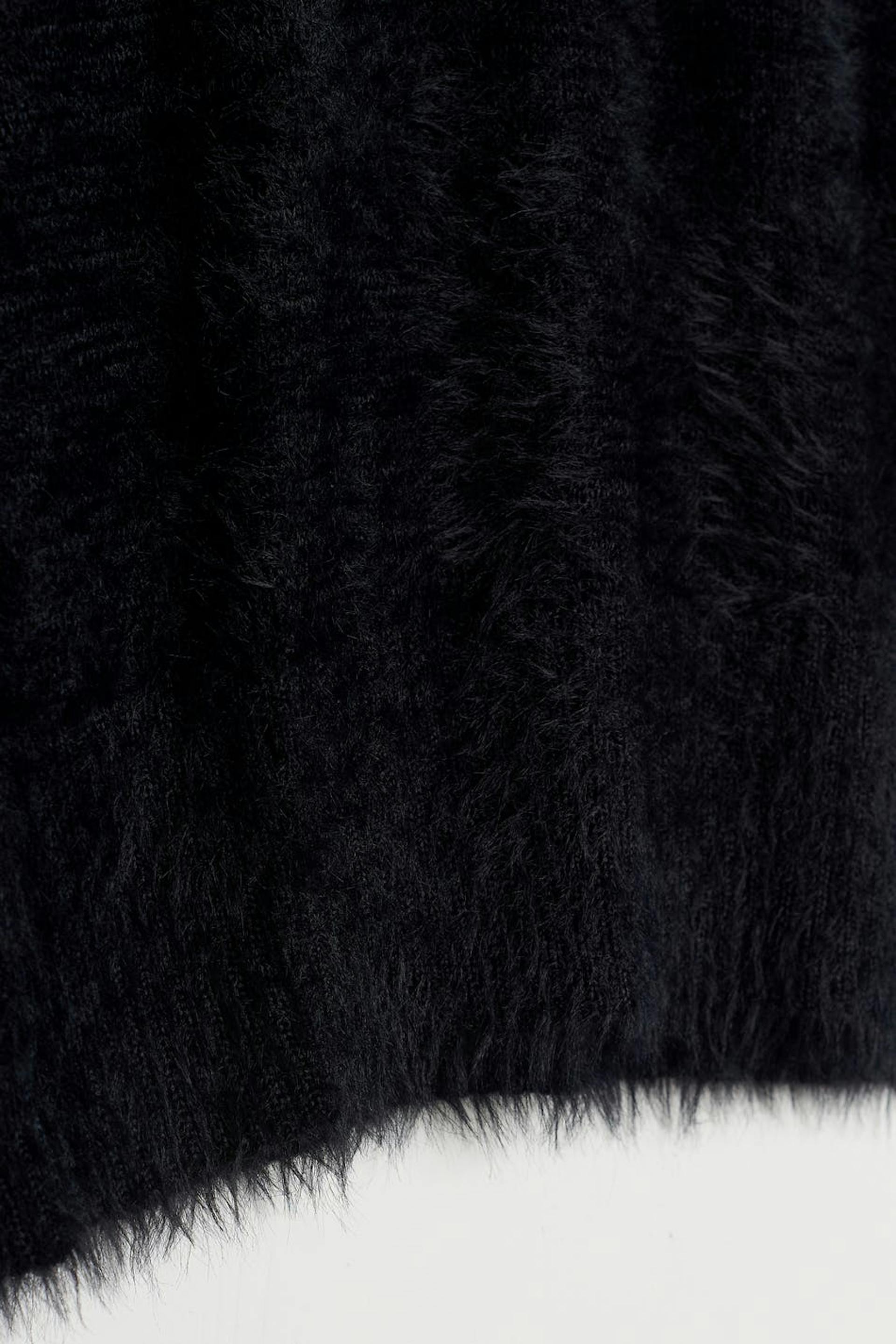 Gestrickte Weste mit hochgeschlossenem Ausschnitt. Die Weste ist schwarz und hat ein weiches, flauschiges Material. Sie hat Drop-Schultern und einen weit-geschnittenen Style.