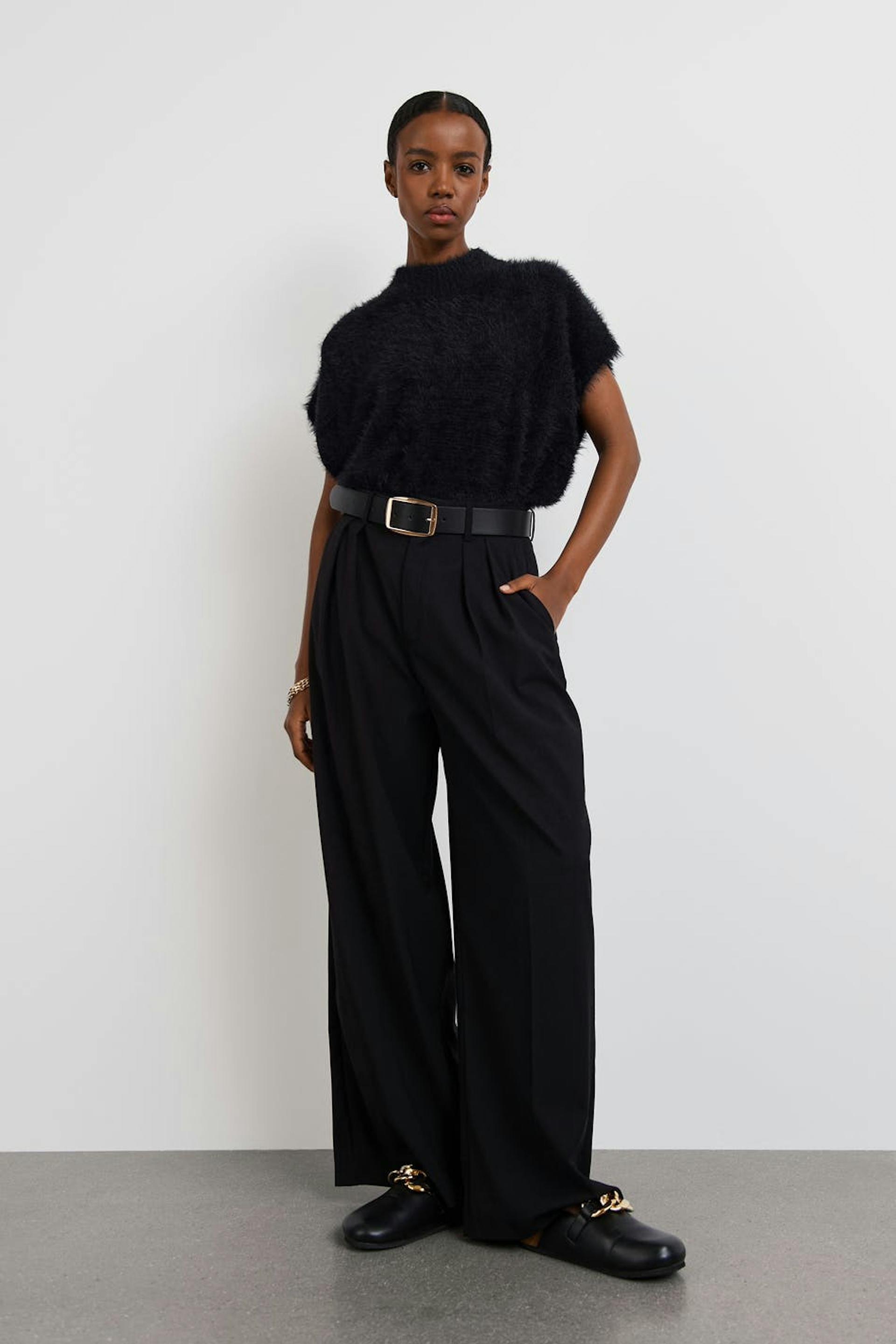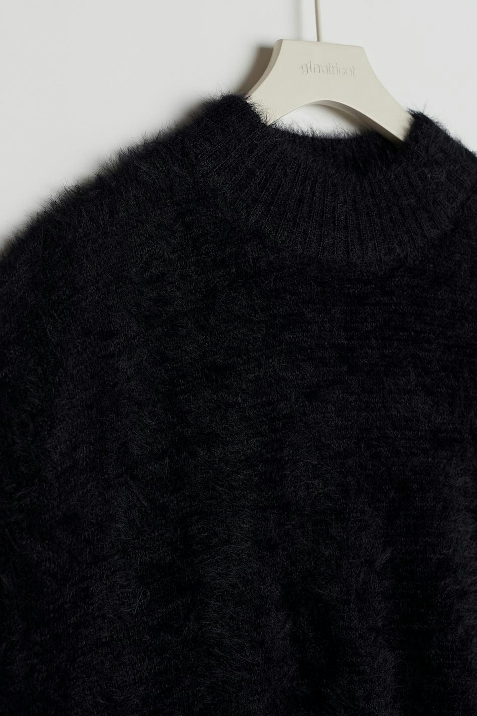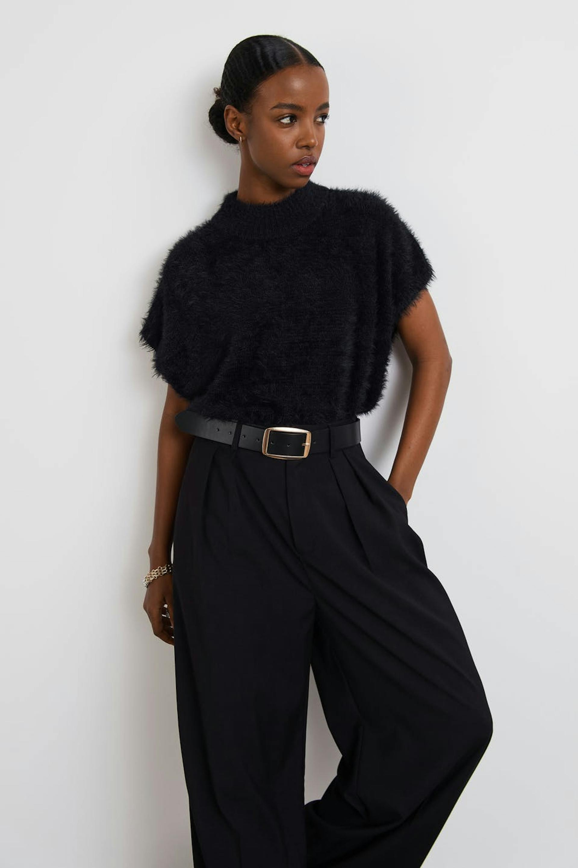 Gestrickte Weste mit hochgeschlossenem Ausschnitt. Die Weste ist schwarz und hat ein weiches, flauschiges Material. Sie hat Drop-Schultern und einen weit-geschnittenen Style.