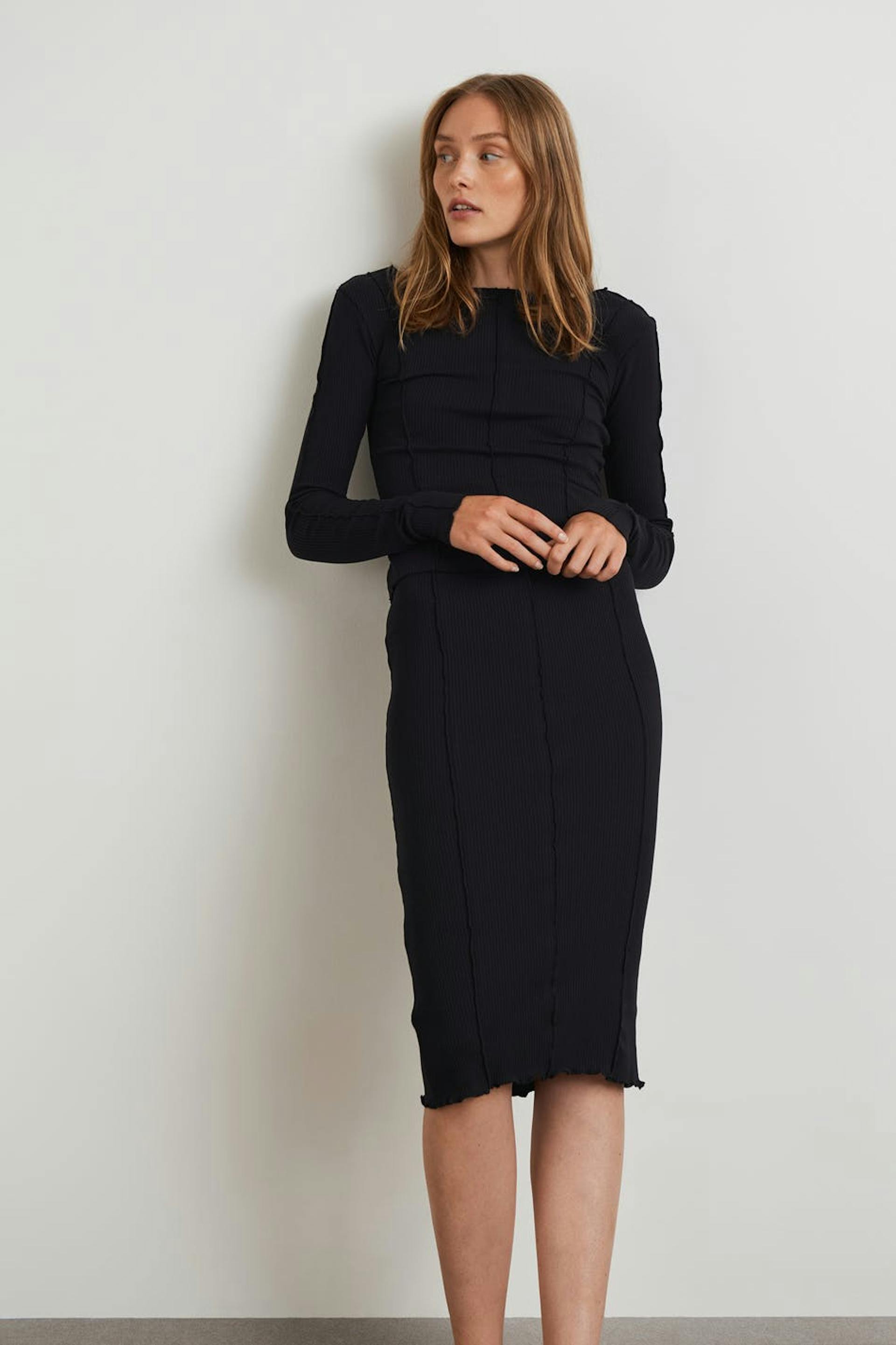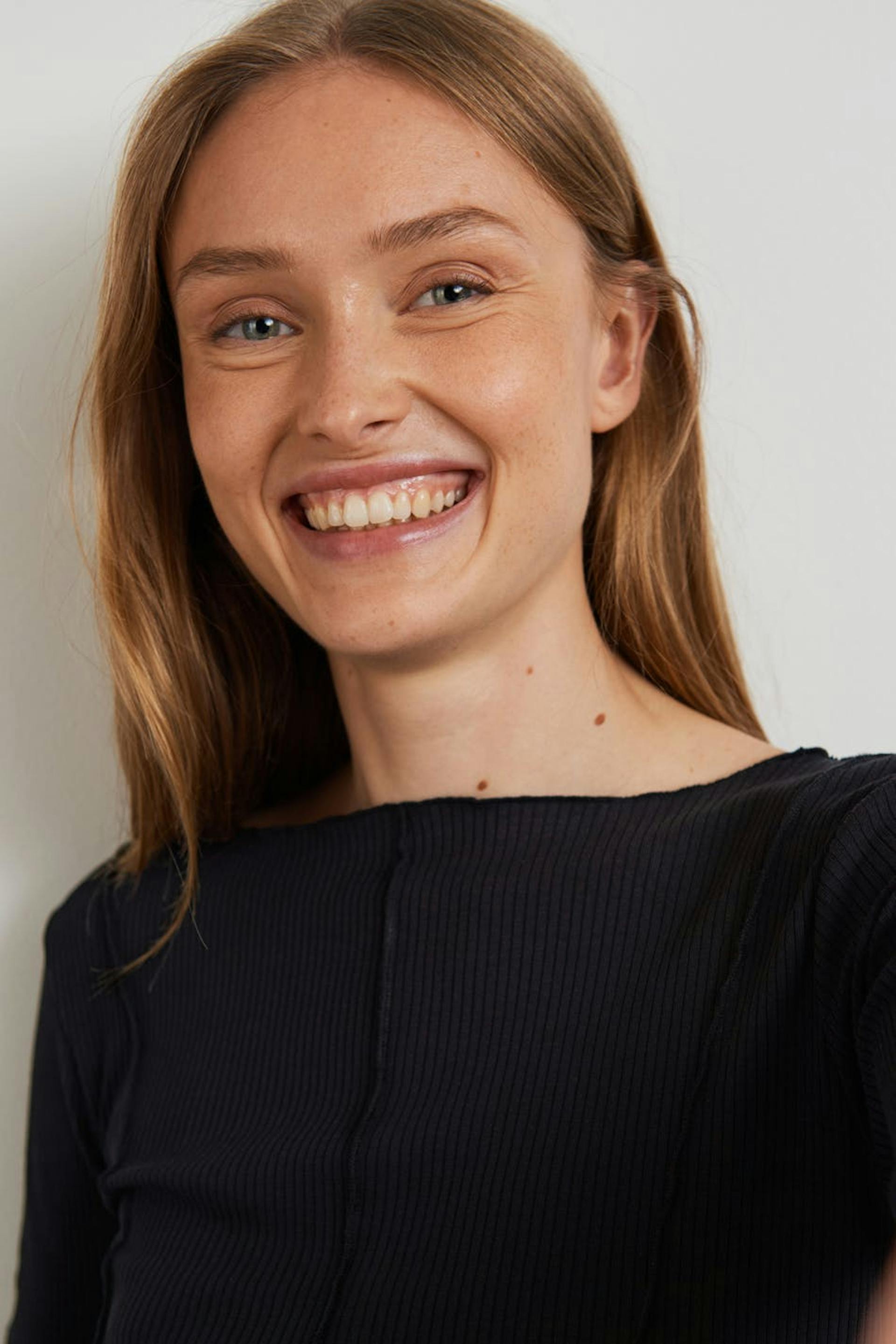 Geripptes Oberteil mit einer taillierten Passform. Das Oberteil ist schwarz und langärmlig und hat einen Boot-Ausschnitt auf der Oberseite. Es hat kleine, dekorative Rüschen-Details vorne und am Saum.