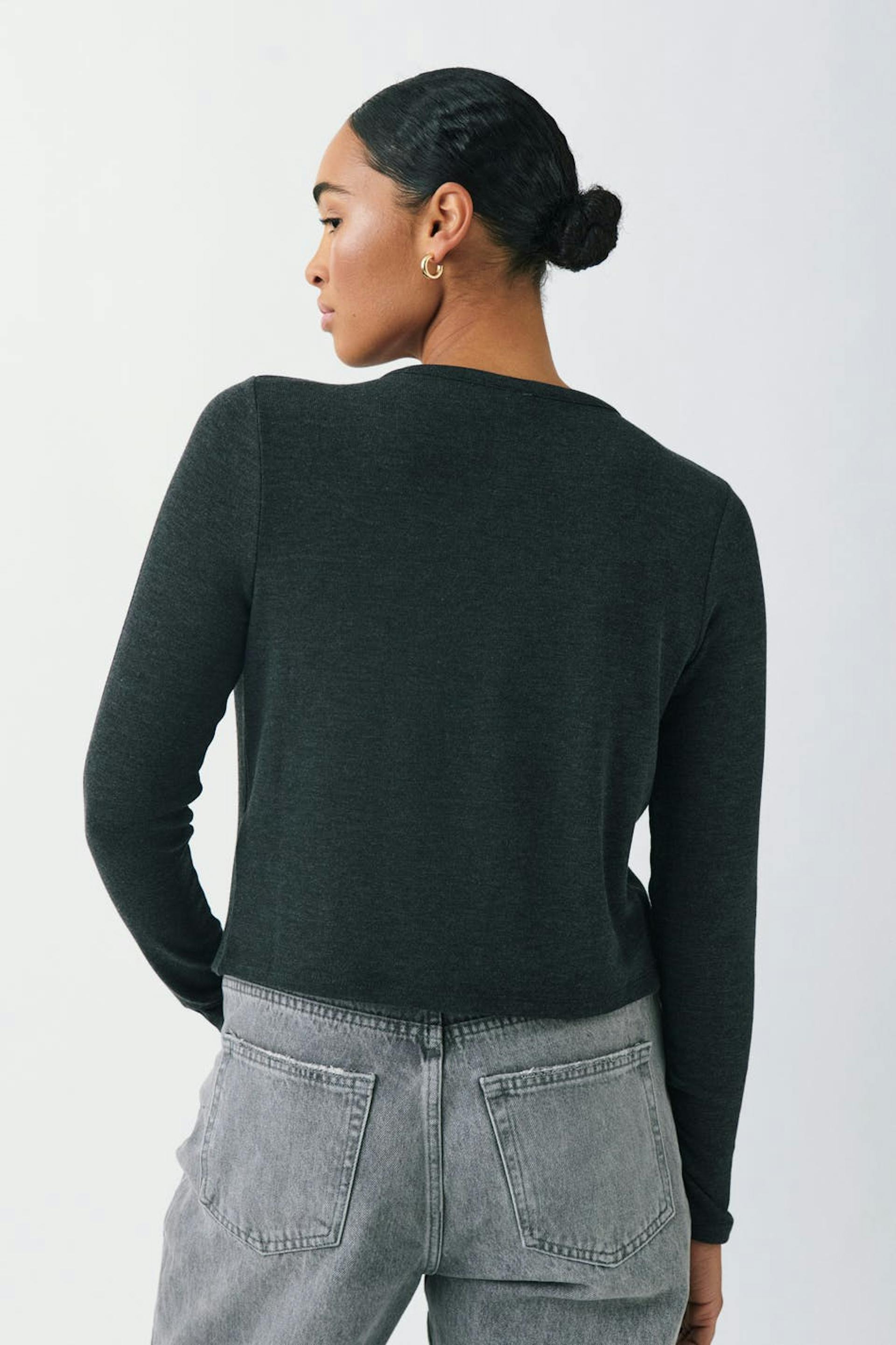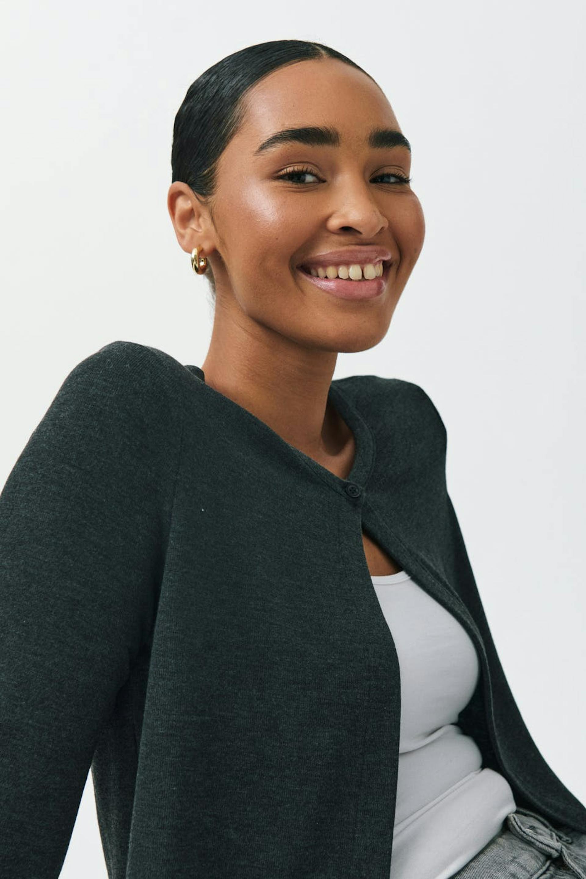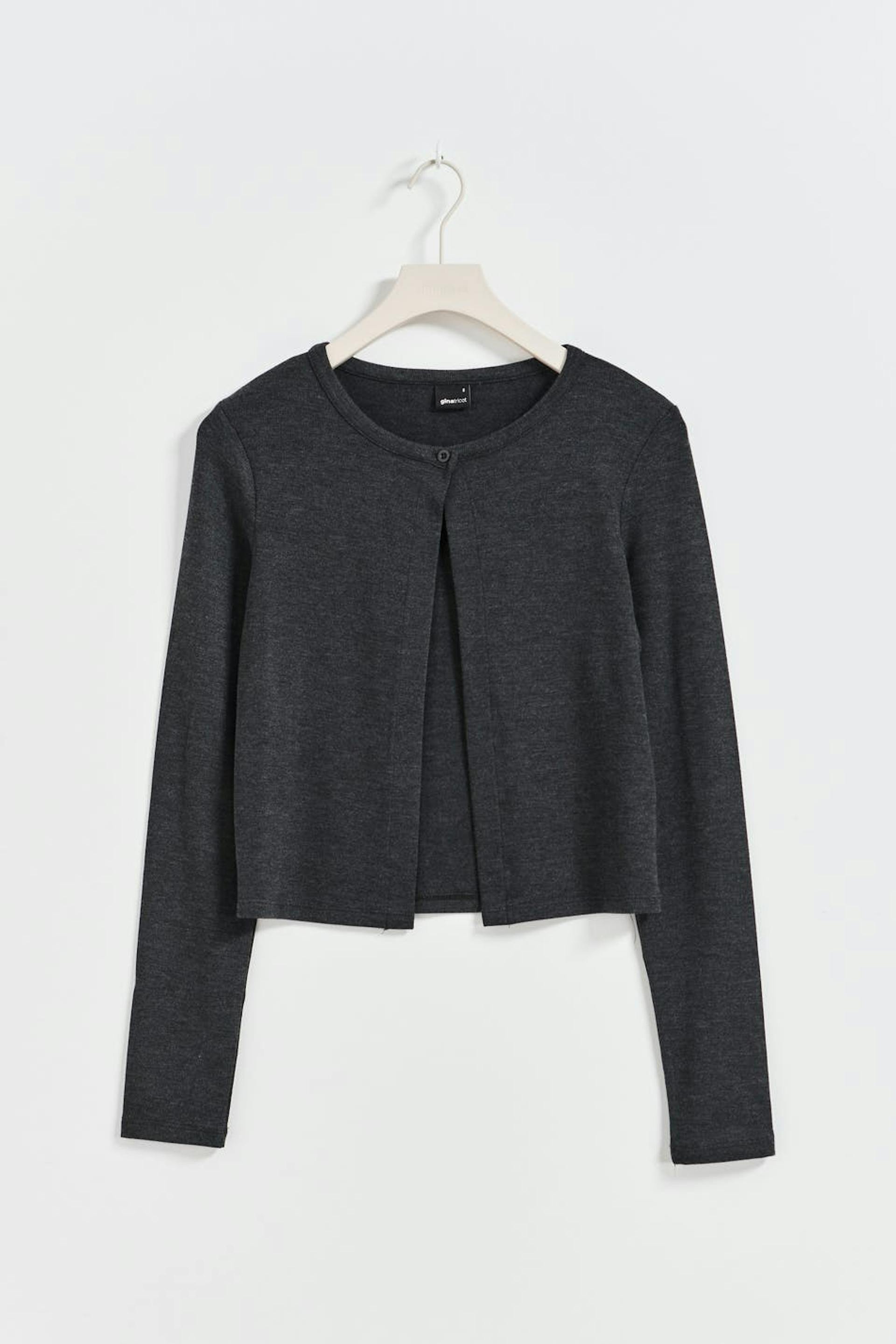 Cardigan aus Rippenstrick-Jersey mit figurbetonter Passform. Der Cardigan ist grau und hat Verschluss mit einem Knopf vorne. Er hat Rundhalsausschnitt, langen Ärmel und kurze Länge.