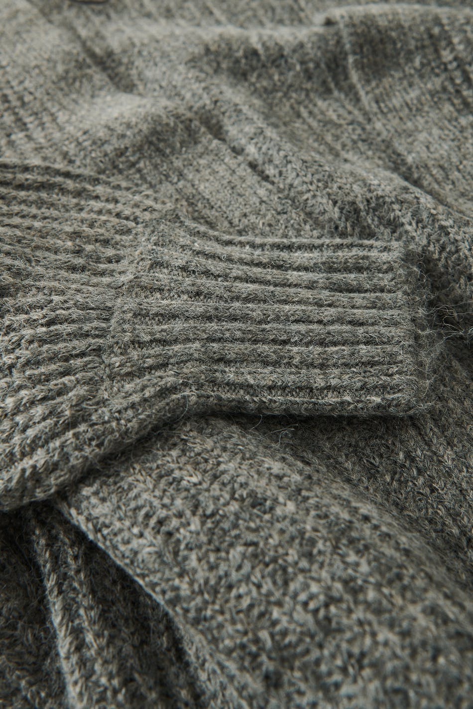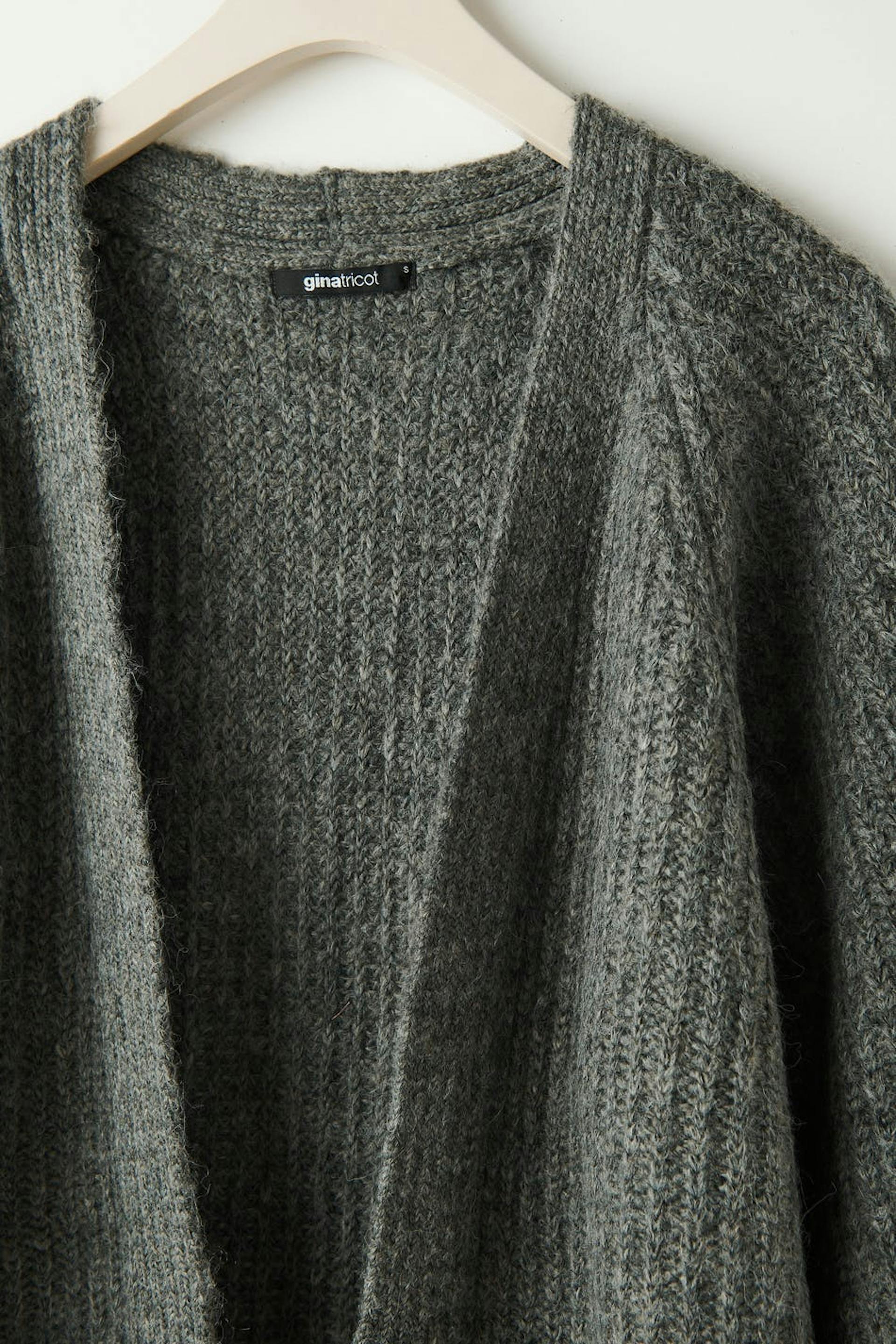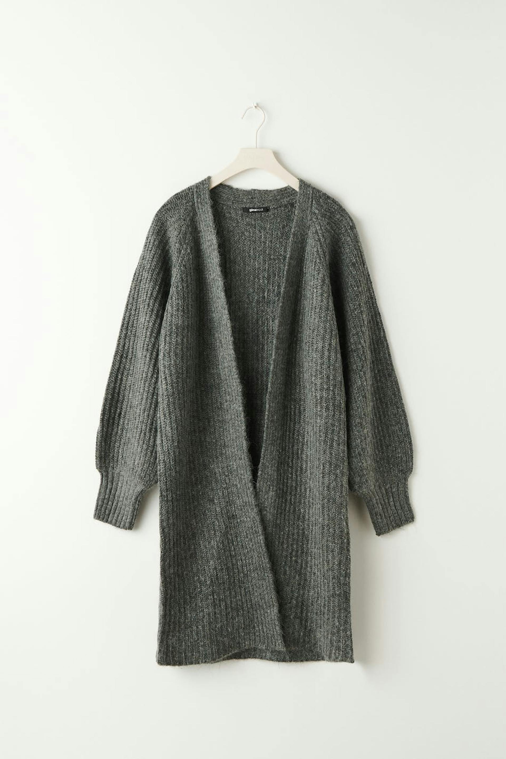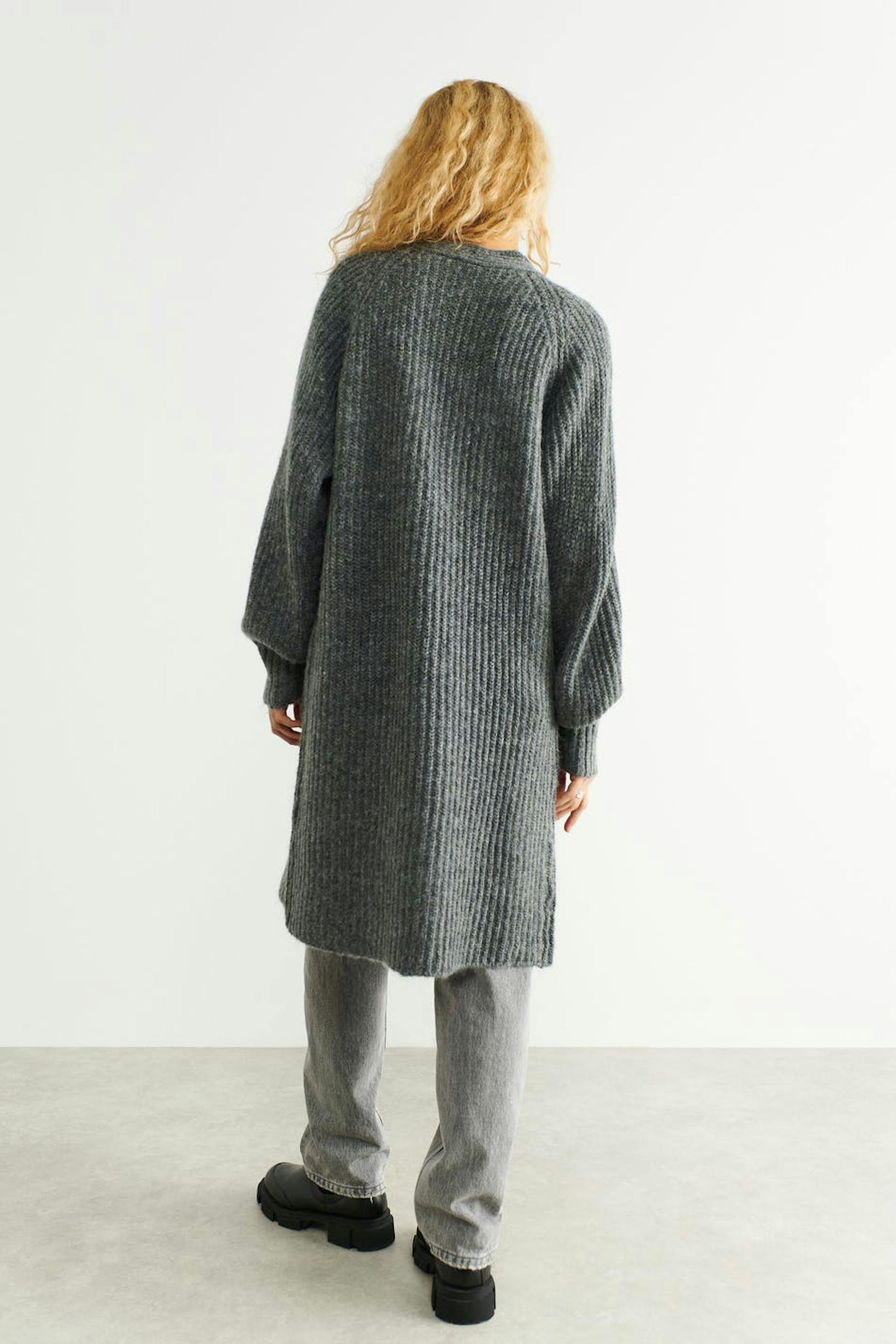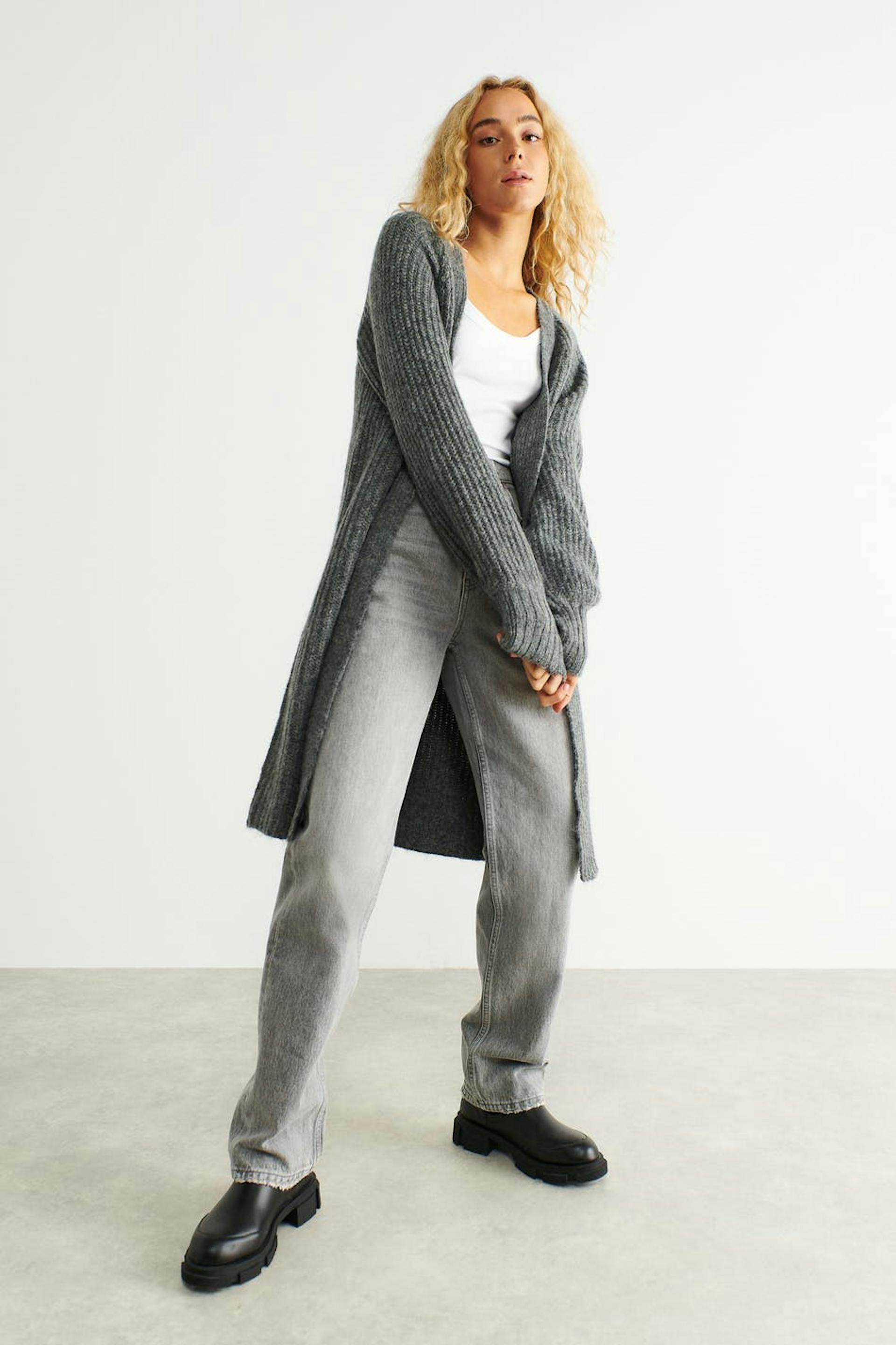 Langer Cardigan ohne Knöpfe mit Oversize-Passform. Der Cardigan ist grau und gestrickt.