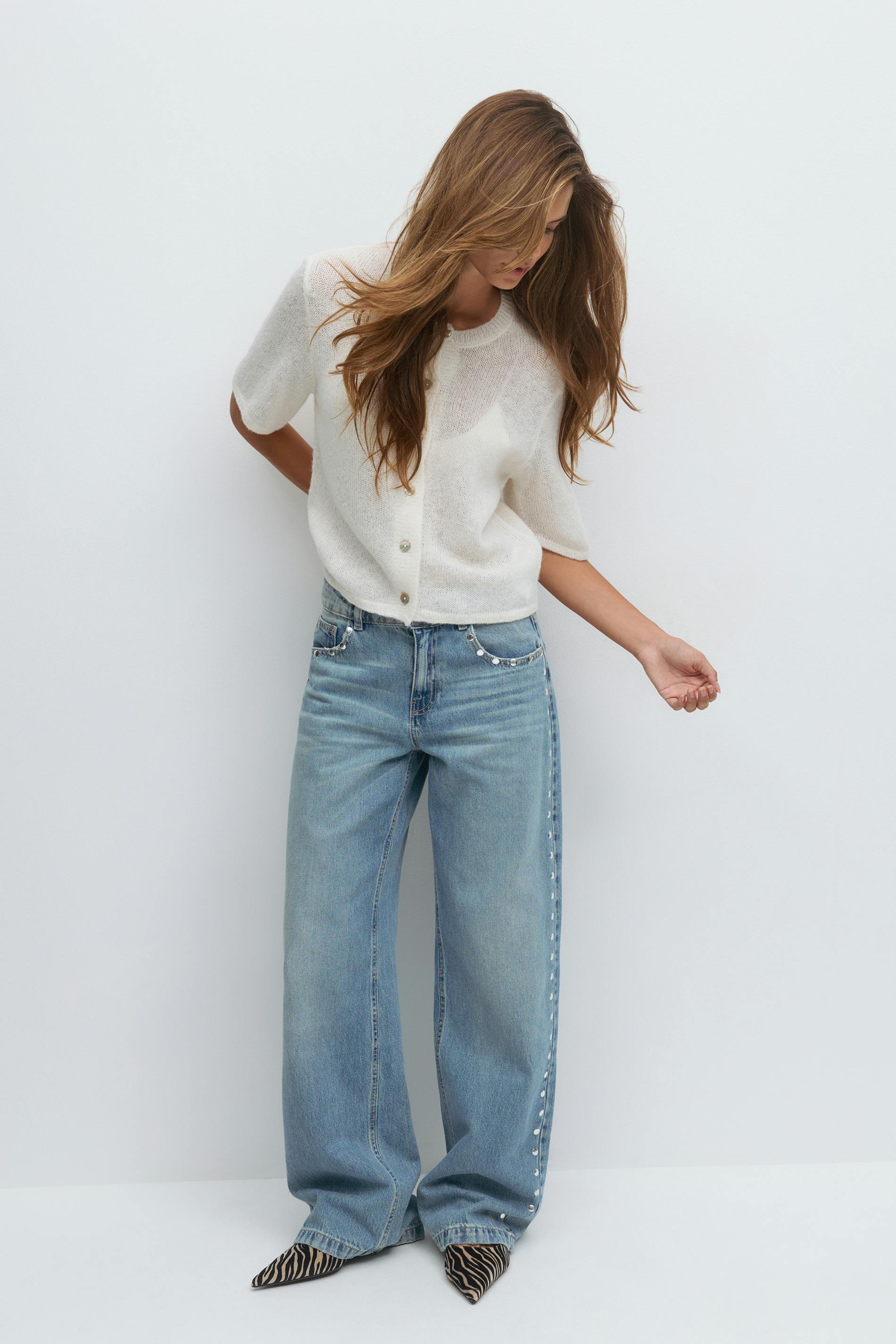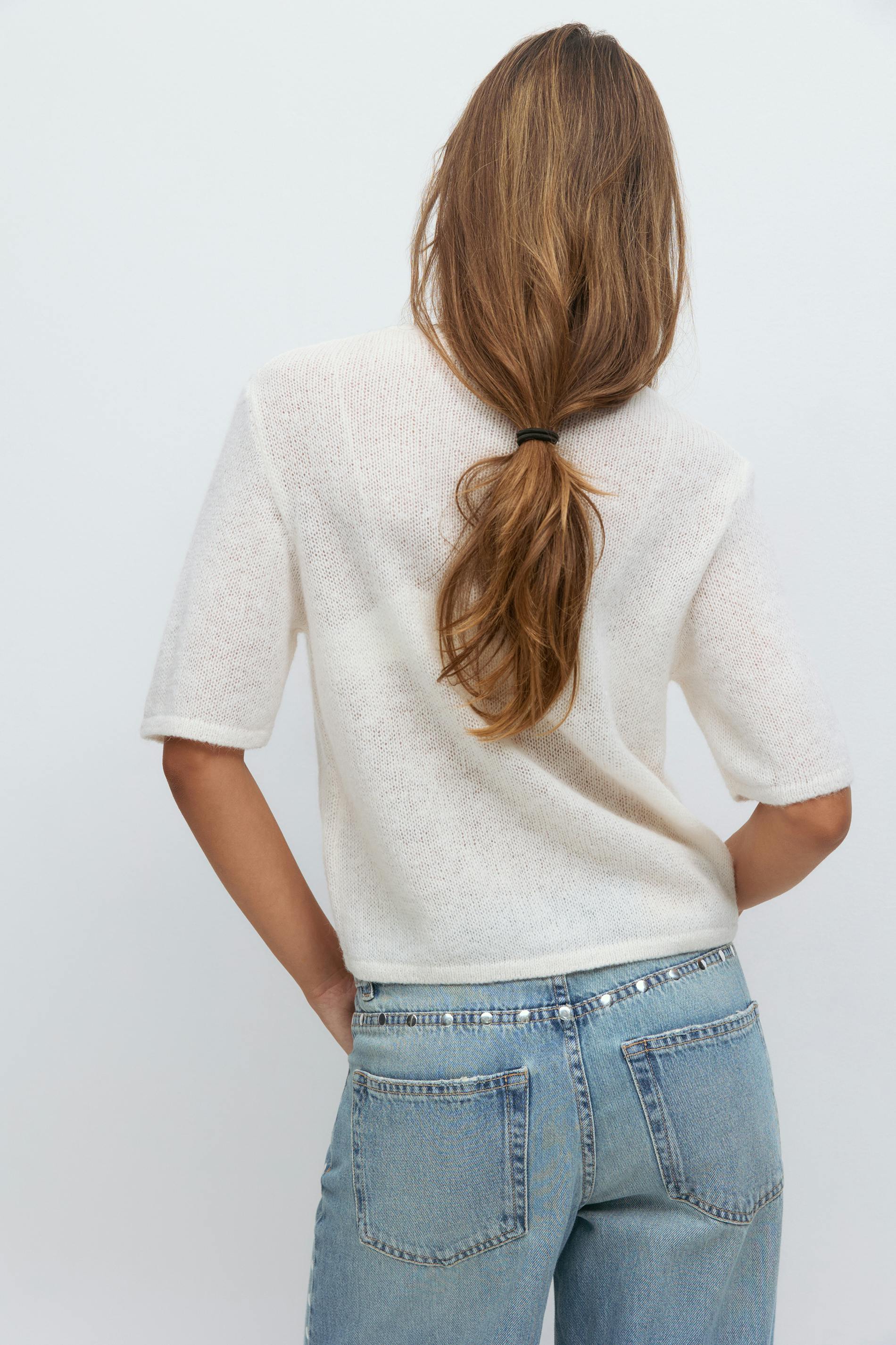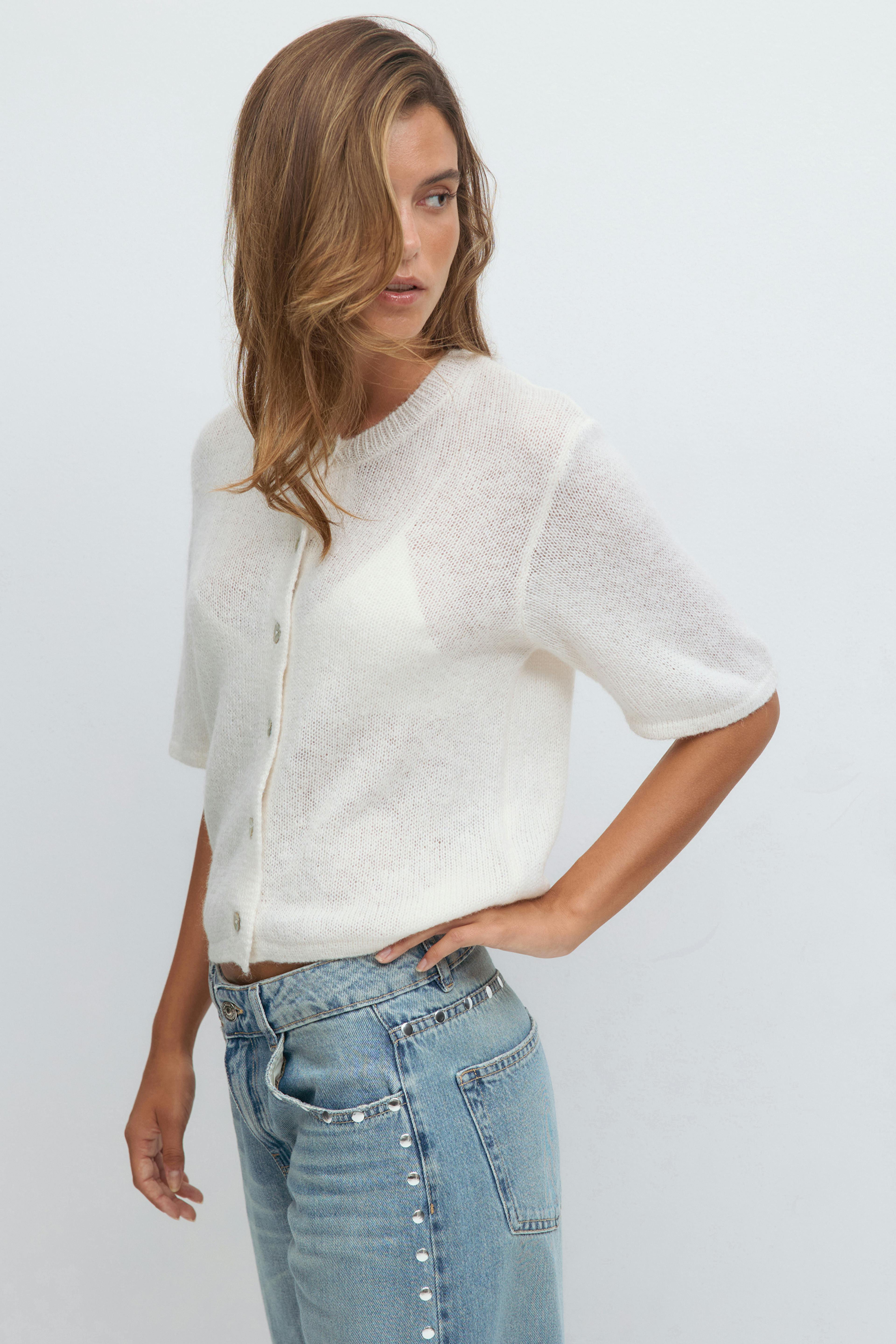 Kurzärmlige Strickjacke mit Knöpfen vorne. Die Strickjacke ist weiβ und hat weit-geschnittenen Style. Sie hat Rundhalsausschnitt und gestrickte Qualität.