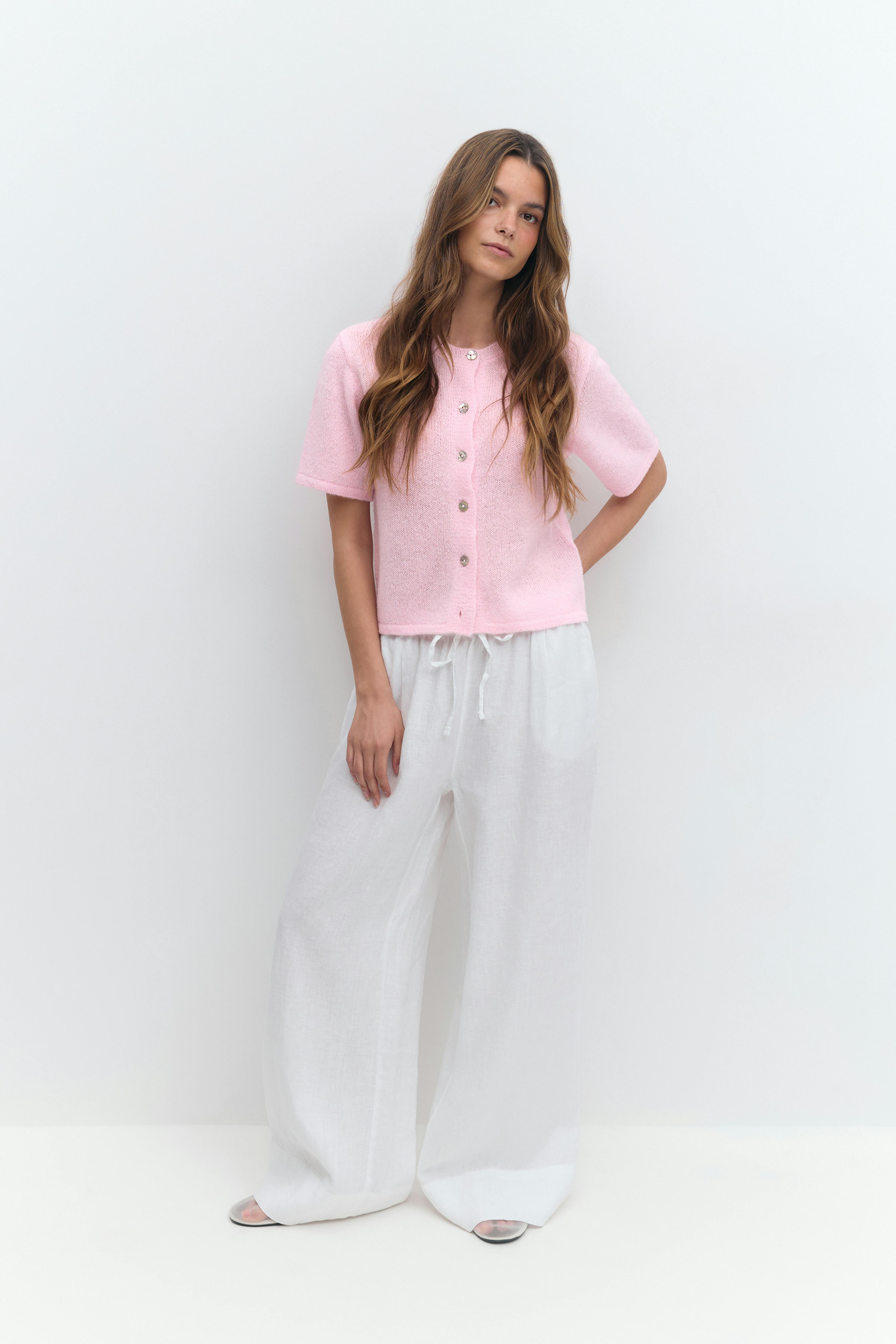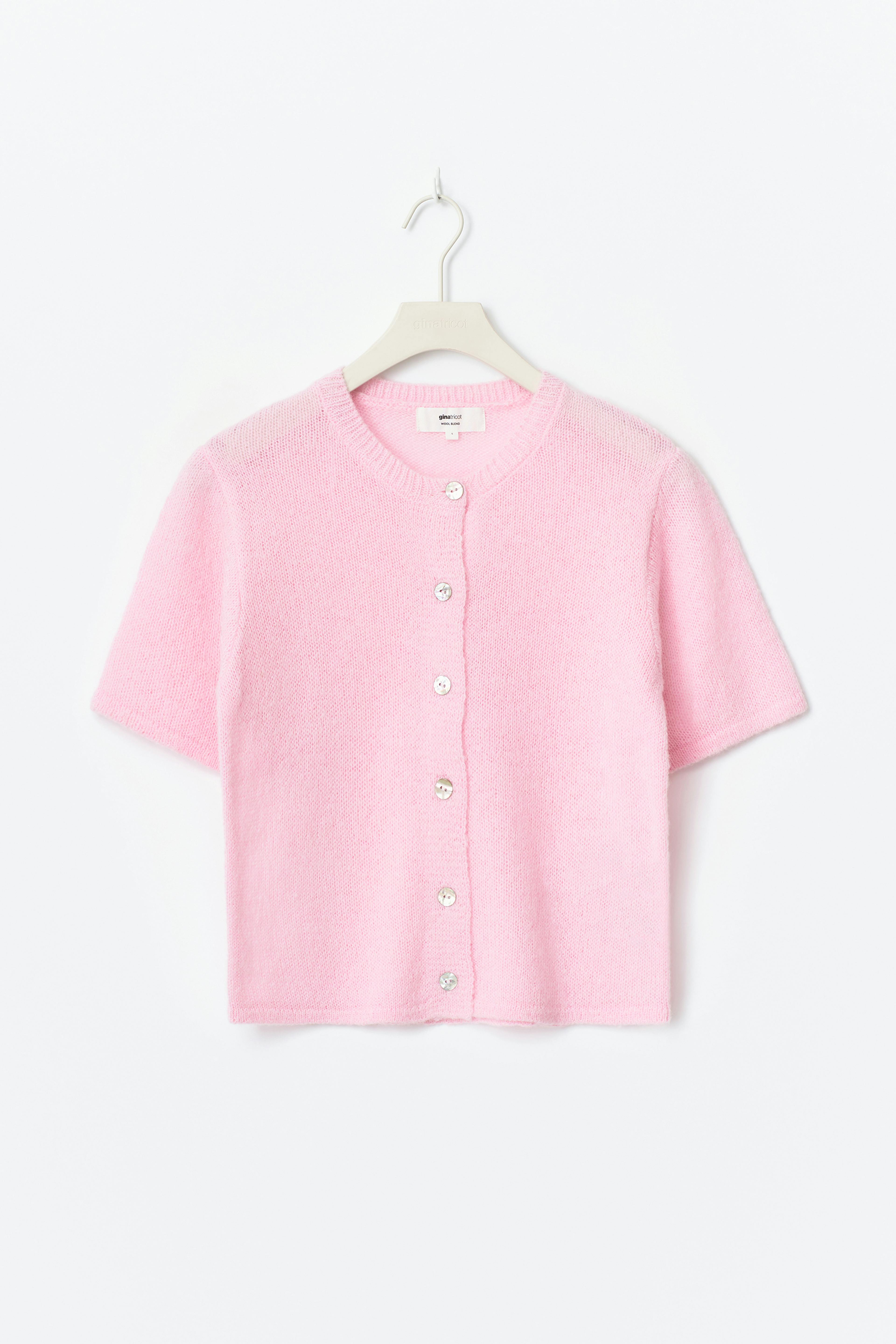Kurzärmlige Strickjacke mit Knöpfen vorne. Die Strickjacke ist rosa und hat weit-geschnittenen Style. Sie hat Rundhalsausschnitt und gestrickte Qualität.