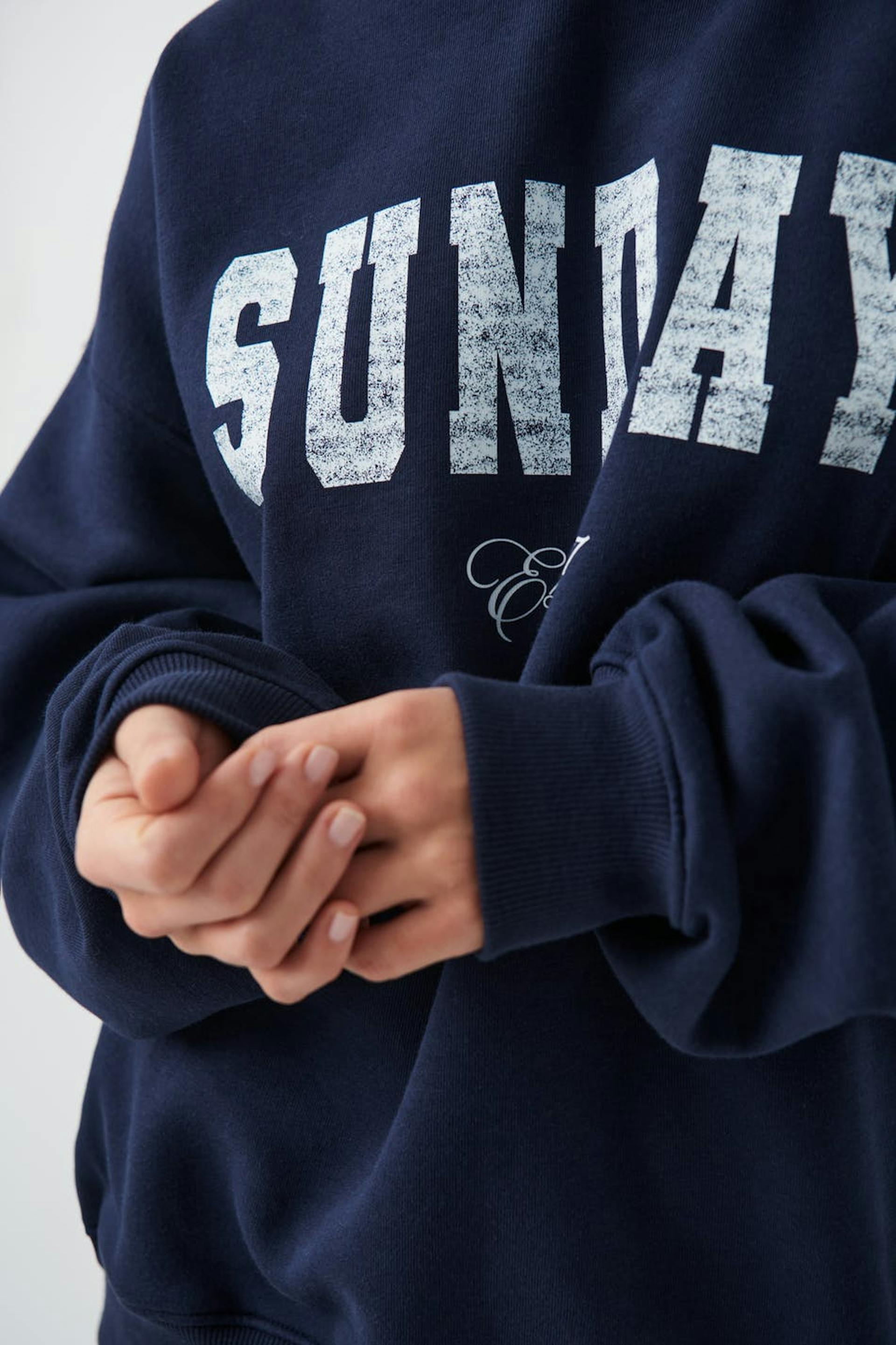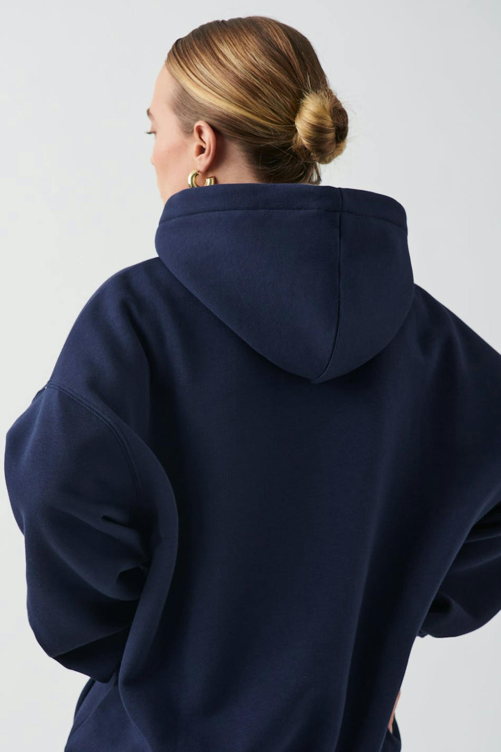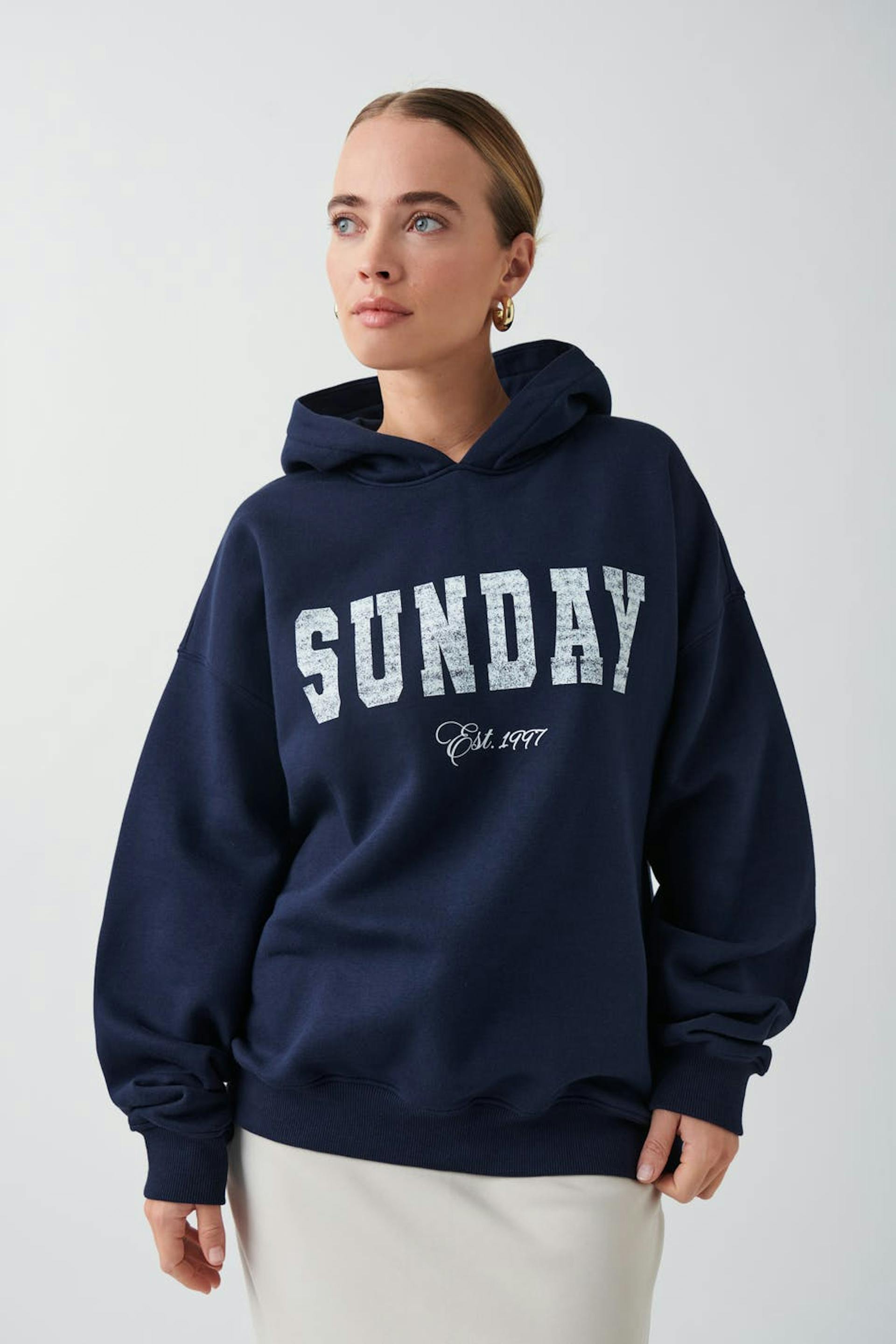 Oversize Hoodie mit Textabdruck vorne. Der Hoodie ist blau und hat gefütterte Kapuze. Er hat Drop-Schulter und gerippte Manschette an den Ärmelenden und an der Unterkante.