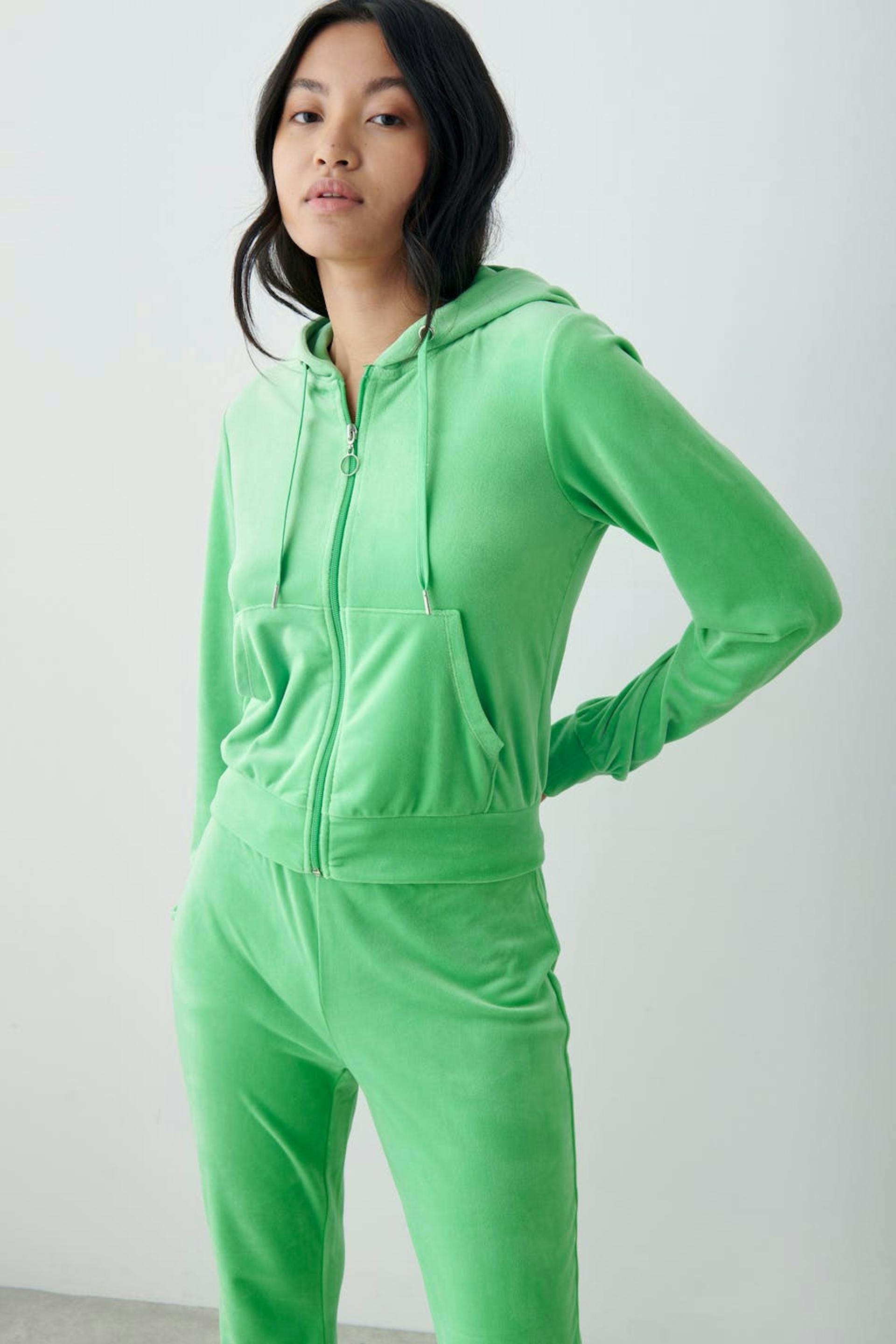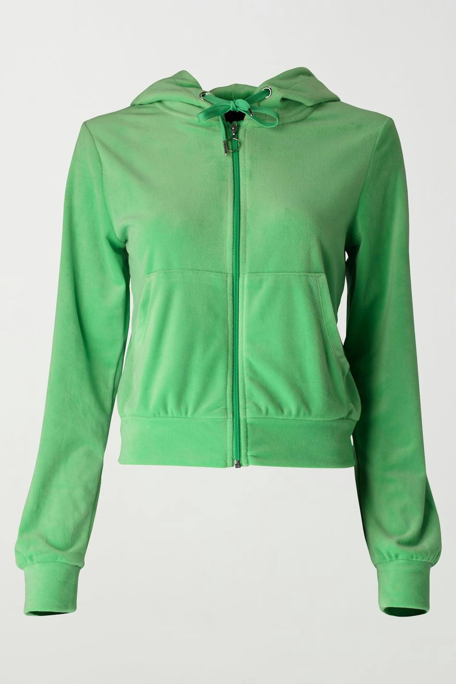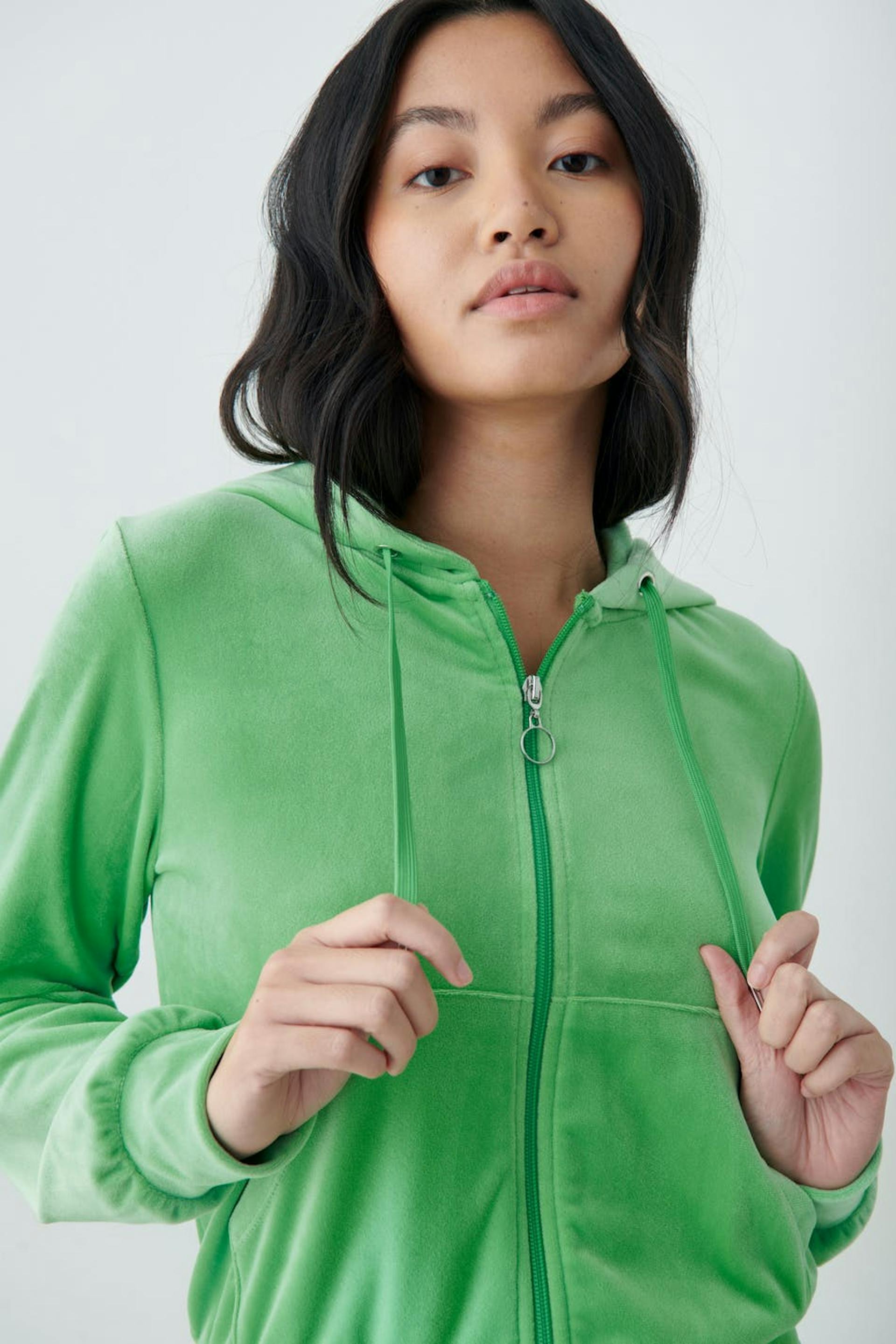Weicher Hoodie aus Velours mit gefütterter Kapuze. Der Hoodie ist grün und hat Taschen in den Seiten. Er hat Reißverschluss mit Metallring und Kordelzüge an der Kapuze.
