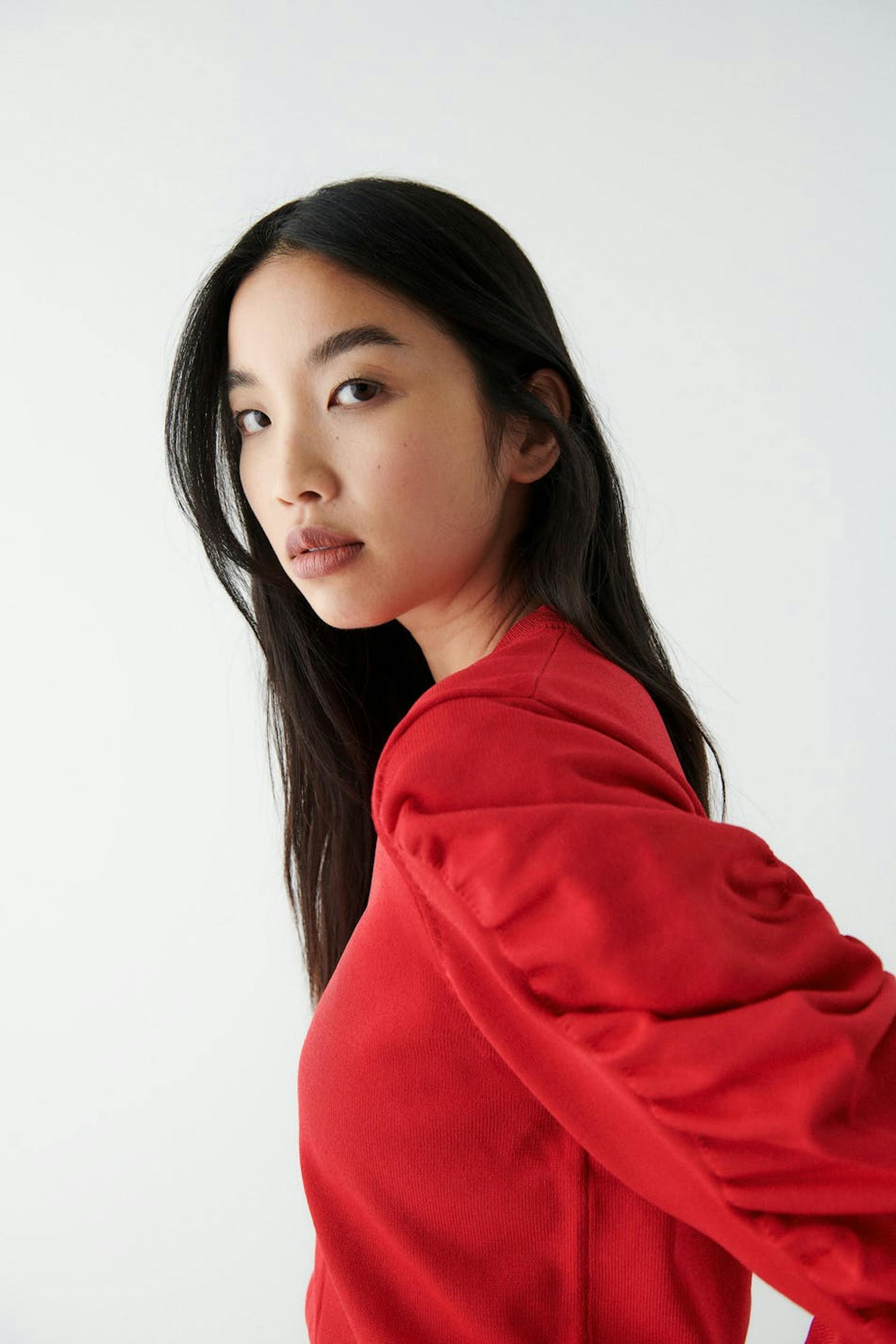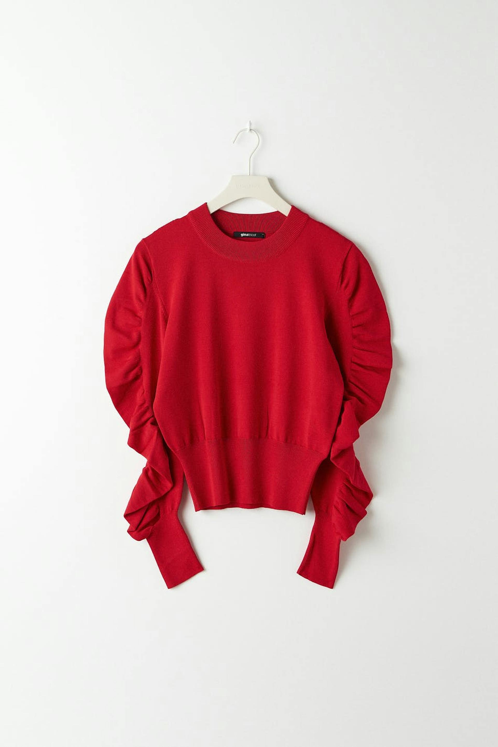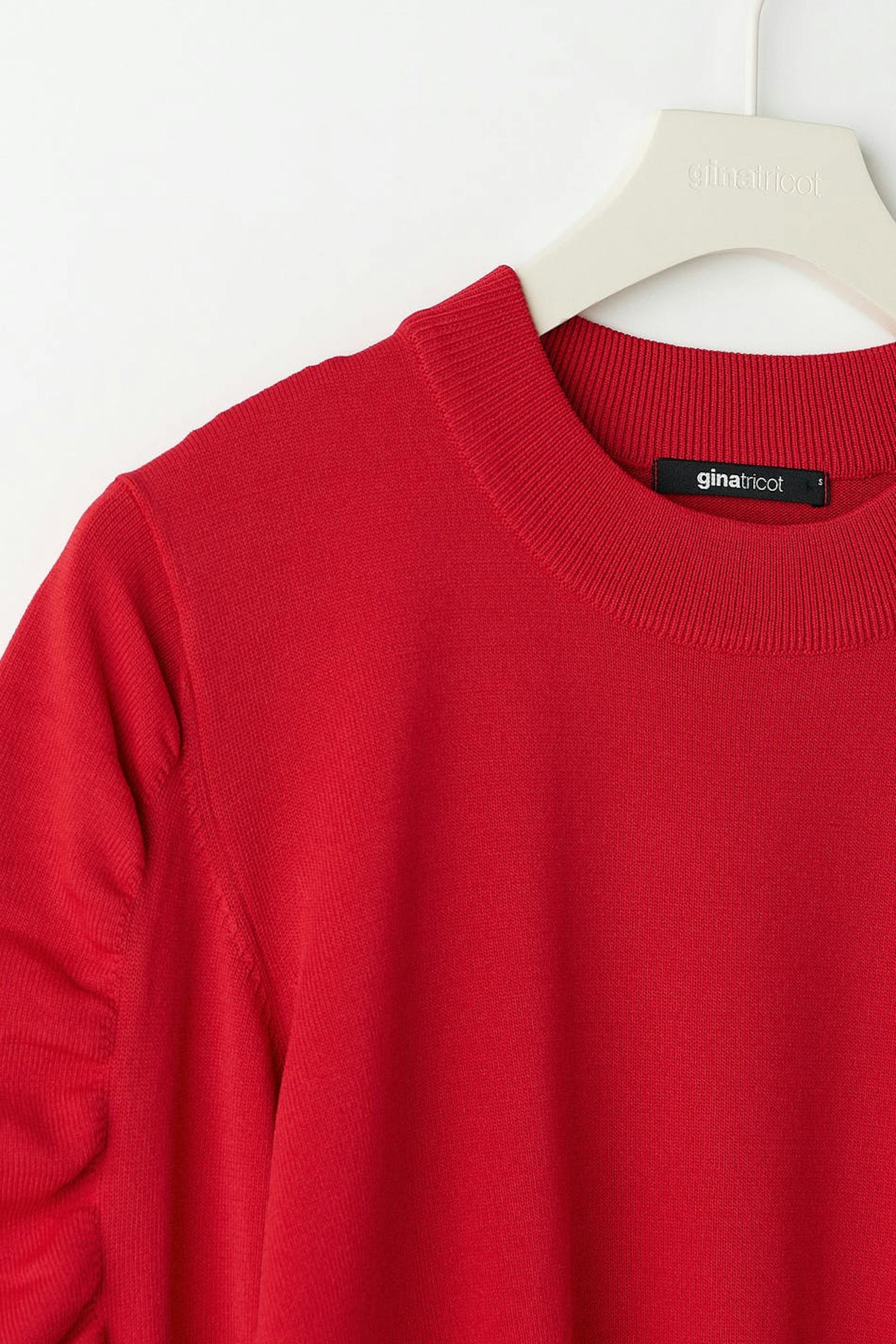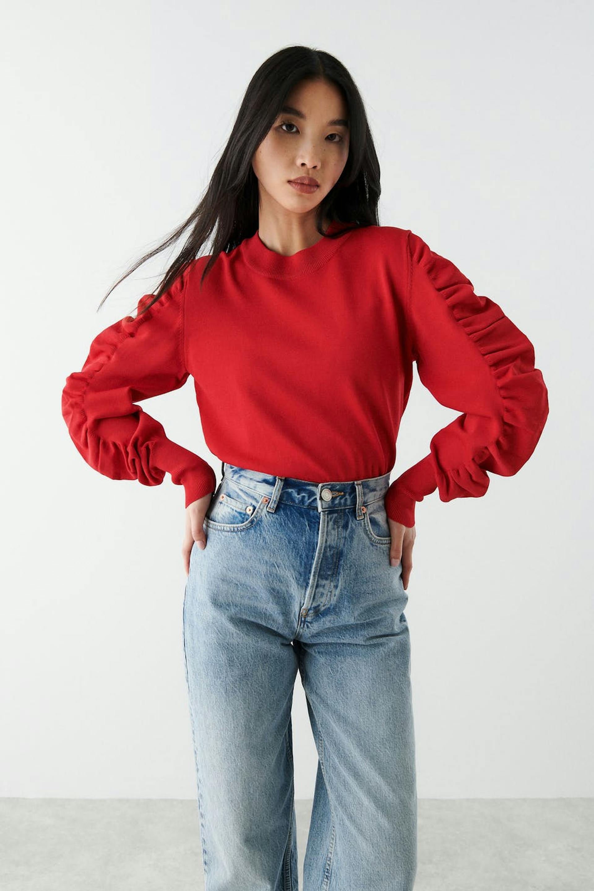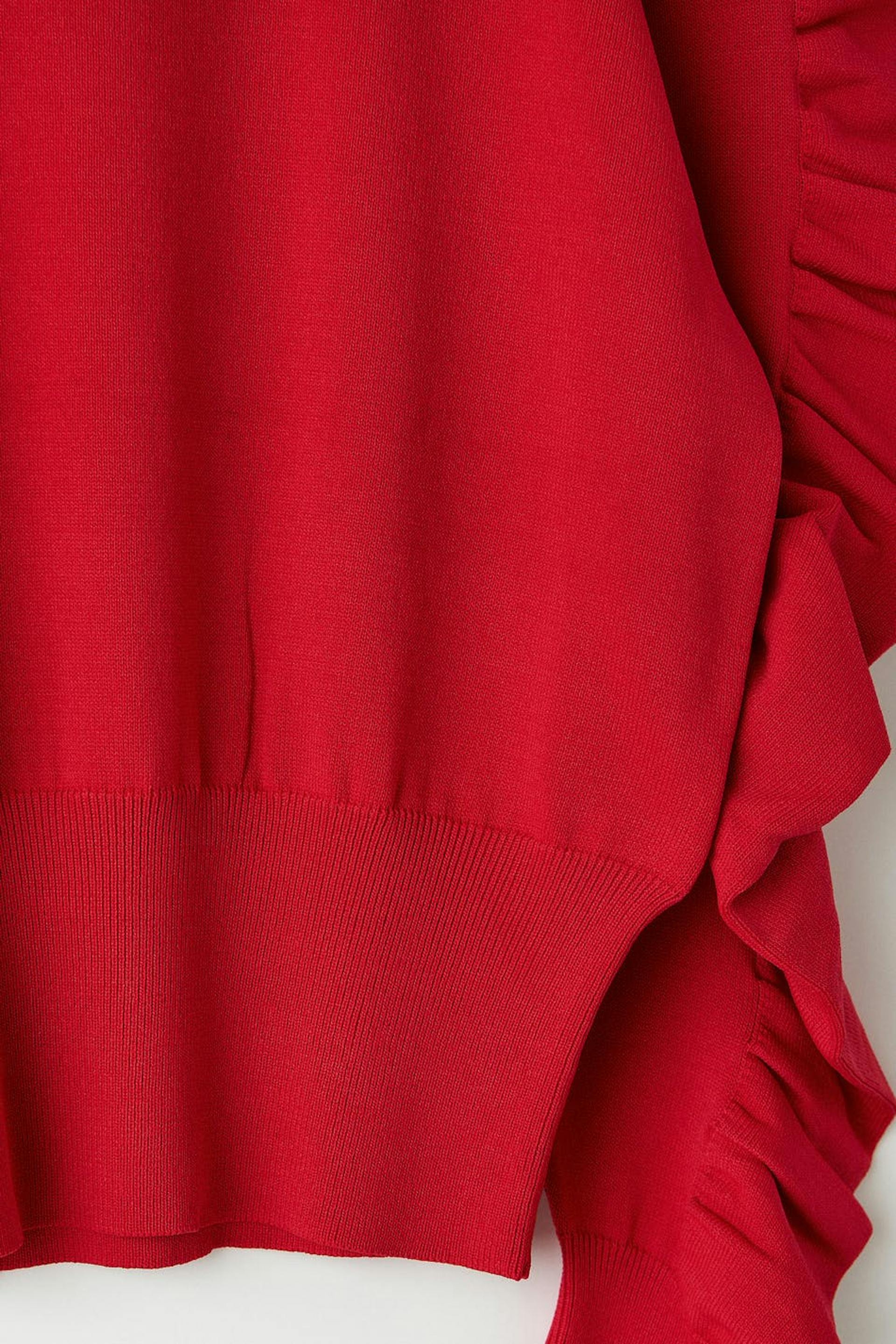 Gestrickter Pullover mit gerüschten Ärmeln. Der Pullover ist rot und hat eine boxy Passform. Er hat einen Rundhalsausschnitt und eine gerippte Manschette am unteren Saum und an den Ärmelenden.