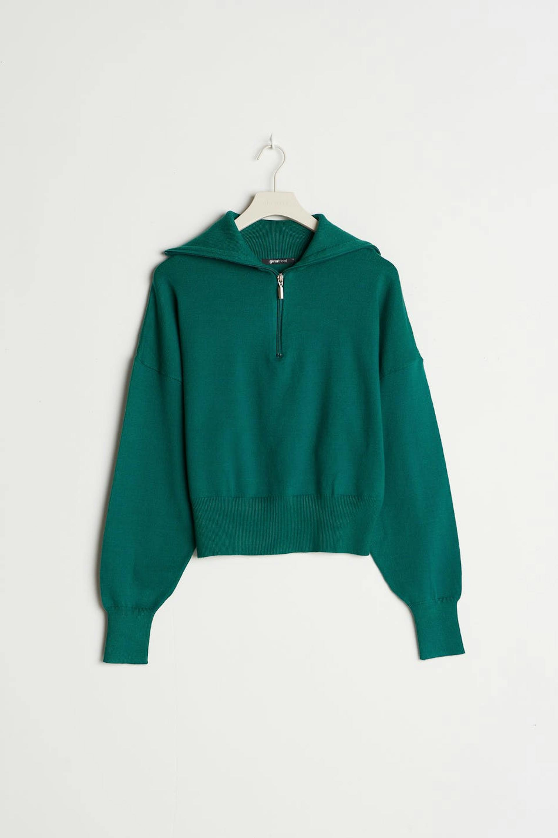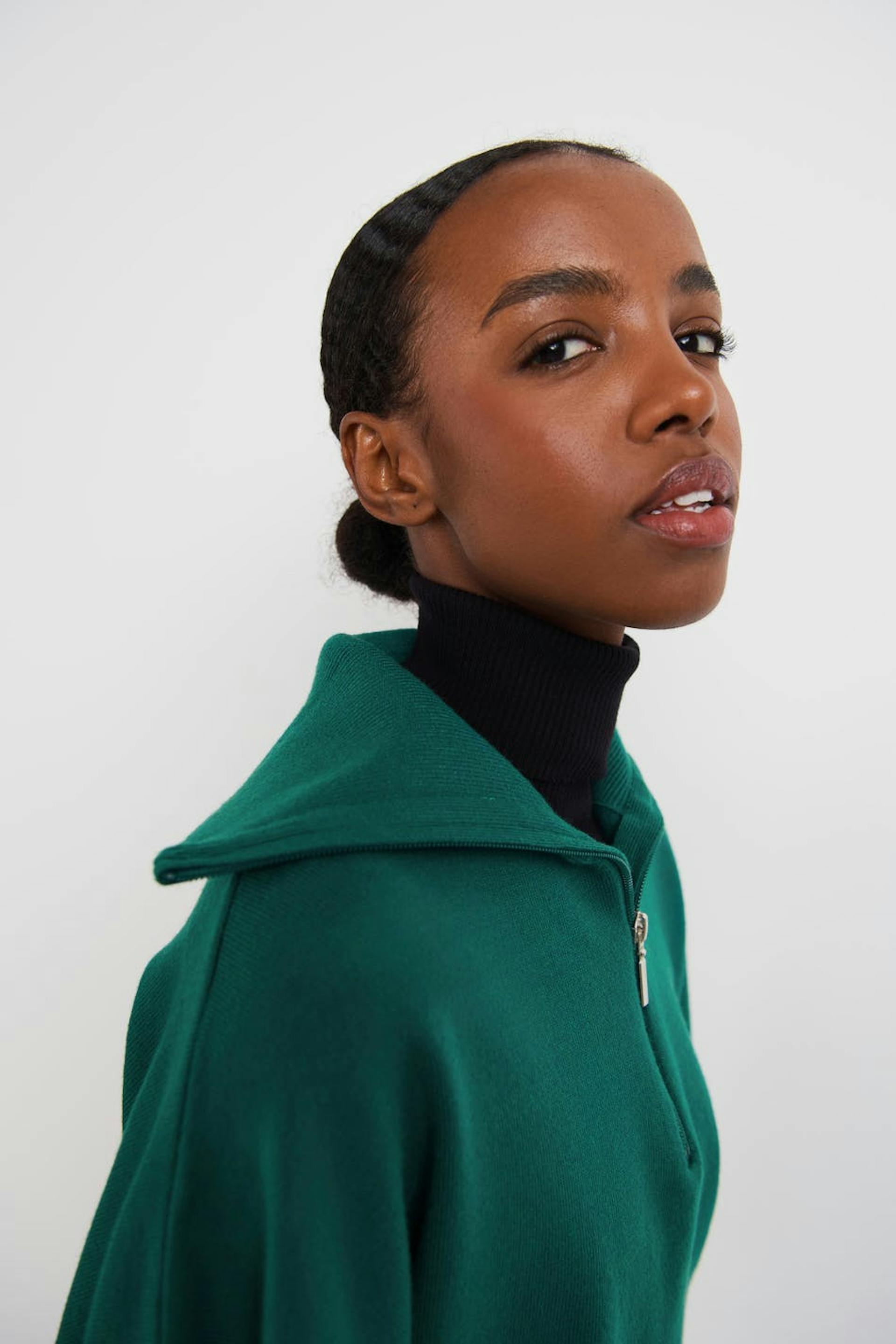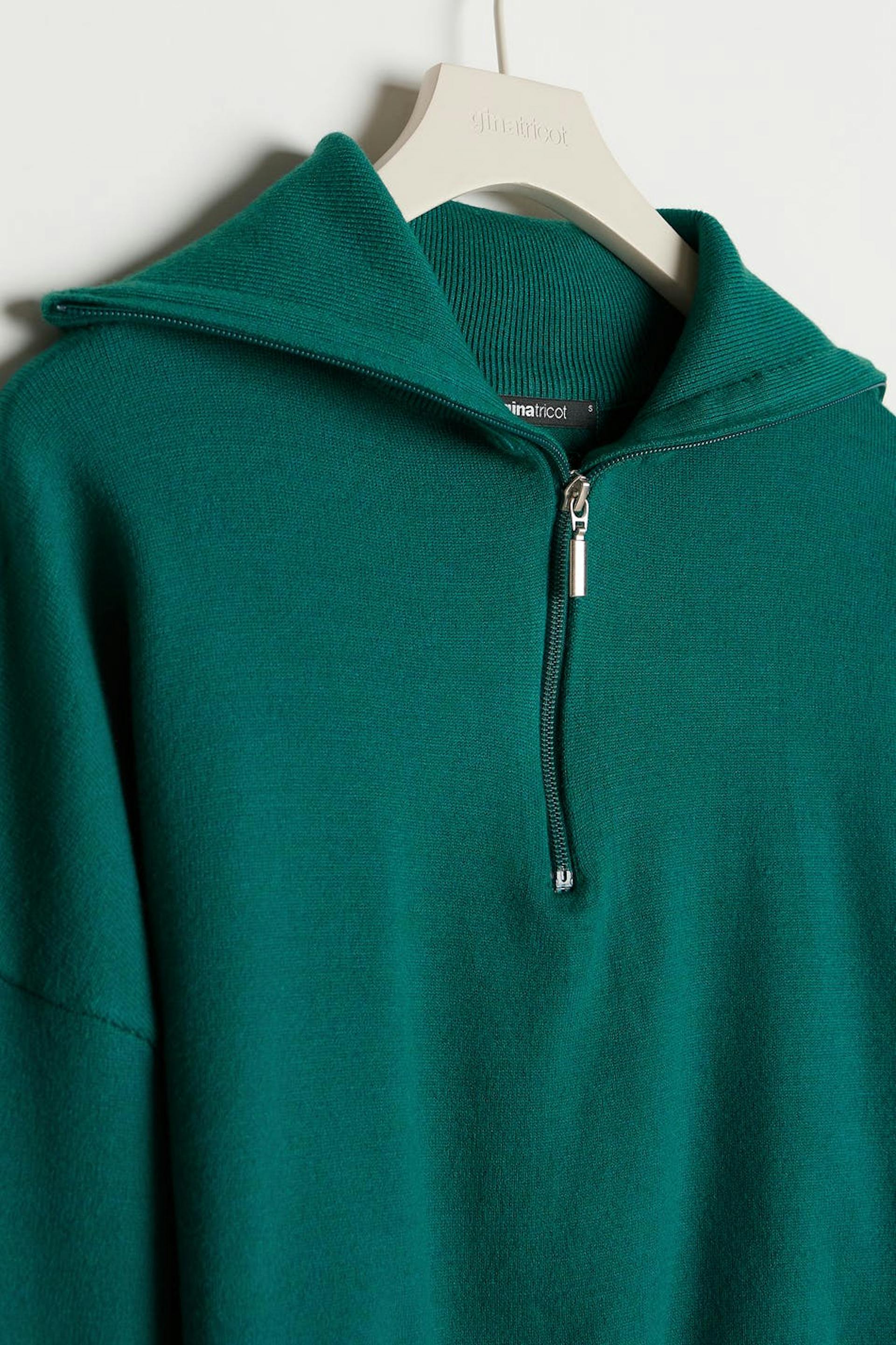 Gestrickter Pullover mit Rollkragen. Der Pullover ist grün und hat Drop-Schultern. Er hat einen halben Reißverschluss auf der Oberseite und eine breite, gerippte Manschette an den Ärmeln und am unteren Saum.
