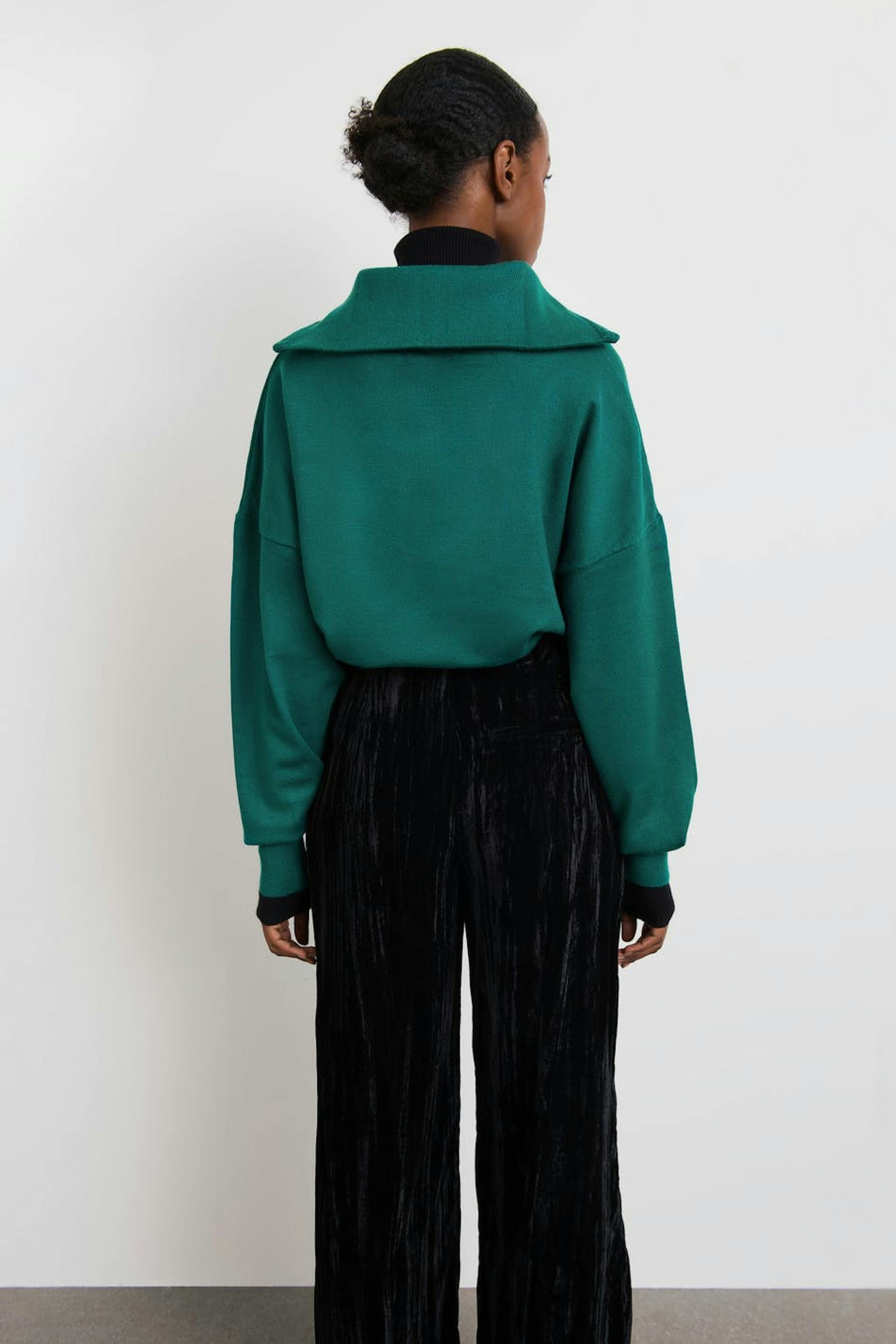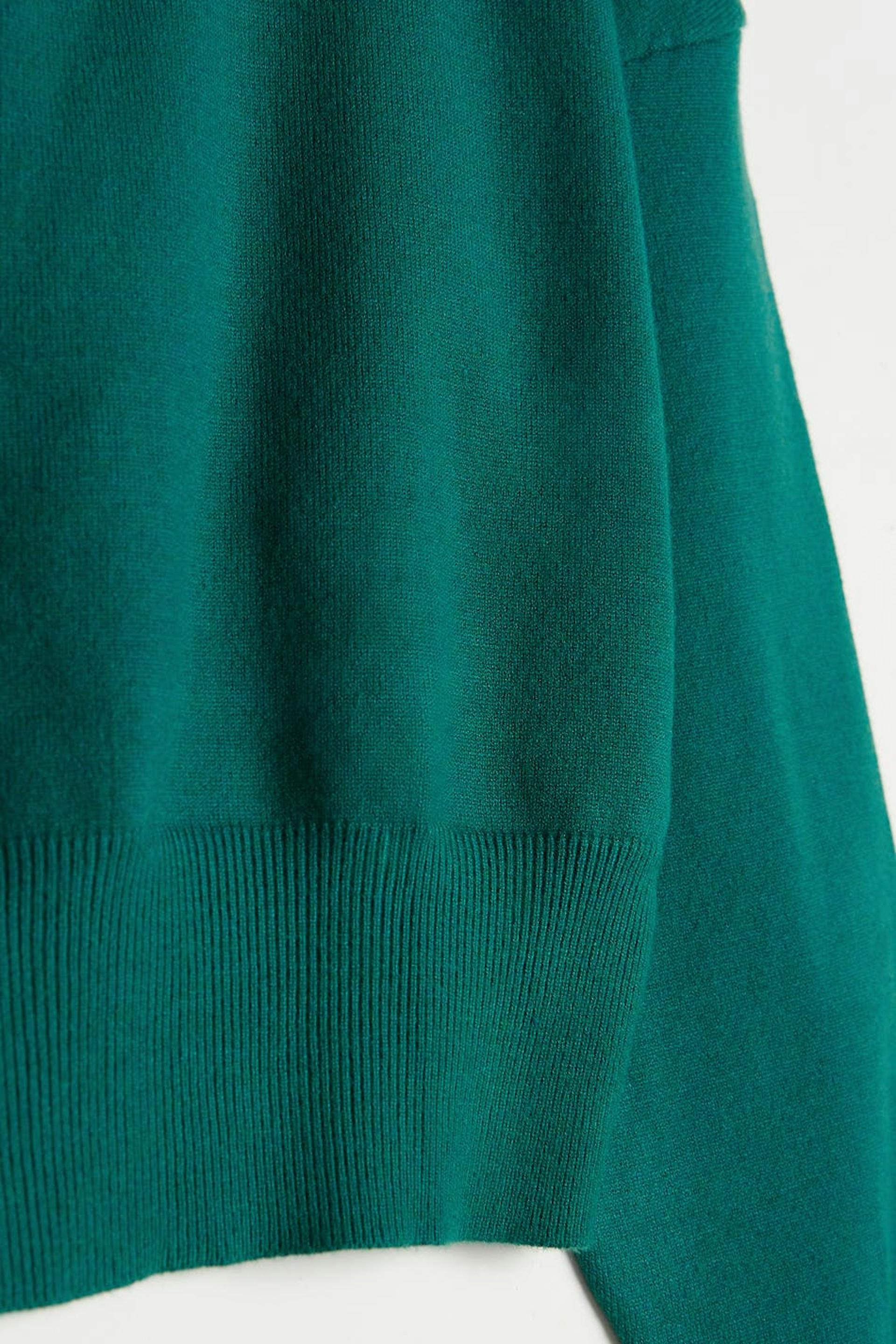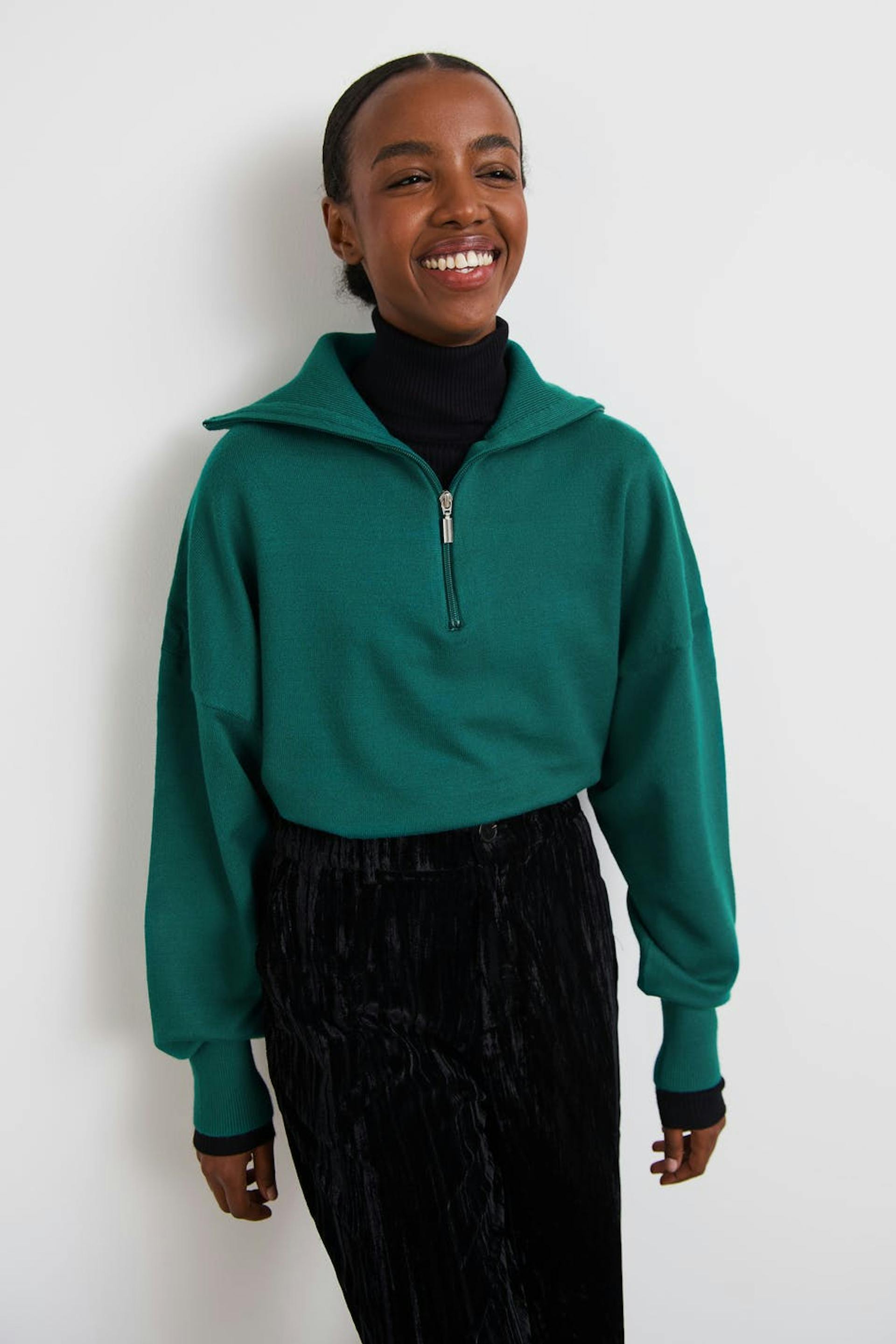 Gestrickter Pullover mit Rollkragen. Der Pullover ist grün und hat Drop-Schultern. Er hat einen halben Reißverschluss auf der Oberseite und eine breite, gerippte Manschette an den Ärmeln und am unteren Saum.