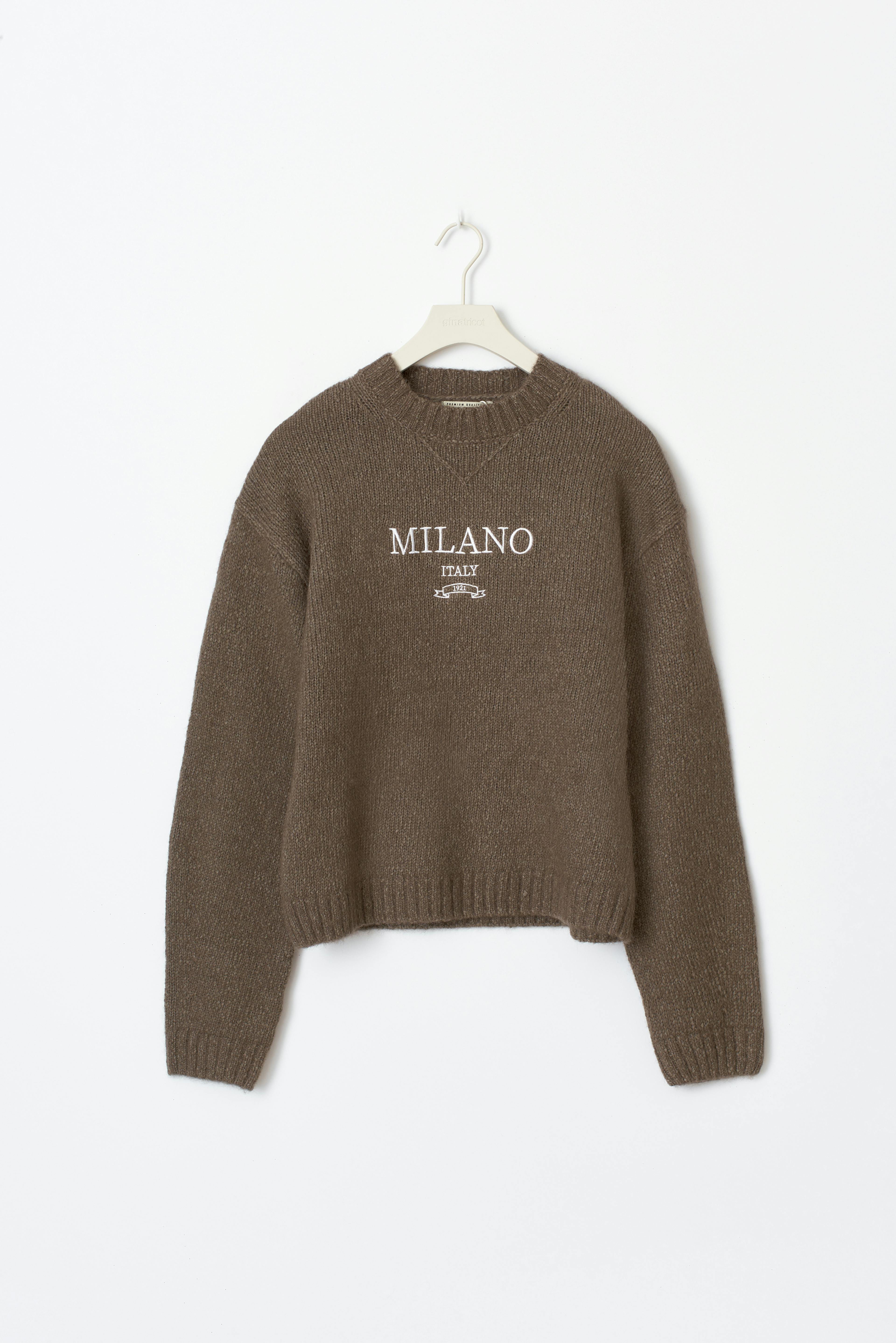Strickpullover aus Wollmischung mit Stickerei vorne. Der Pullover ist beige und hat Oversize-Passform. Er hat langen Ärmel, Rundhalsausschnitt und Rippenstrick an den Ärmelenden und an der Unterkante.
