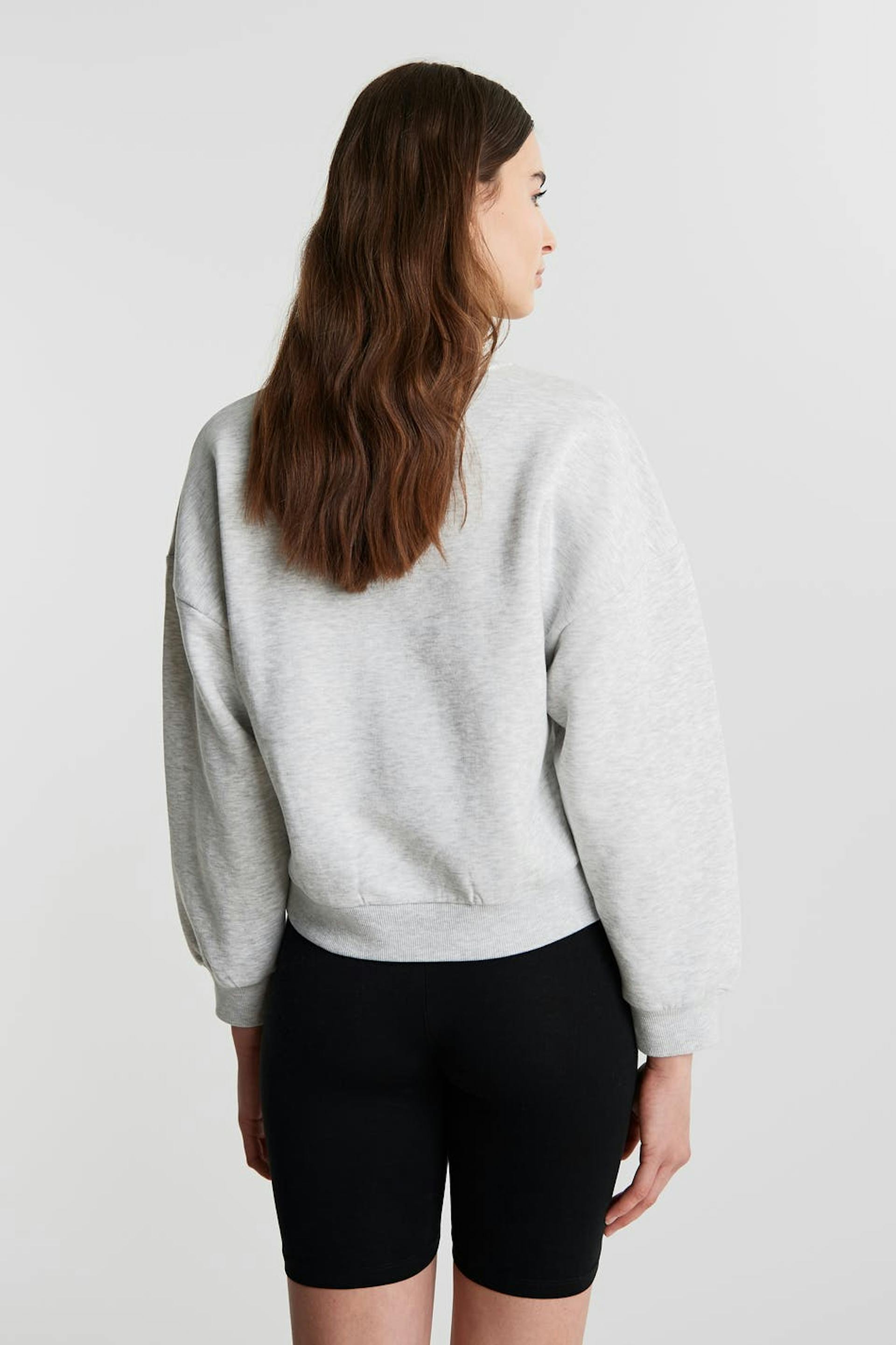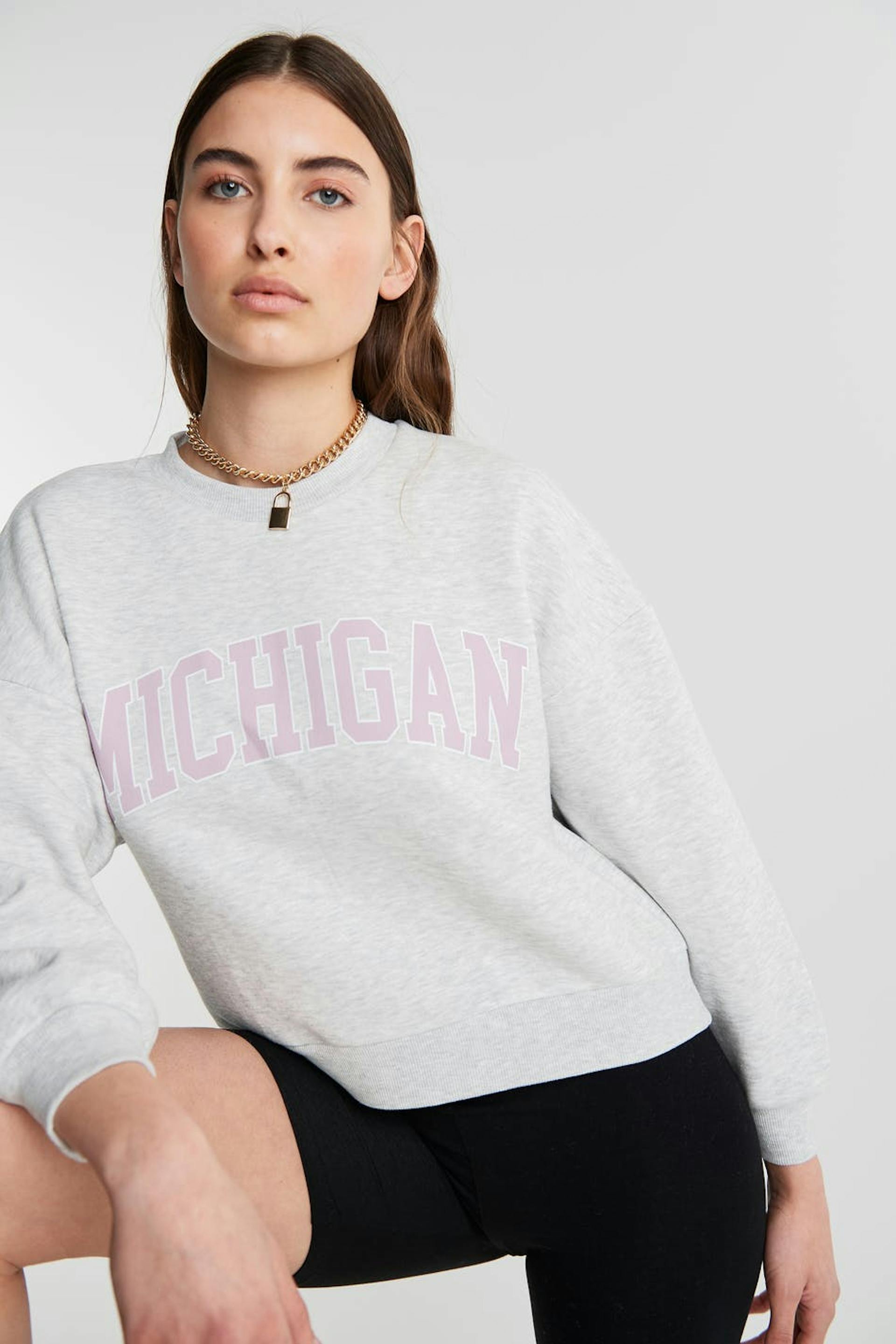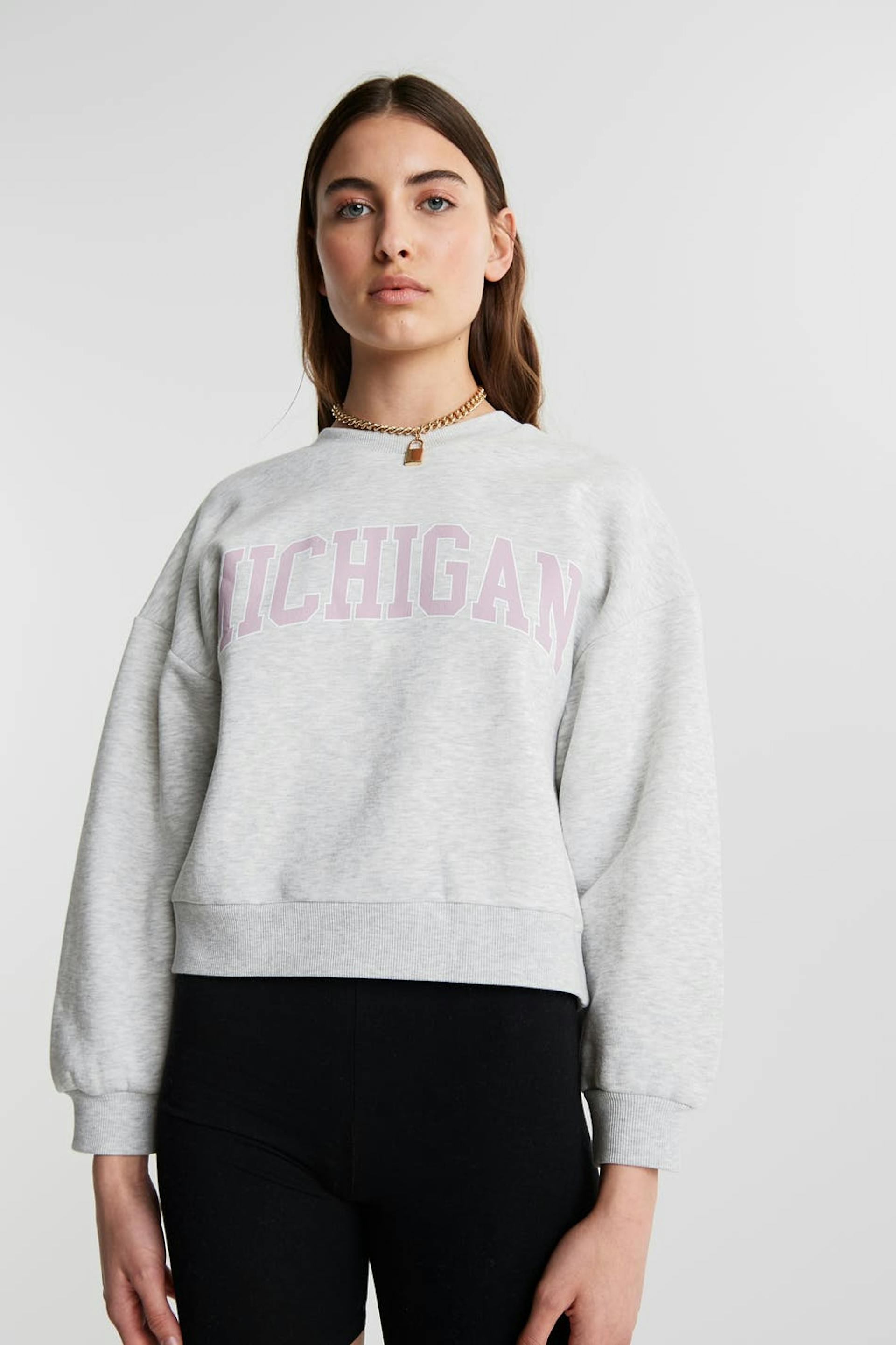 Langärmliges Sweatshirt mit einer Oversize-Passform. Das Sweatshirt ist grau und hat einen Druck auf der Vorderseite.