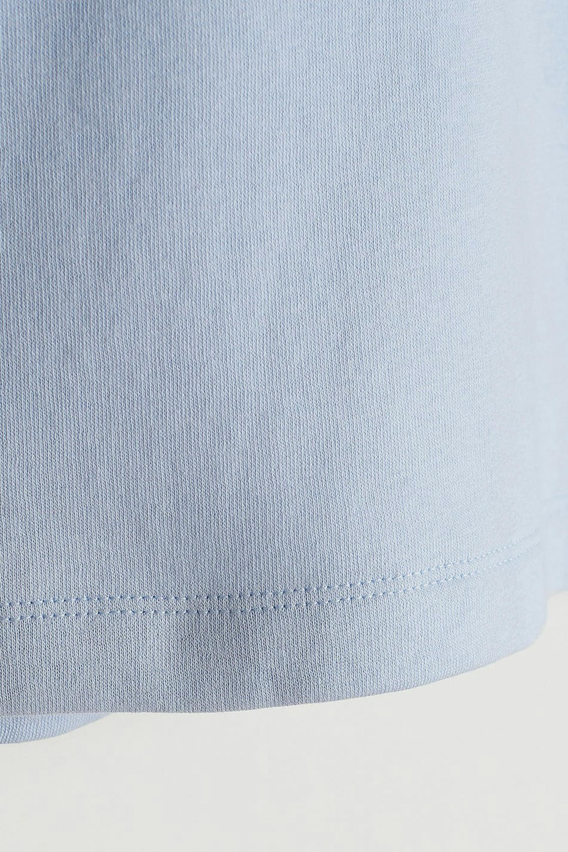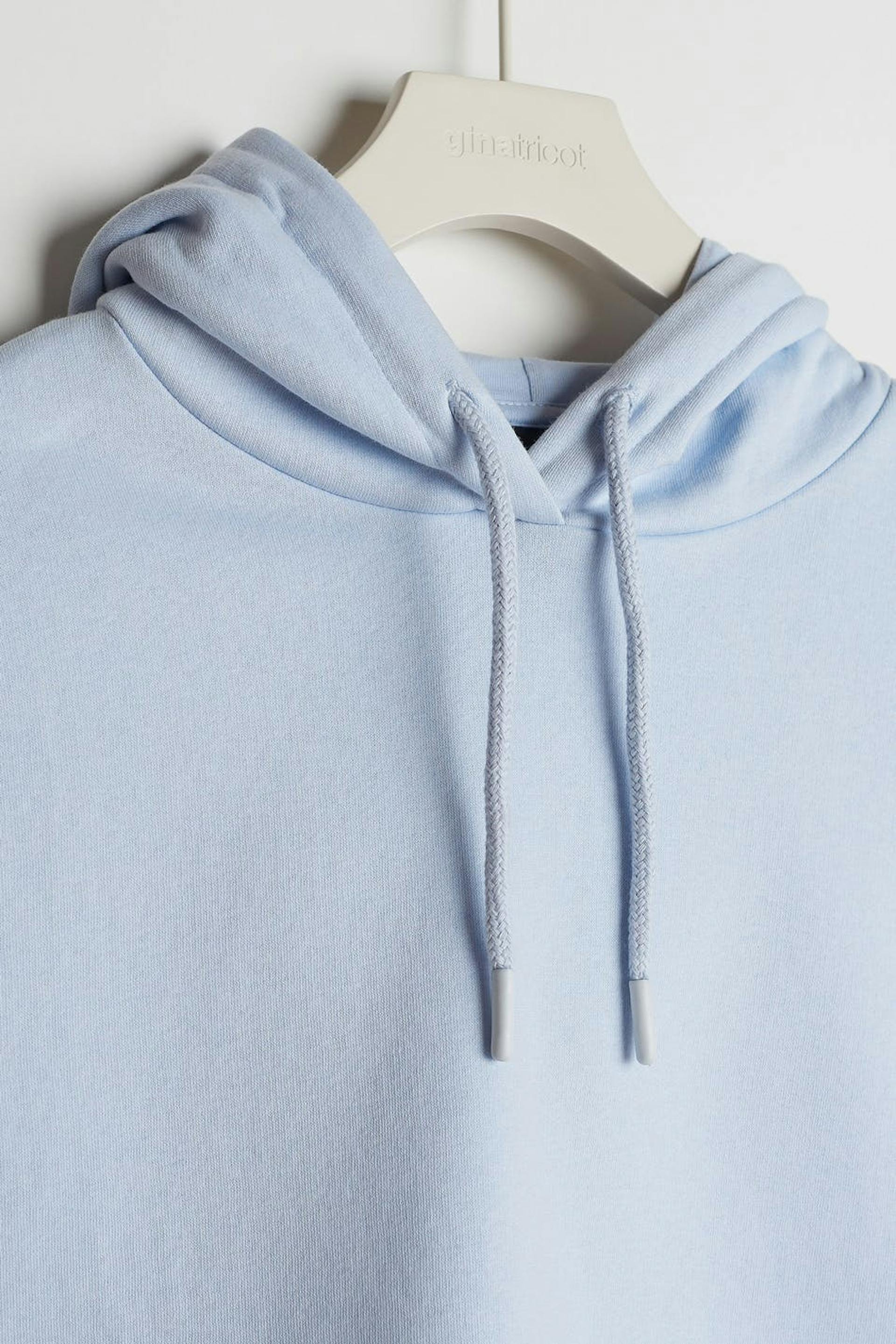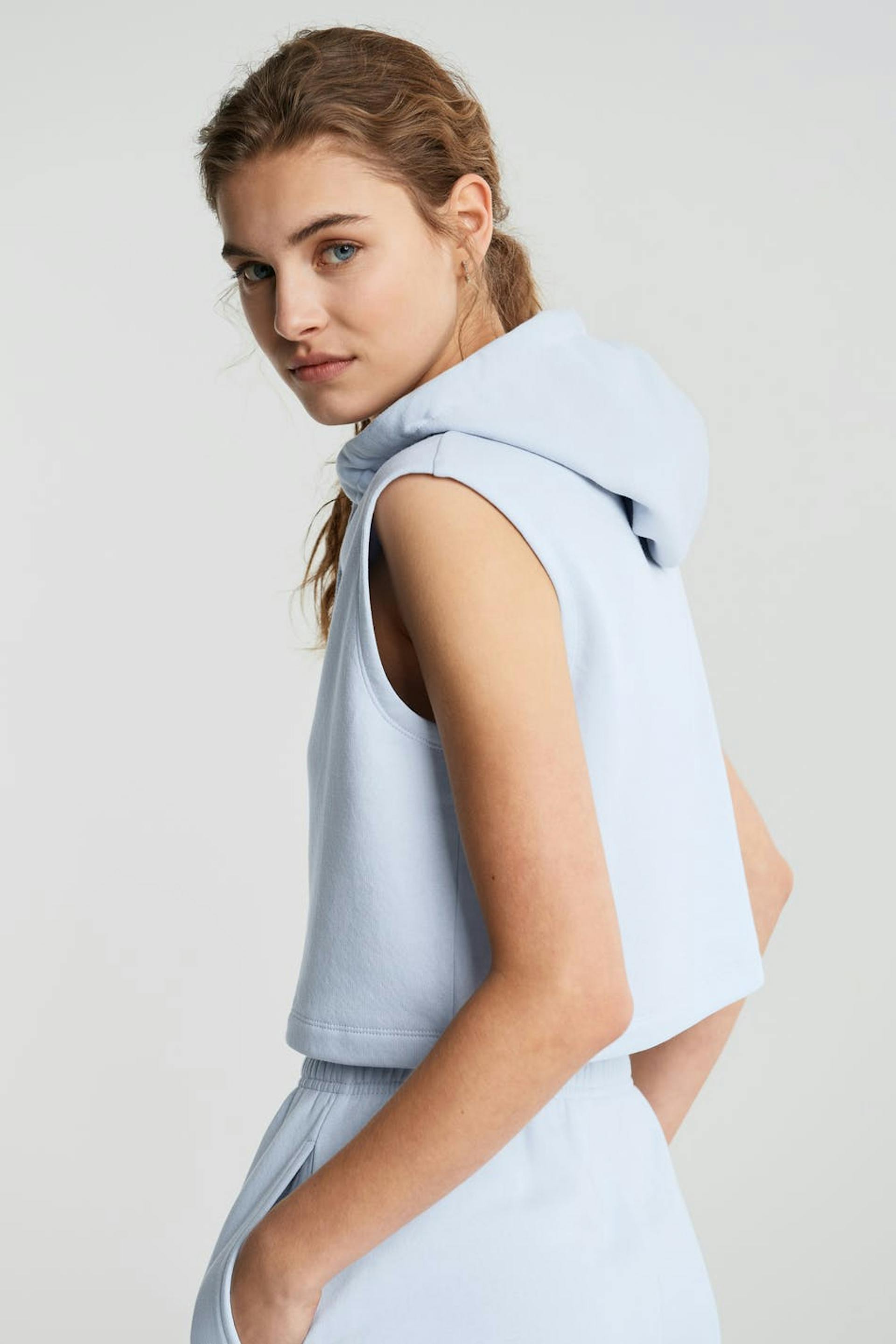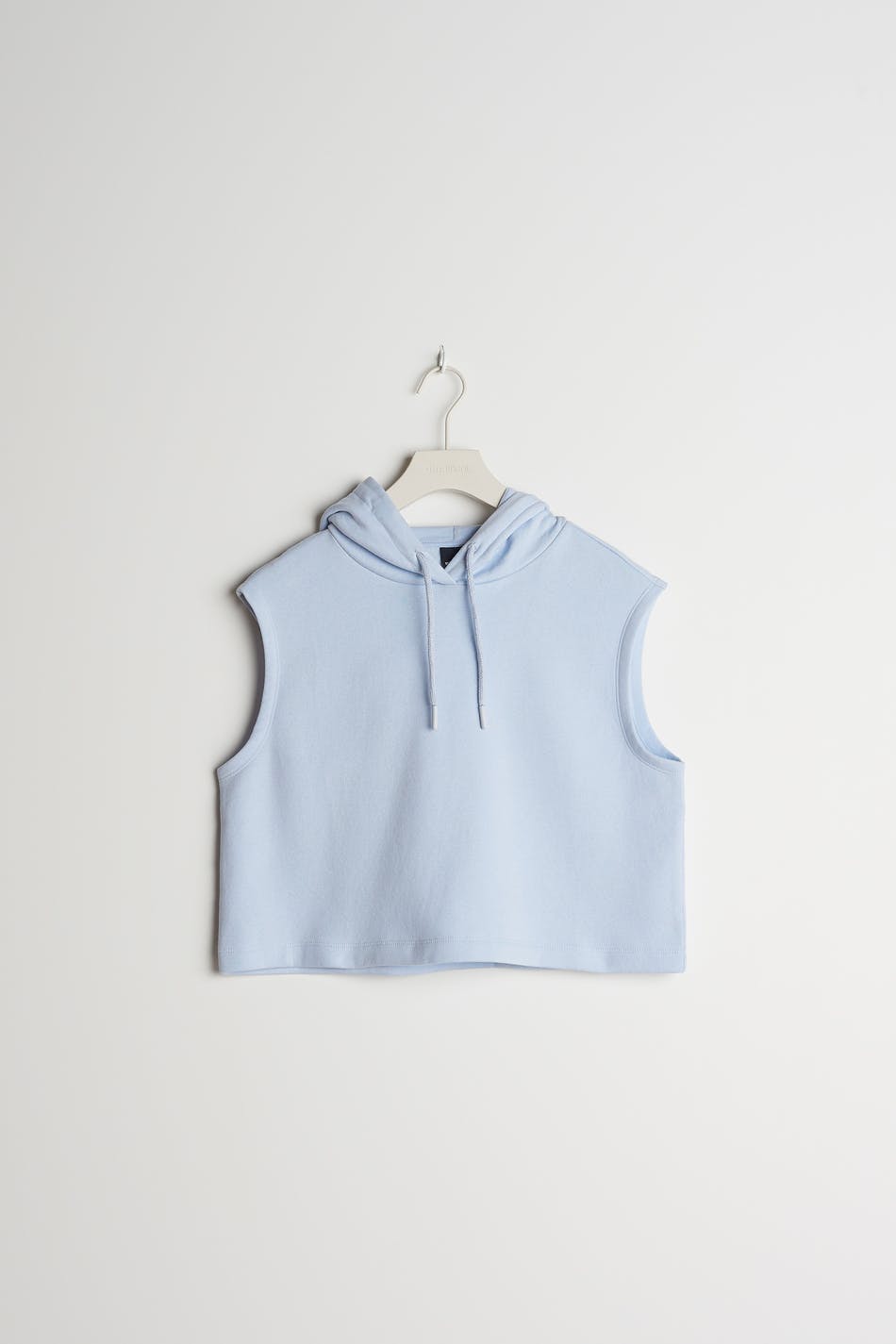 Ärmelloser Hoodie mit einer taillierten Passform. Der Hoodie ist blau, abgeschnitten und gefüttert. Er hat eine Kapuze mit einem Kordelzug.