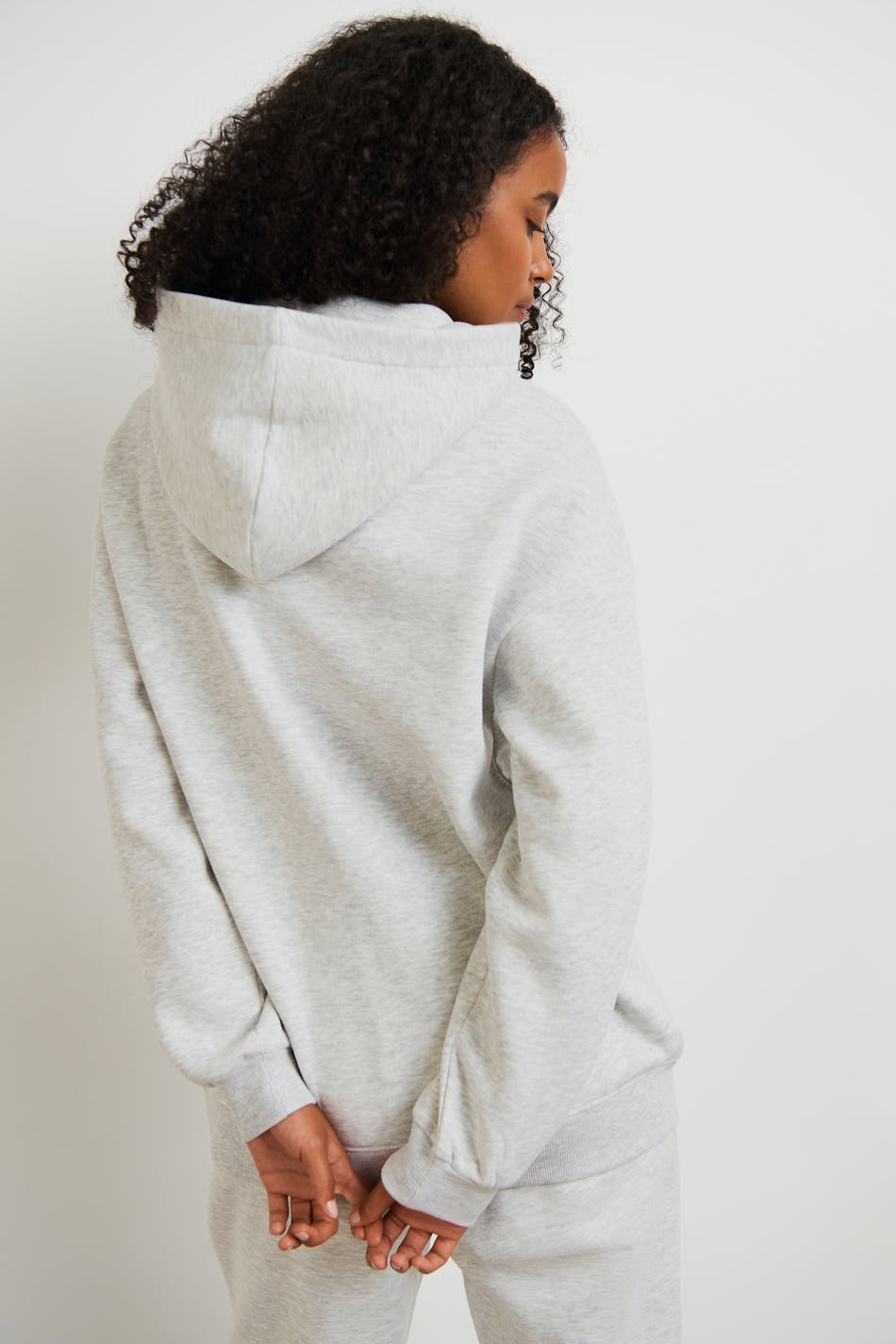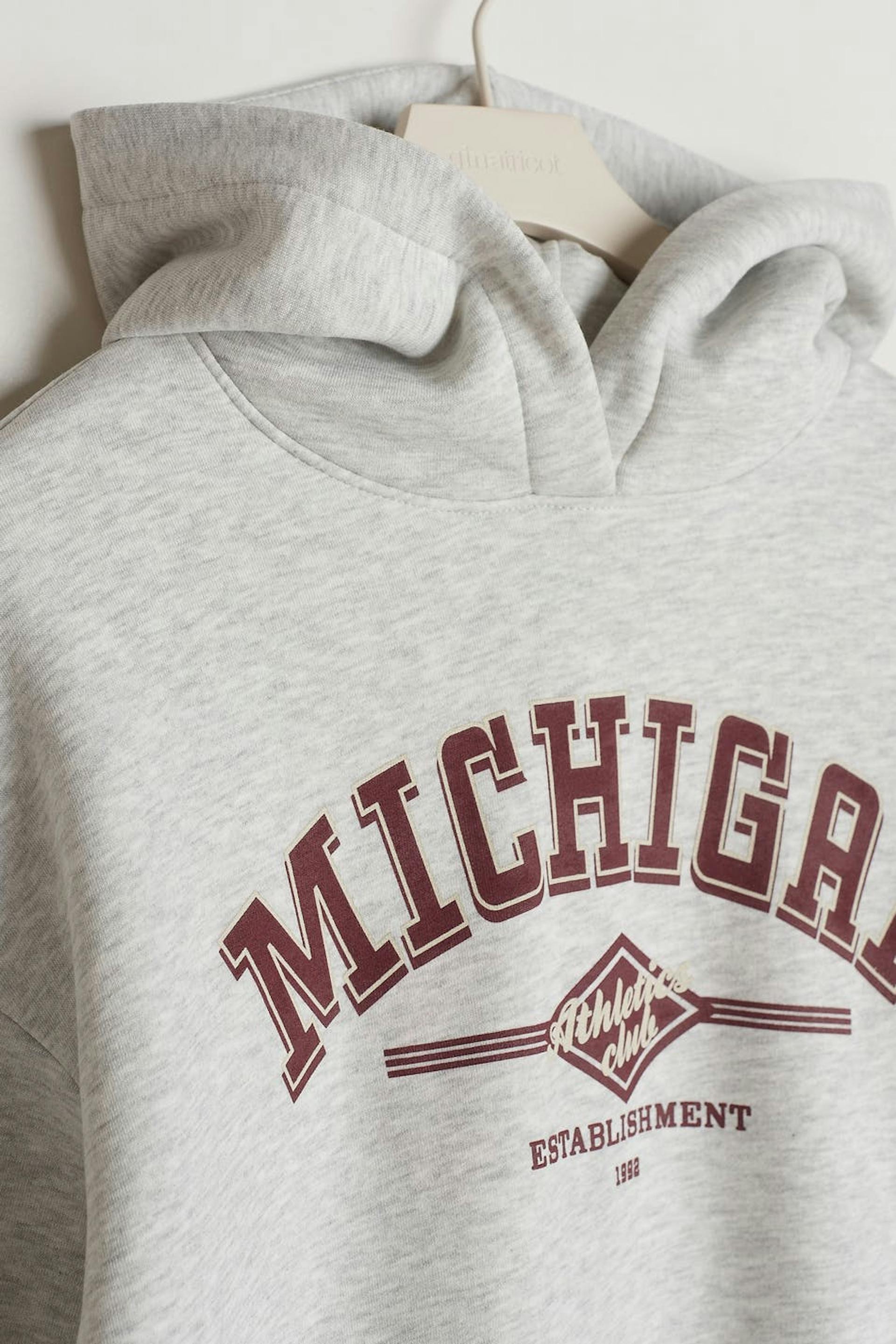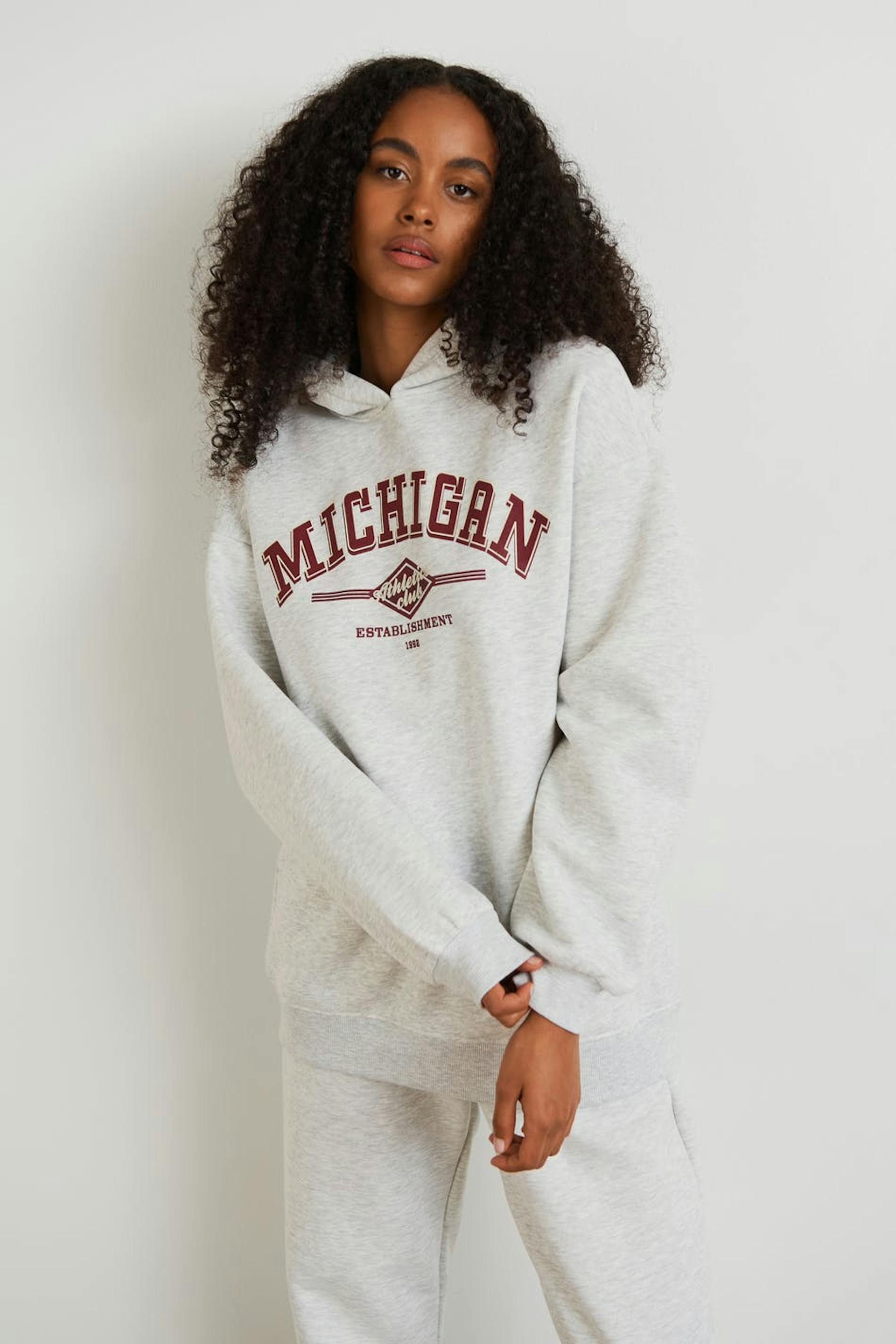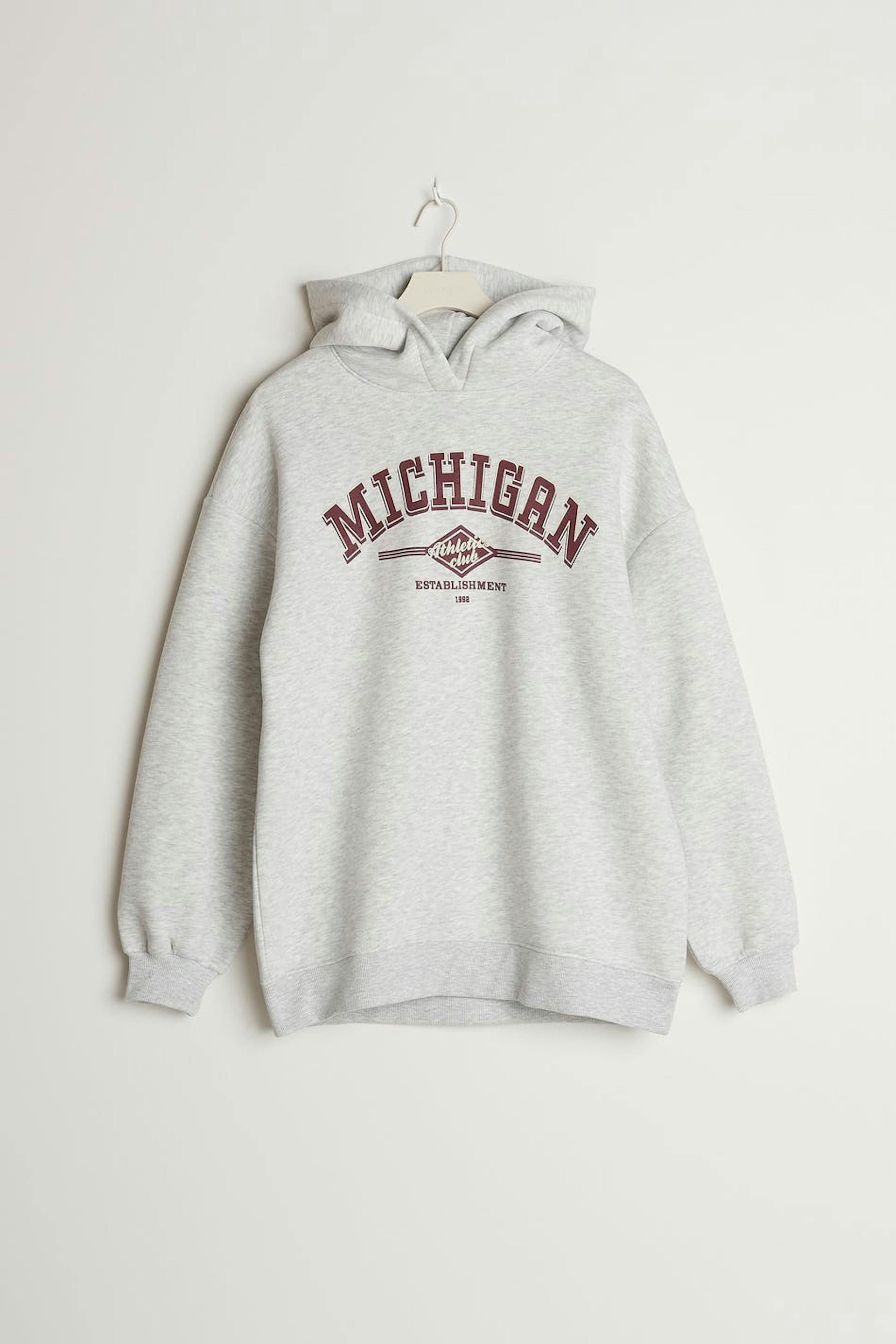 Hoodie mit einer Oversize-Passform. Der Hoodie ist grau und hat einen Druck vorne. Er hat eine Kapuze, Drop-Schultern und eine gerippte Manschette an den Ärmelenden und am unteren Saum.