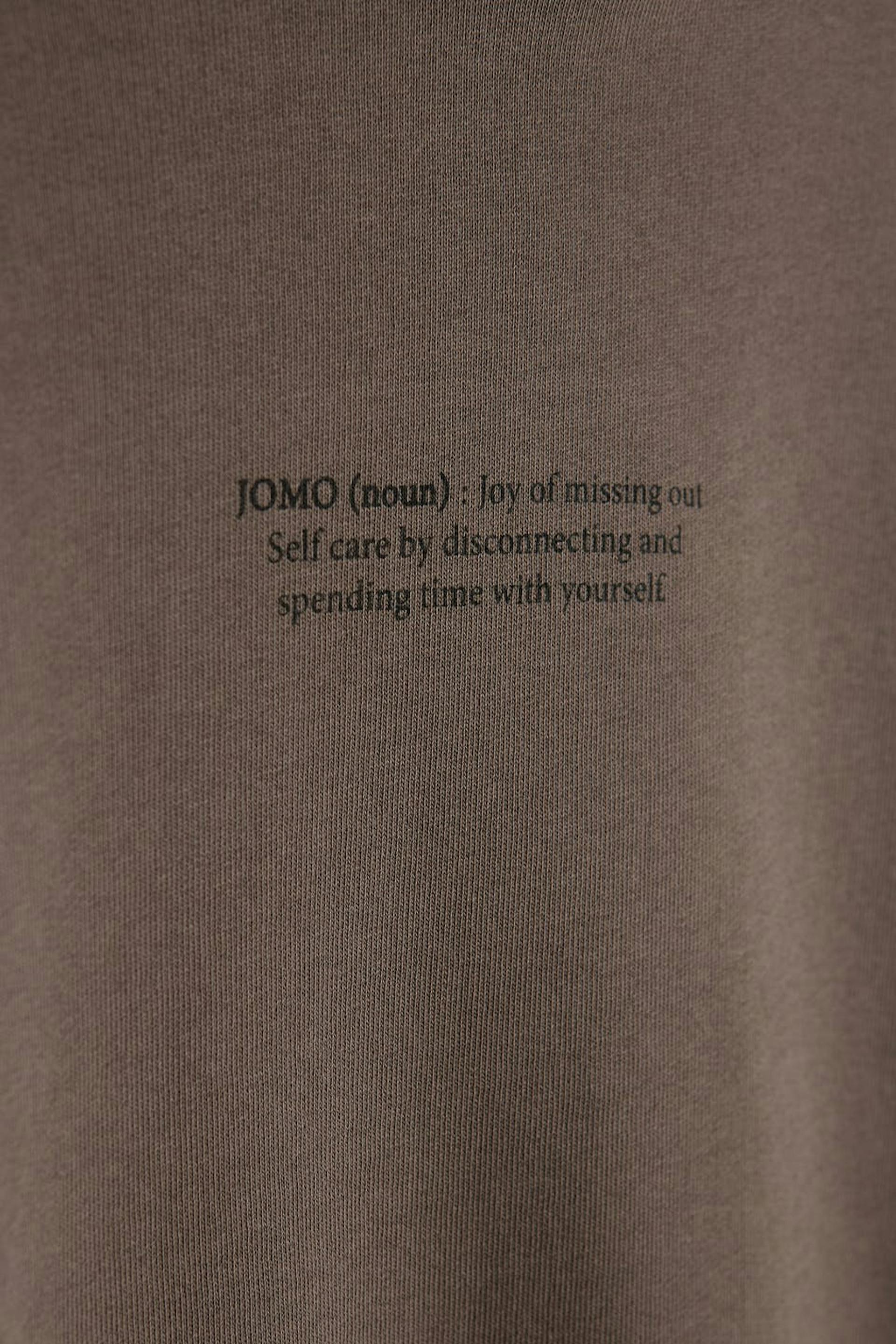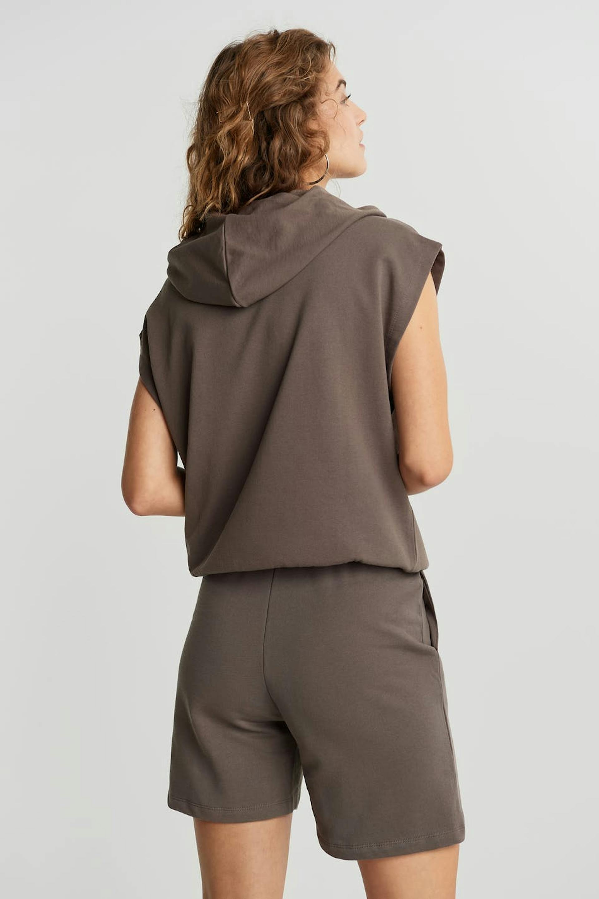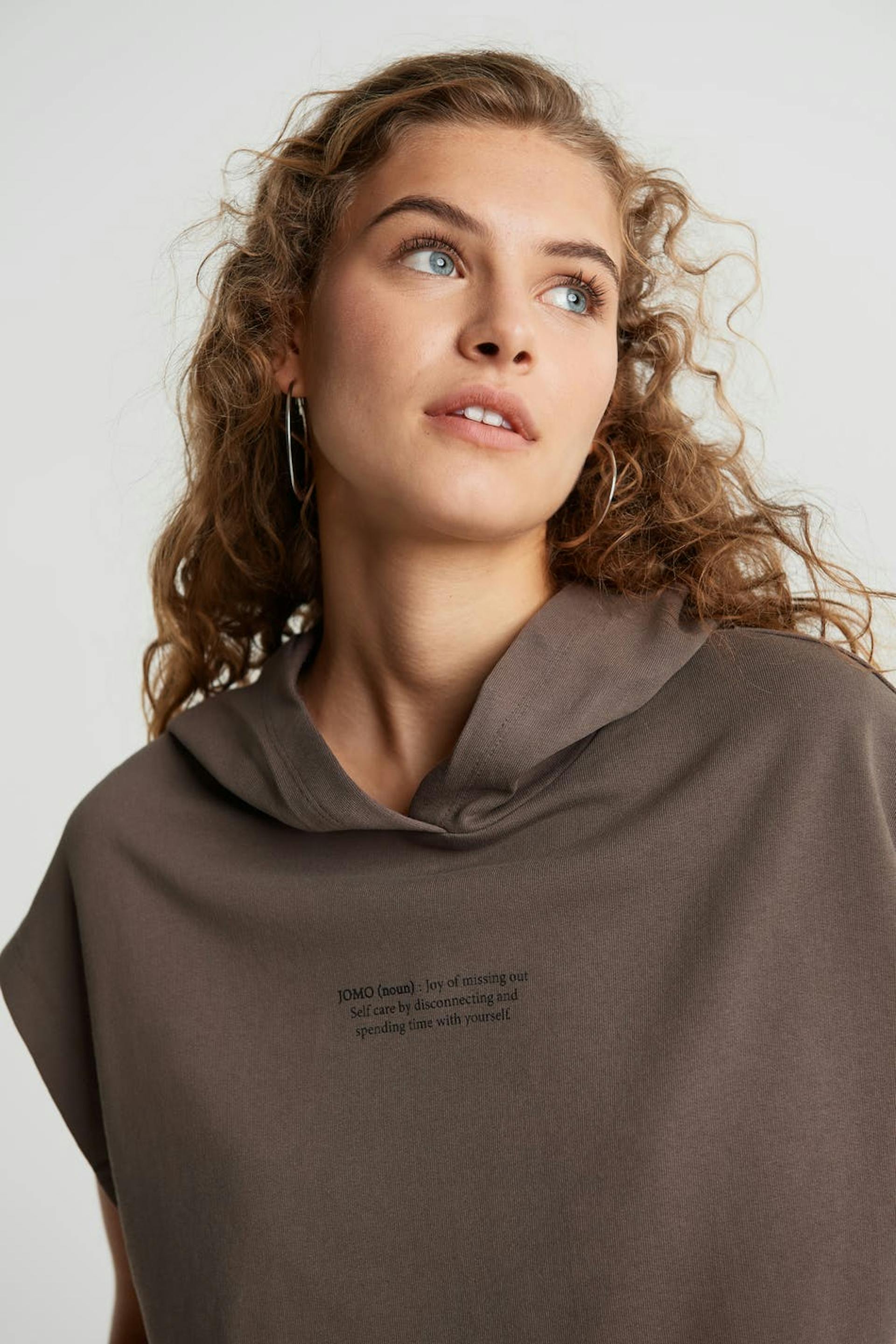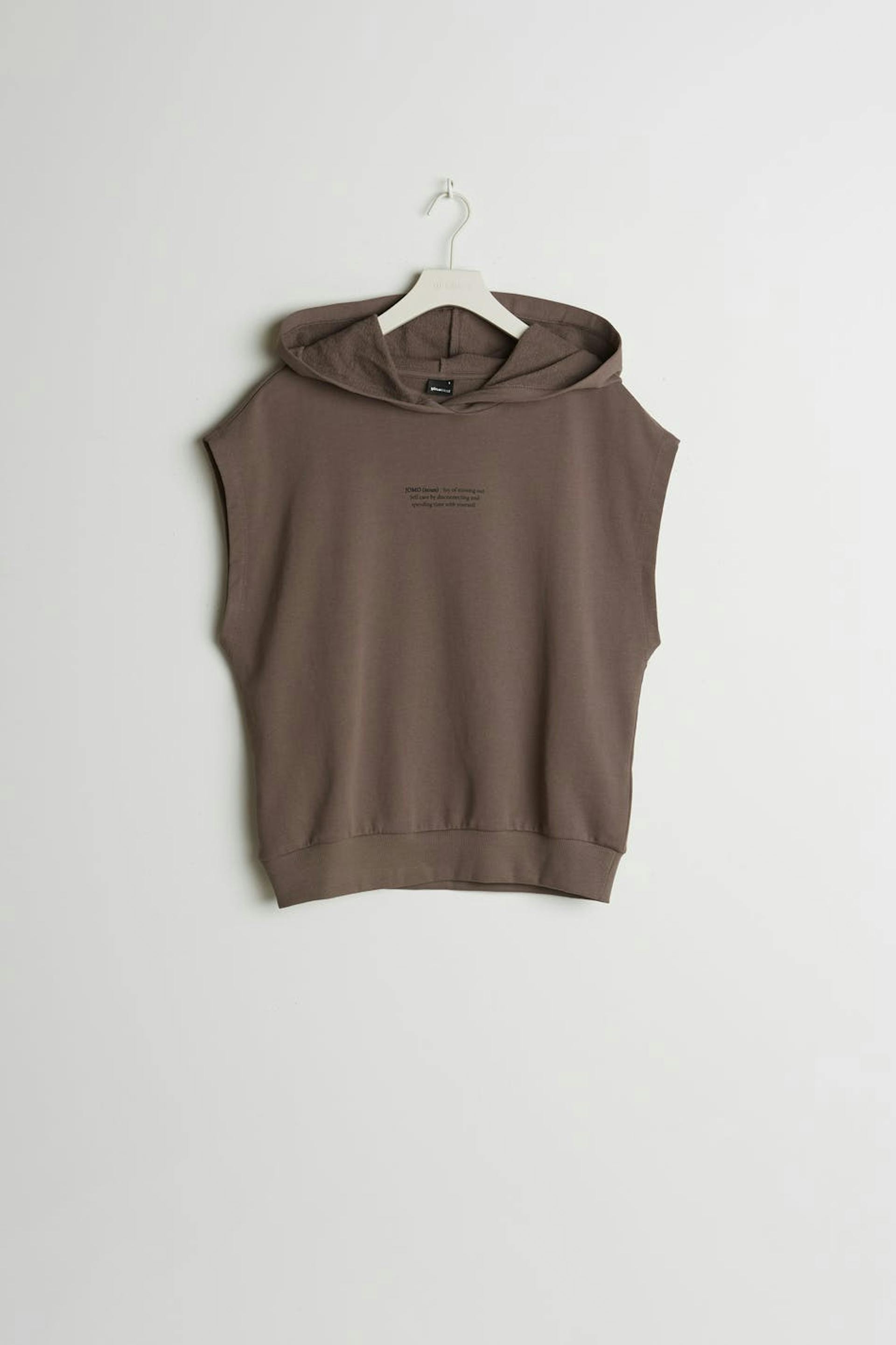 Ärmelloses Sweatshirt mit einer Kapuze. Das Sweatshirt ist braun und hat einen Druck auf der Brust.