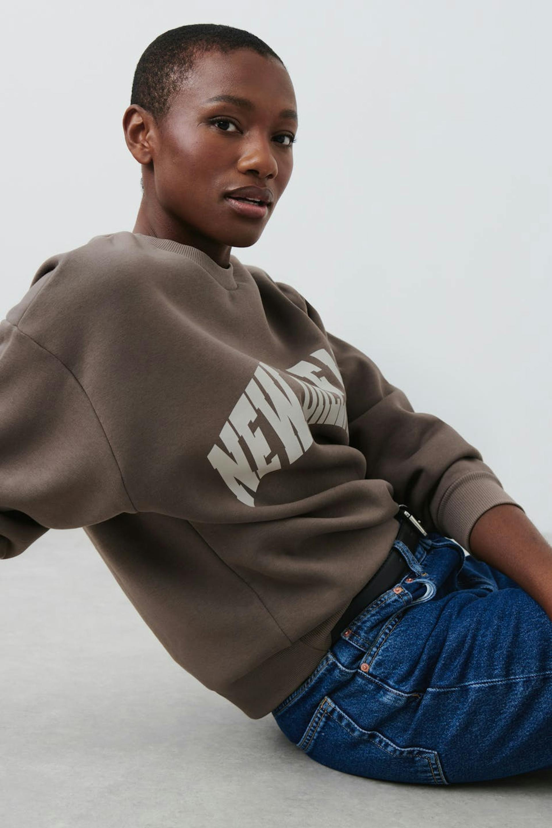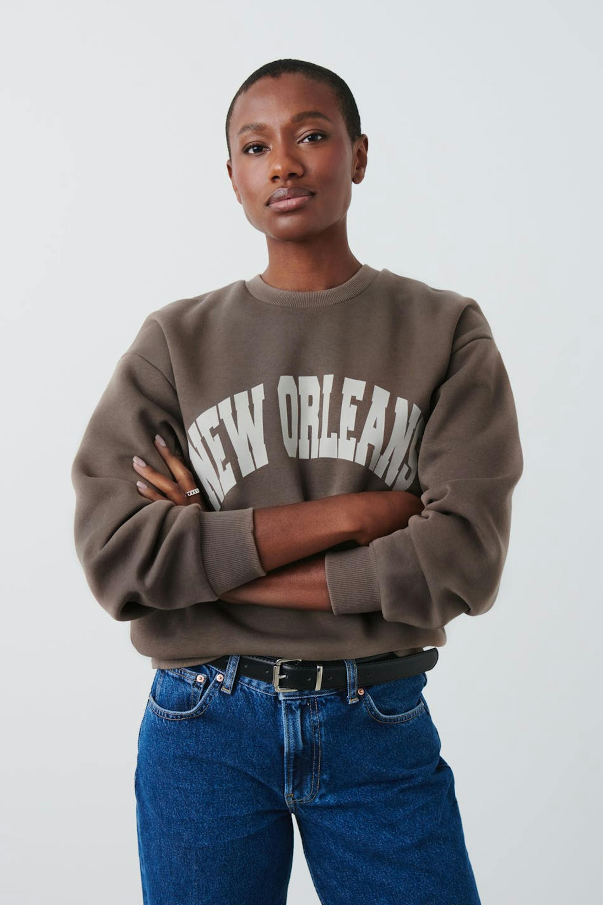 Sweatshirt mit Druck vorne. Das Sweatshirt hat Rundhalsausschnitt. Es hat Bündchen an den Ärmelenden und am unteren Saum.